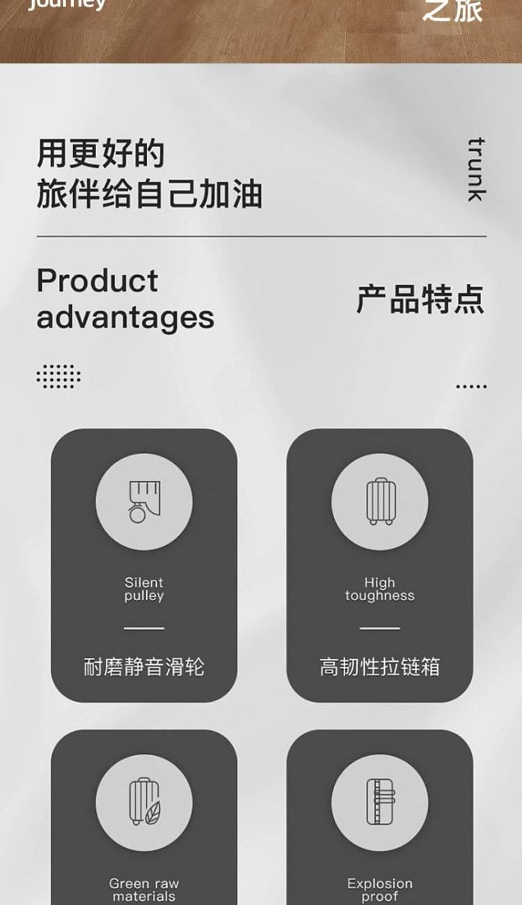 产品型号:HYX9002-20 产品重量:2.65kg 产品规格:20英寸 产品颜色:黑色 产品卖点:德国拜耳PC材质,质地轻盈,高耐热、抗冲击、阻燃、刚硬、柔韧(可踩、摔不变形),犹如护盾般保护着箱内物品; 耐用塑胶提手,柔软触感,温柔接触; 360°万向四轮静音轮,32万米负重测试; 优质铝合金加厚航空级抗压拉杆; 通过拉杆震荡、翻滚撞击、负重角轮耐久度、防锈、防水等各项测试。
