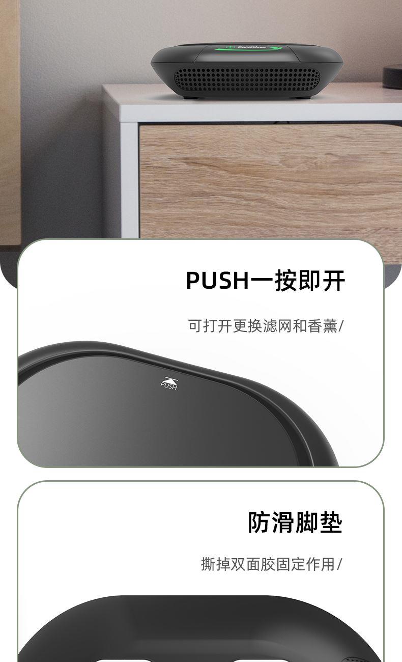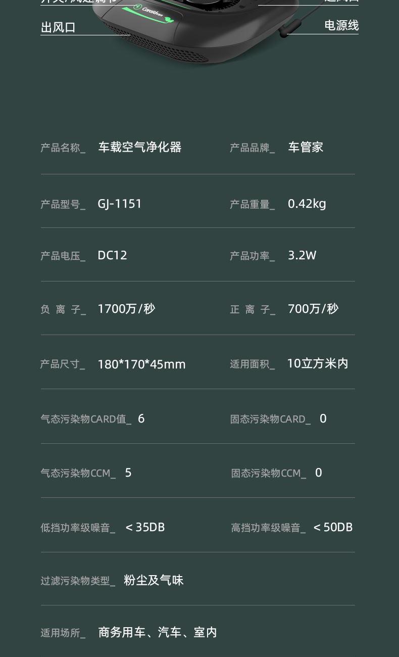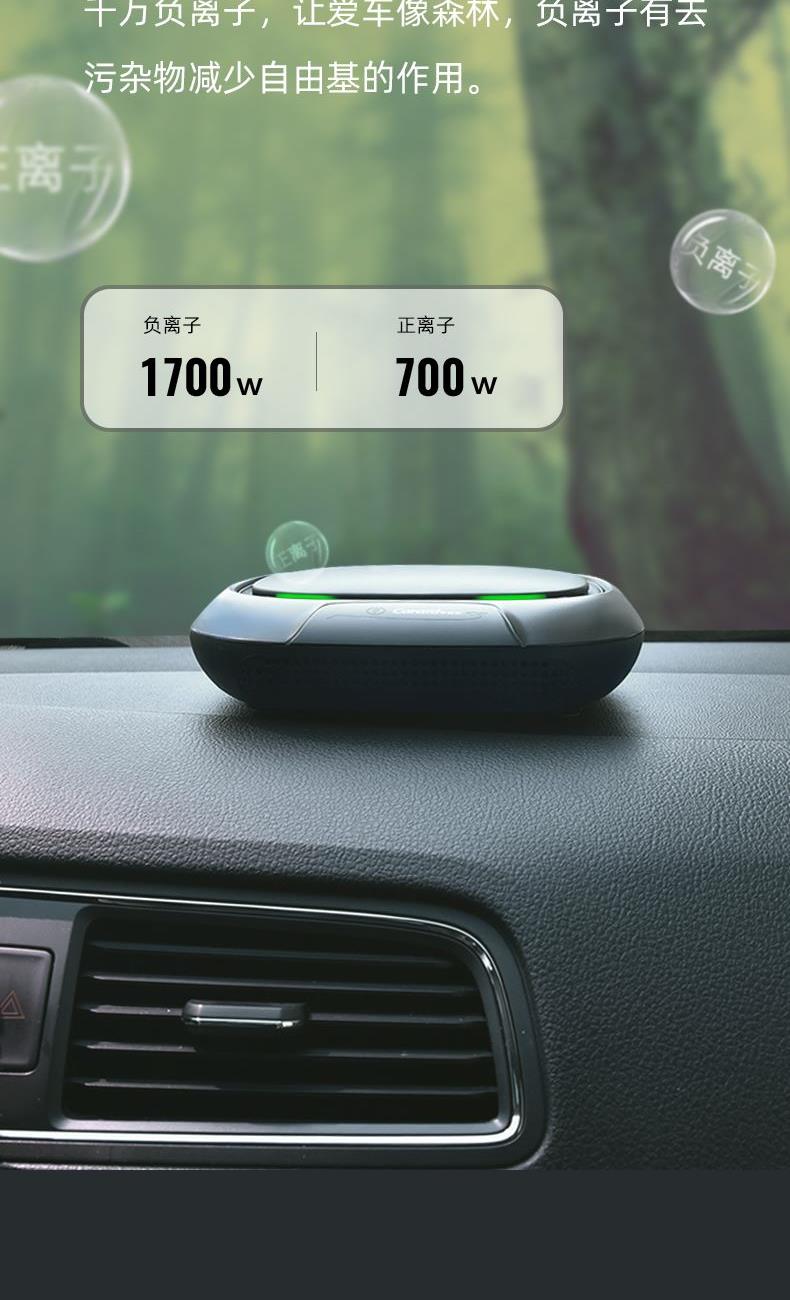 "1、ABS外壳,浑然一体机身; 2、一机多用,除醛,降霾,去味;3、HEPA高精度循环净化,过滤微小颗粒物(PM0.5); 4、三层复合过滤网,迅速净化;5、360度立体环绕进风口,蜂窝网状出风口,空气智能传感器;6、采用椰壳活性炭,约10倍去甲醛效果;7、内置香薰盒,RESET复位键; 8、额定电压:DC12V,额定功率:3.2W,正离子:700万/秒,负离子:1700万/秒,噪音:小于50dB(A)"