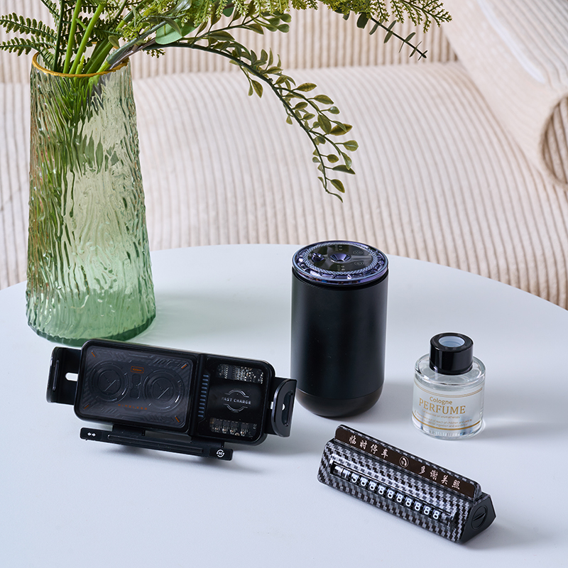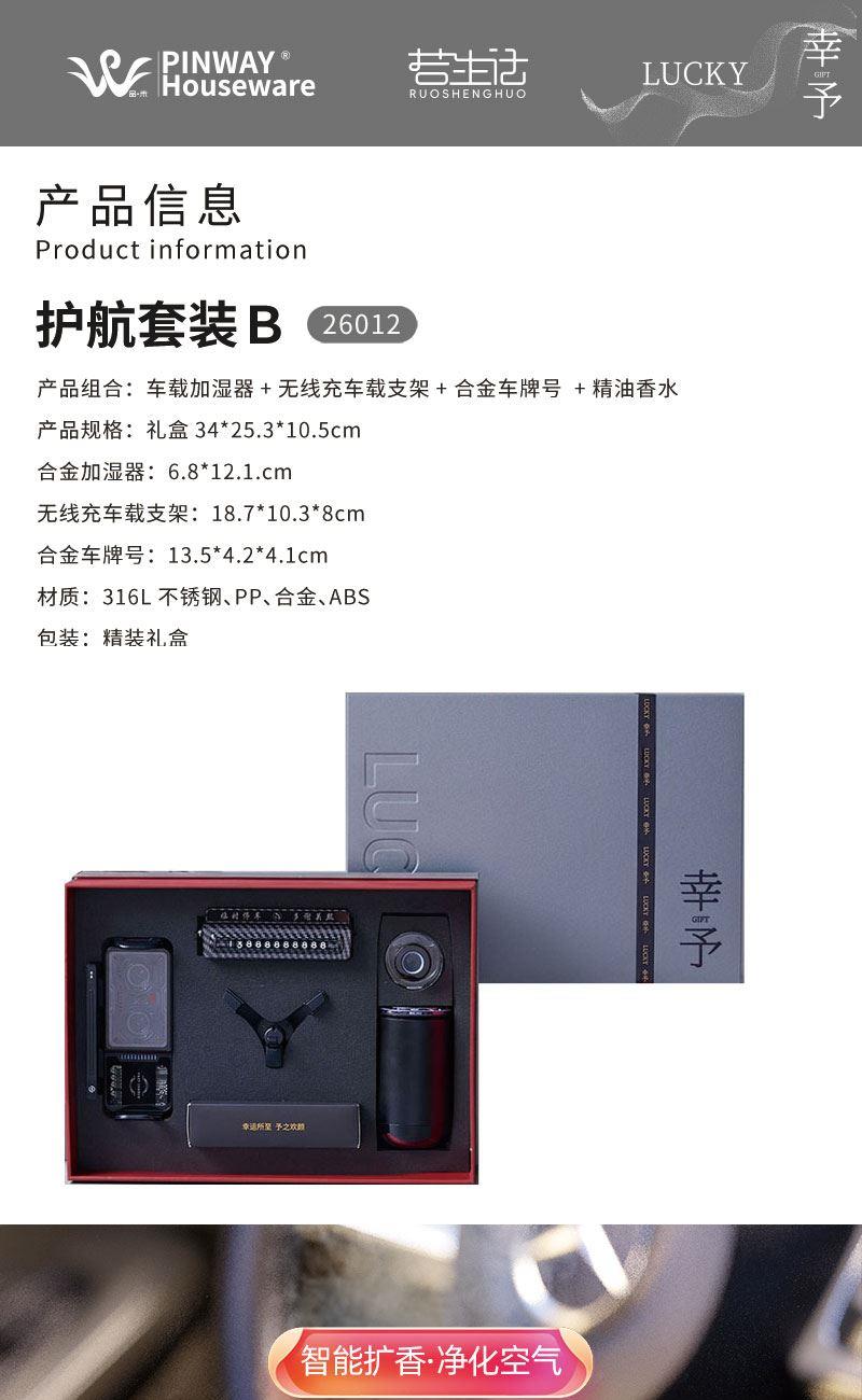 产品组合:车载加湿器+无线充车载支架+ 合金车牌号 +精油香水 产品规格:礼盒34*25.3*10.5cm 合金加湿器:6.8*12.1.cm 无线充车载支架:18.7*10.3*8cm 合金车牌号:13.5*4.2*4.1cm 材质:316L不锈钢、PP、合金、ABS 包装:精装礼盒