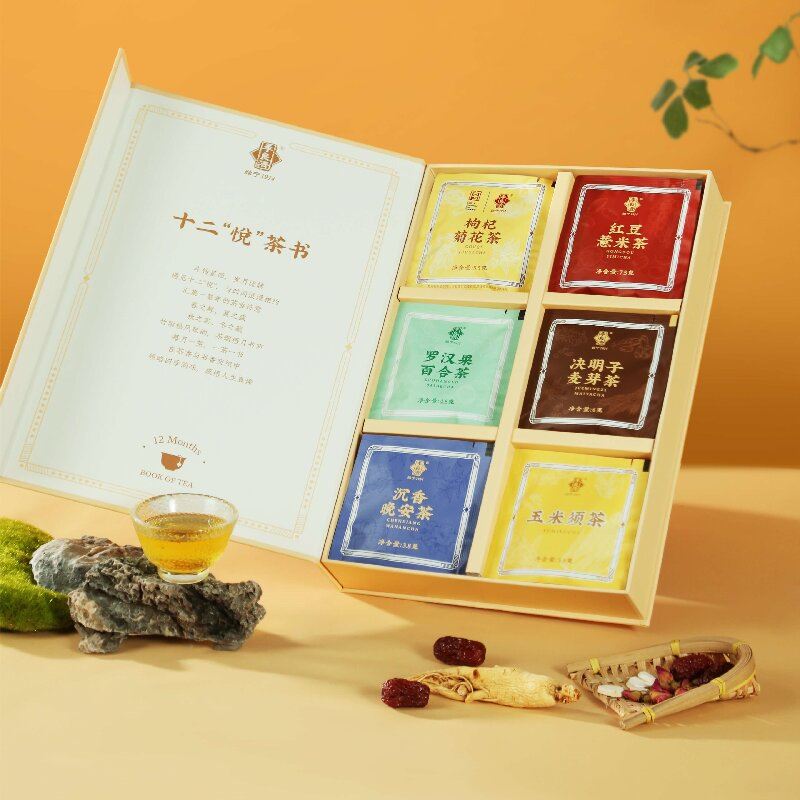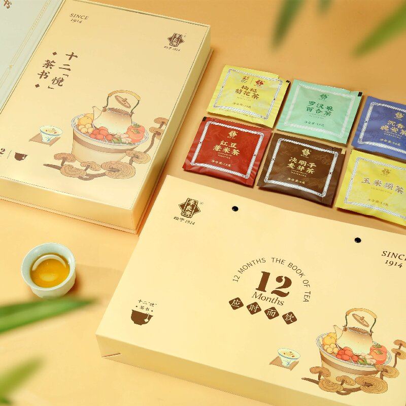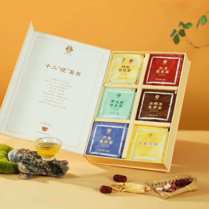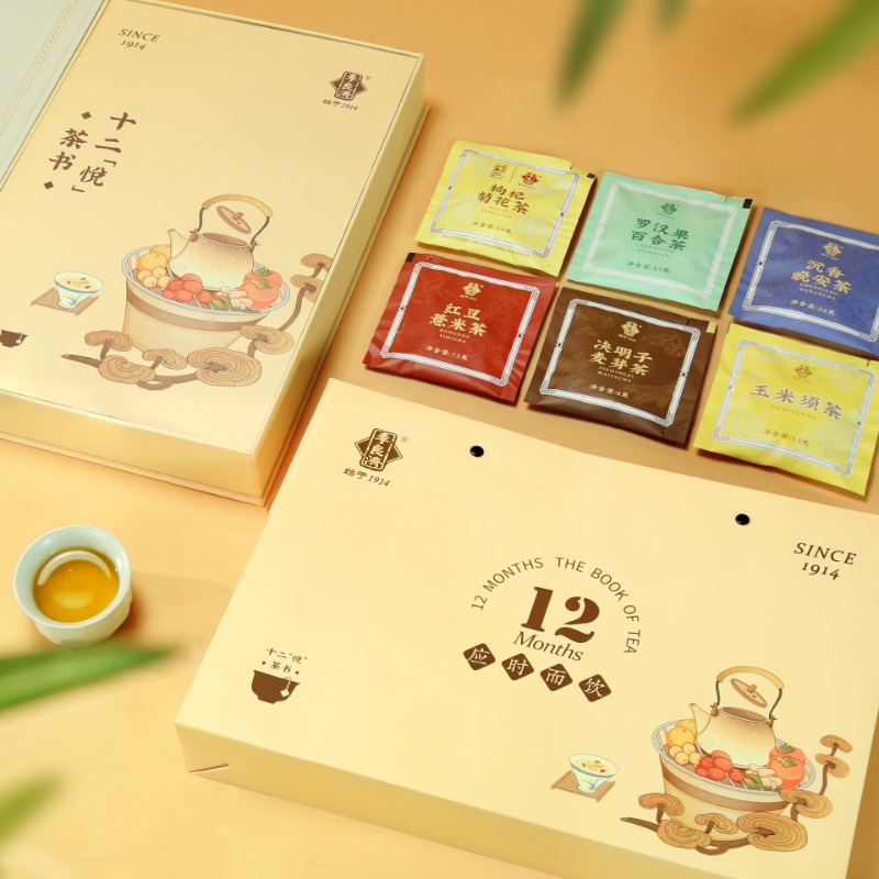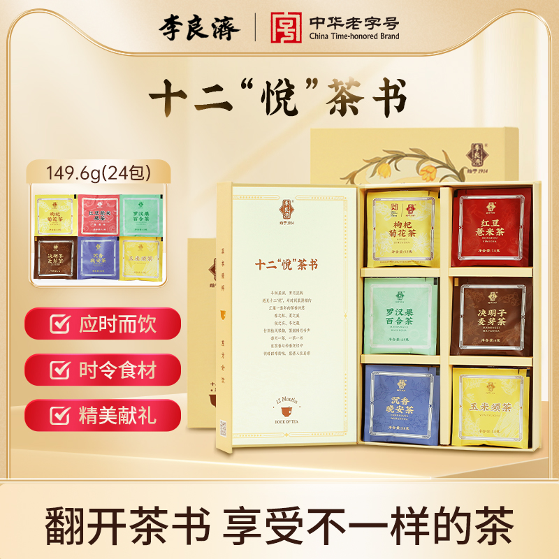 产品:李良济十二悦茶书 (茶饮礼盒) 规格:24包/盒 净含量:149.6克 用法与用量:开水冲泡 贮藏方法:置阴凉干燥处 应时而饮,包装精美