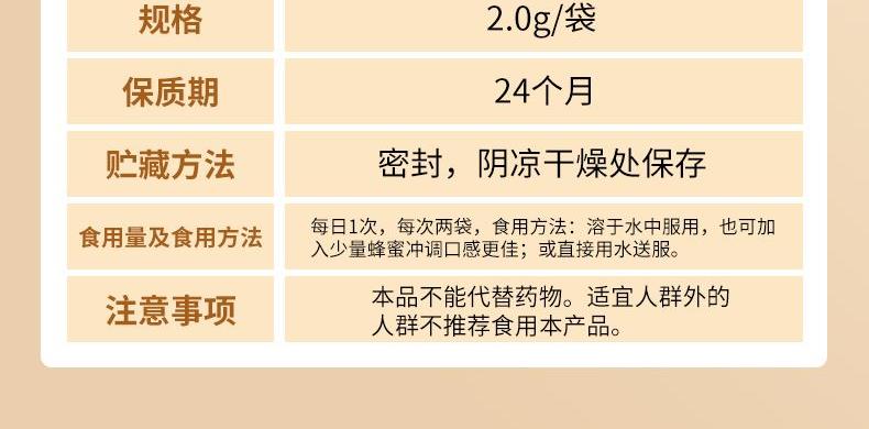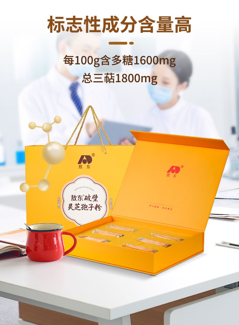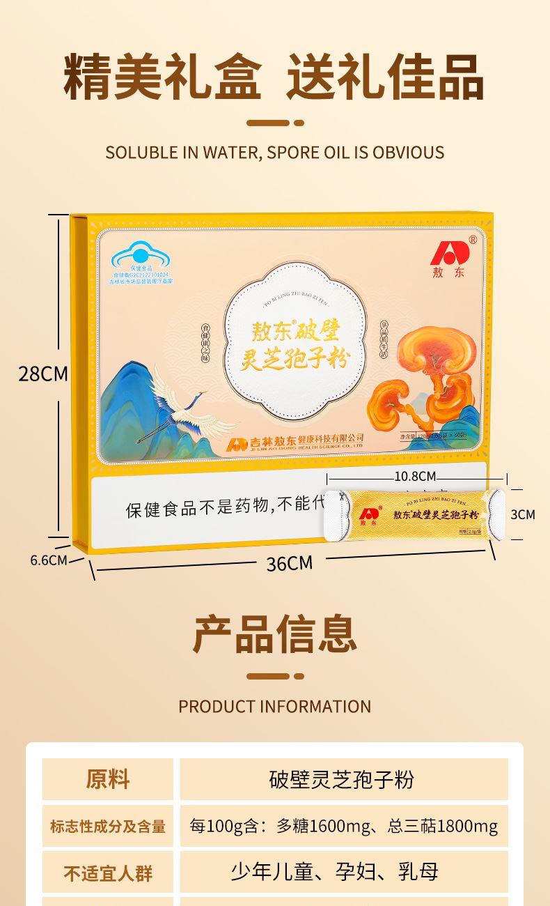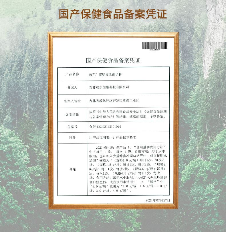 净含量: 120克 (2g/袋*60袋) 保质期:24个月 密封,置阴凉干燥处。 用法与用量:每日2次 每次一袋。温开水冲服。 卖点:长白山种植基地 孕育优质灵芝,孢子粉采用低温破壁技术,有效保护孢子粉里的活性物质。蓝帽权威认证。 性价比高,自用送礼都合适。包装大气,送礼佳品
