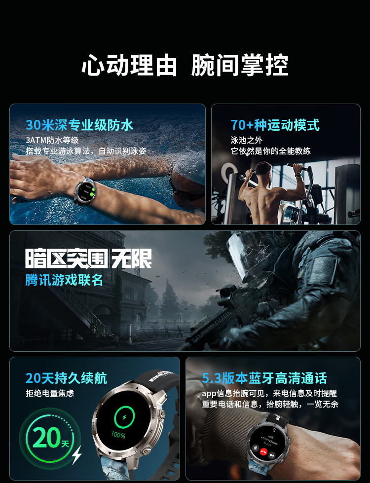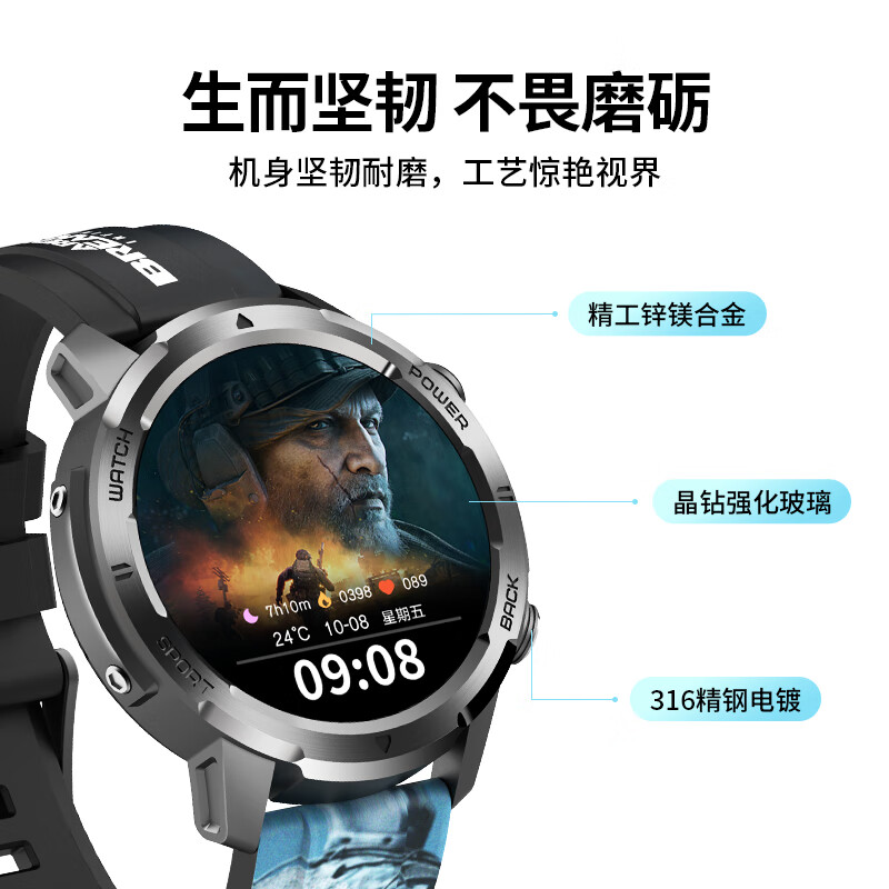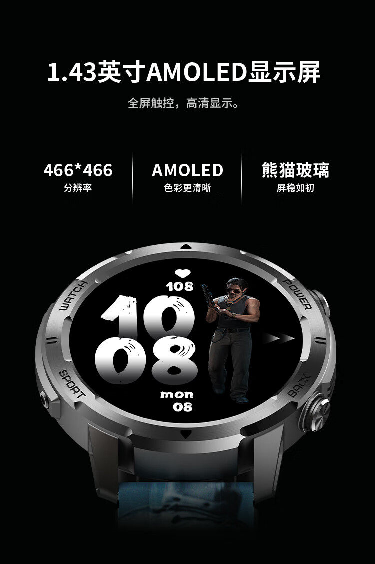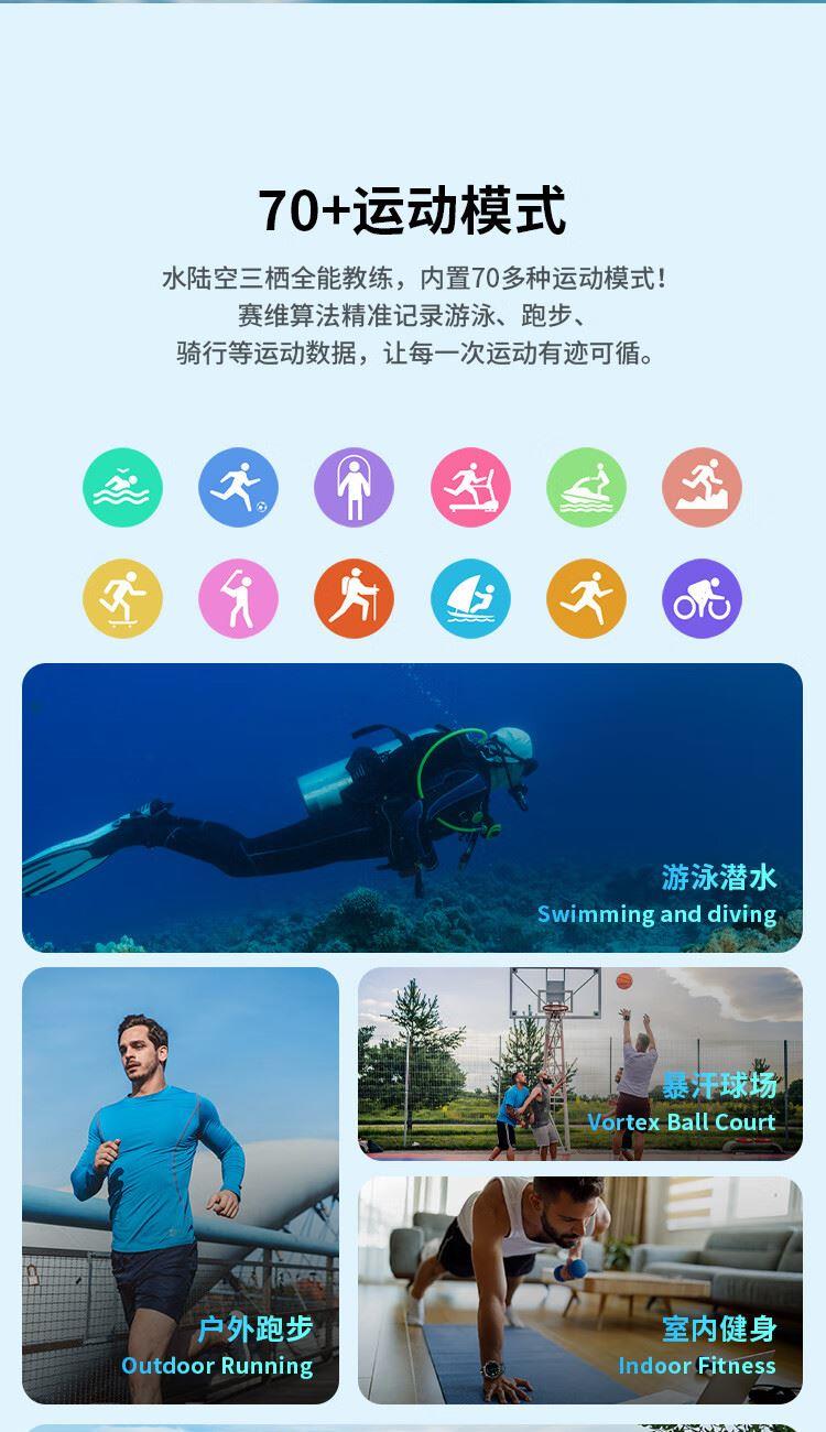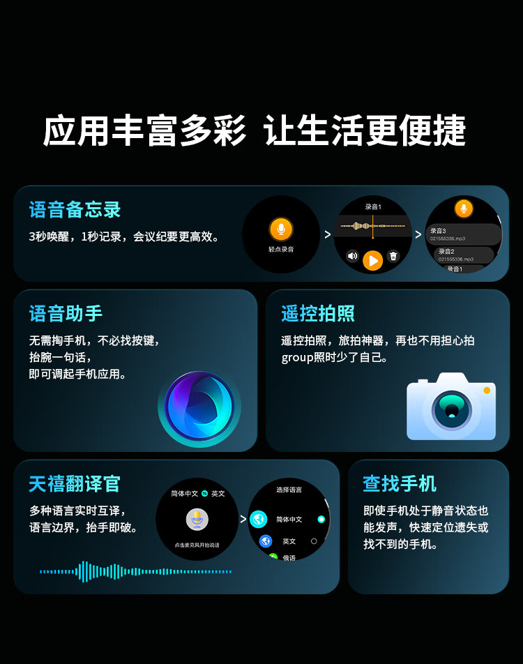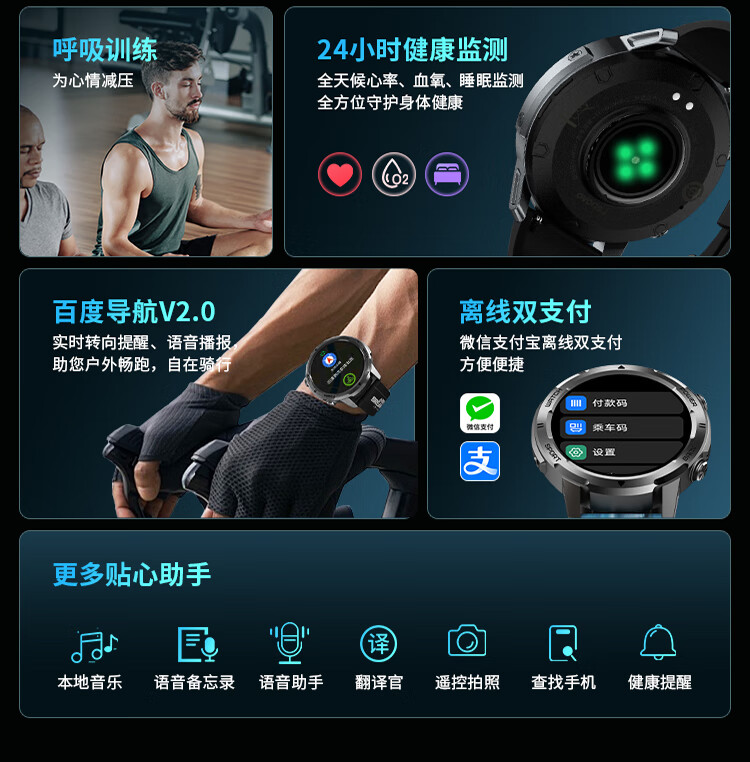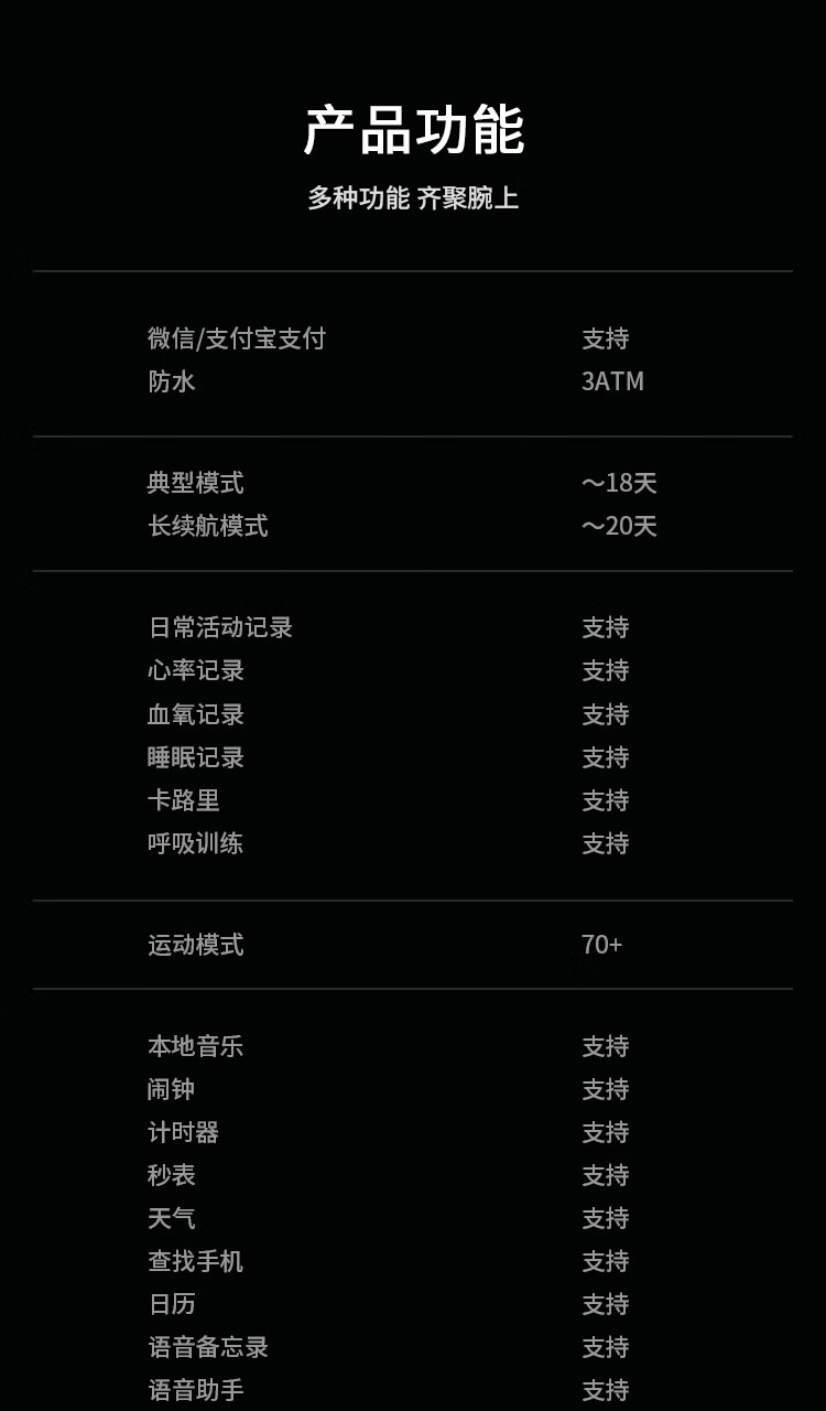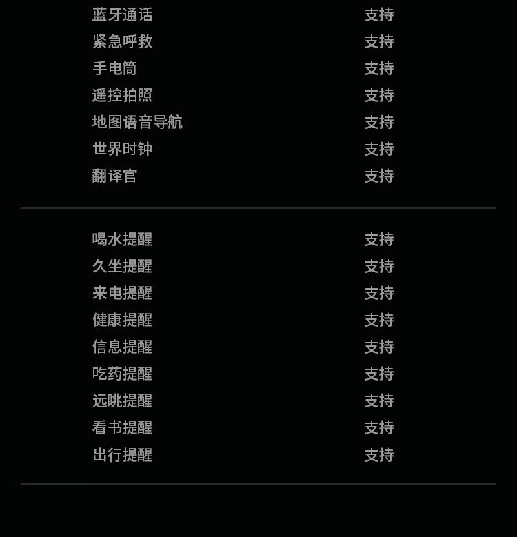 微信支付、支付宝支付、乘车码、 AOD熄屏表盘、AI精美表盘、 AI表盘相册,菜单壁纸、语音备忘录、 个性化铃声,本地音乐/相册、 遥控拍照、导航、世界时钟、 翻译官、活体识别、SOS、天气、 手电筒、计算器、女性健康提醒