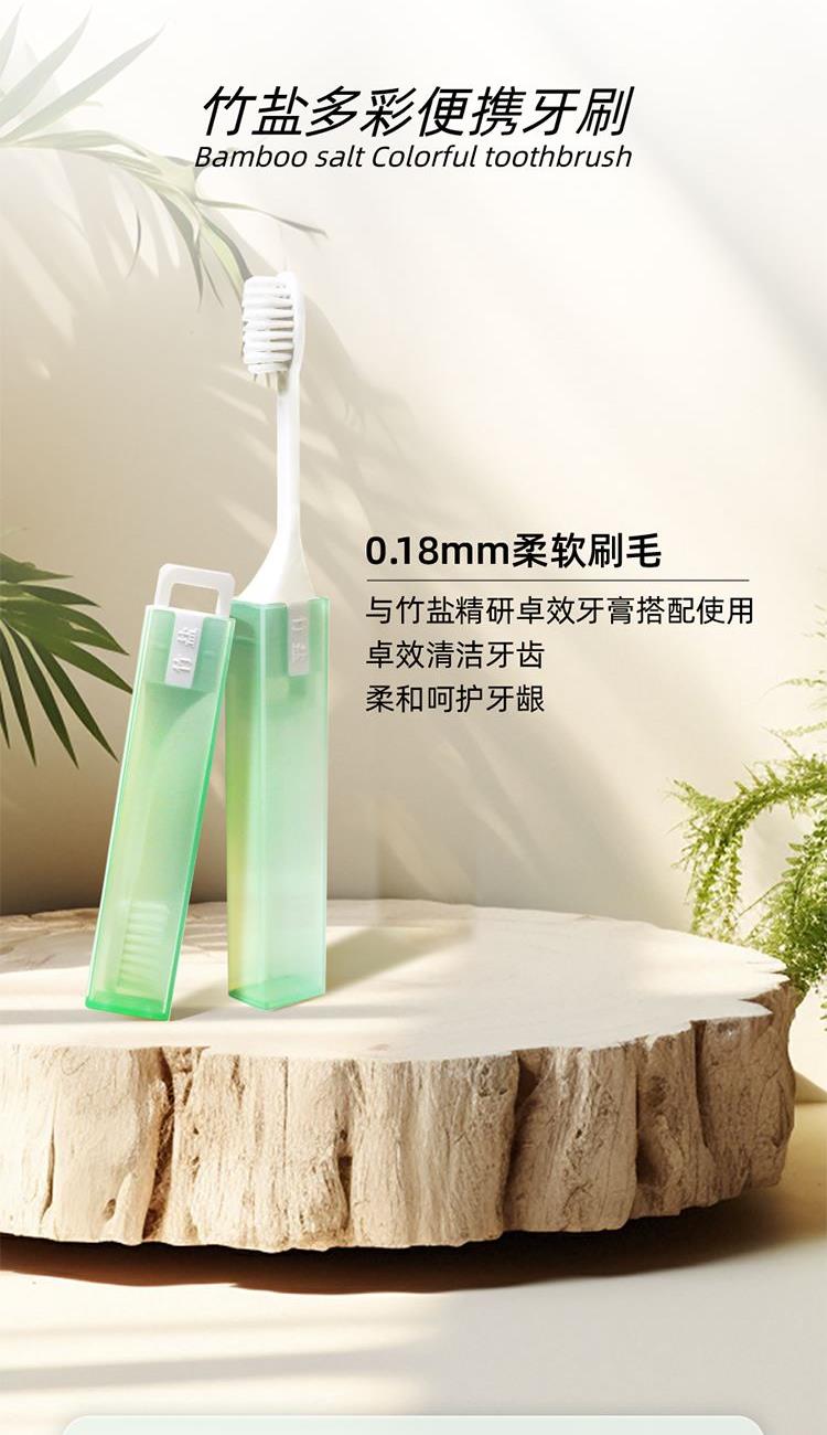 牙刷:细软护龈软毛牙刷,加倍呵护牙龈,柔软纤细尖丝刷毛,减少对于牙齿敏感部位的刺激,加倍呵护牙龈。 适中软毛牙刷,清洁口腔,柔软波浪形刷毛设计,更加贴合牙龈线,深入清洁牙龈细缝的同时,多方位清洁口腔。 人体工程学彩色防滑刷柄设计,贴合手型设计,分散压力,避免损伤牙龈;同时独特的防滑胶体使用时手指与刷柄轻松固定,防止打滑。----- 竹盐多彩便携旅行套装(颜色随机):出差旅游等方便携带,小小一个不占地方,竹盐系列牙膏+牙刷精心搭配
