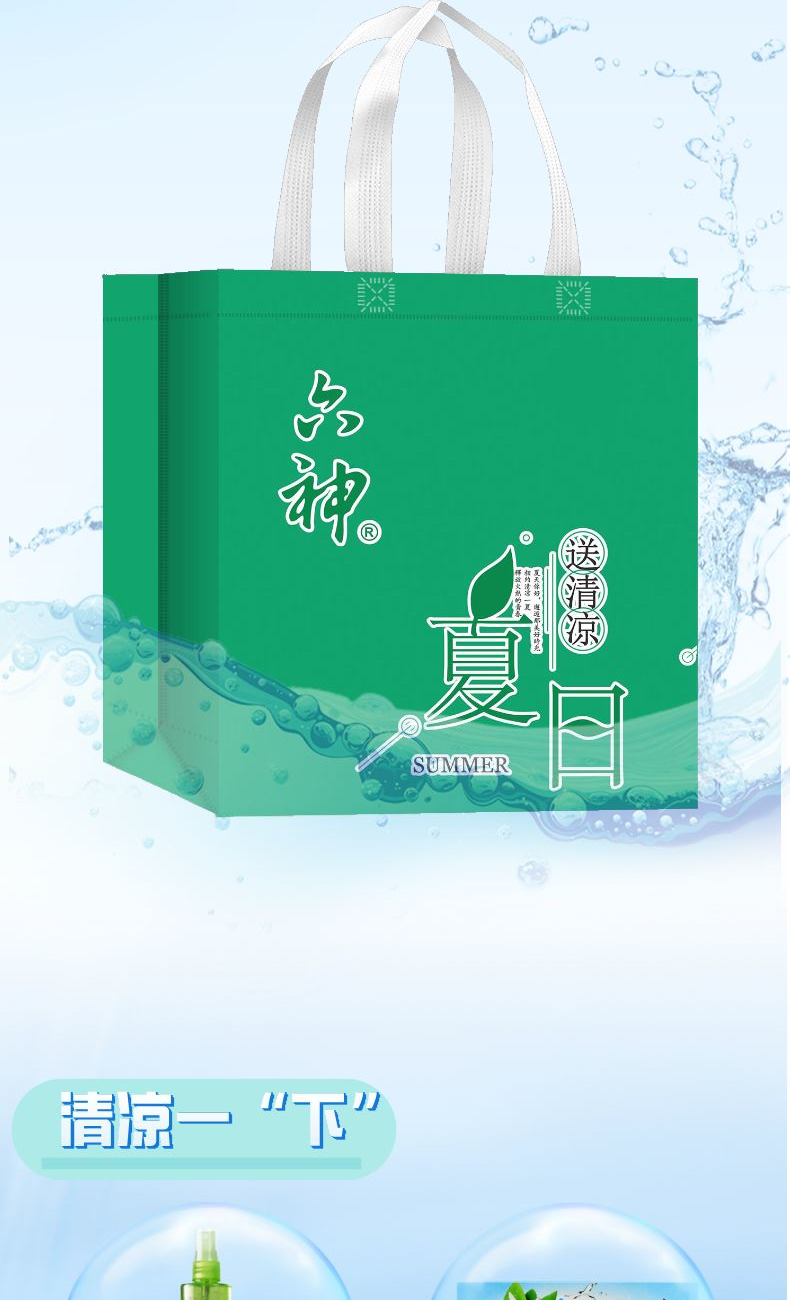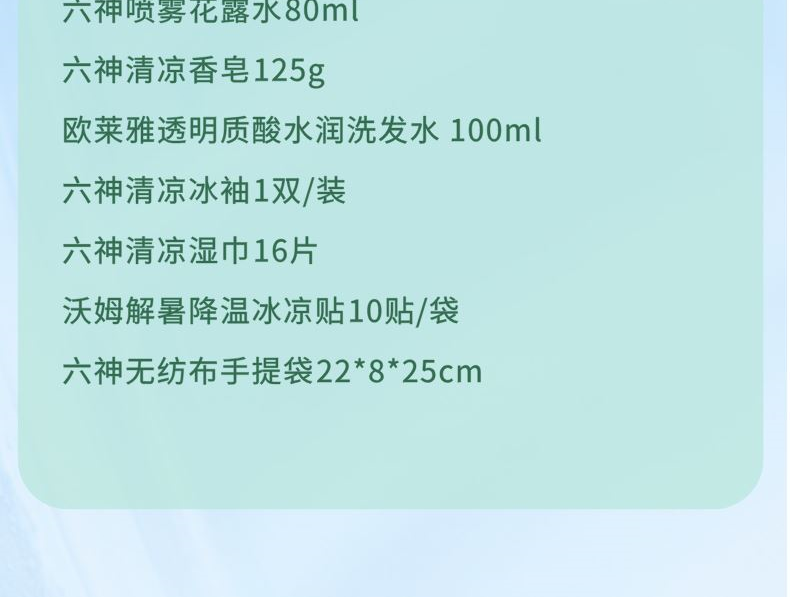 套装配置: 六神喷雾花露水80ml 六神清凉香皂125g 欧莱雅透明质酸水润洗发水100ml 六神清凉冰袖1双/装 六神清凉湿巾16片 沃姆解暑降温冰凉贴10贴/袋 六神无纺布手提袋22*8*25cm 礼盒重量:602g 礼盒尺寸:22*8*25cm