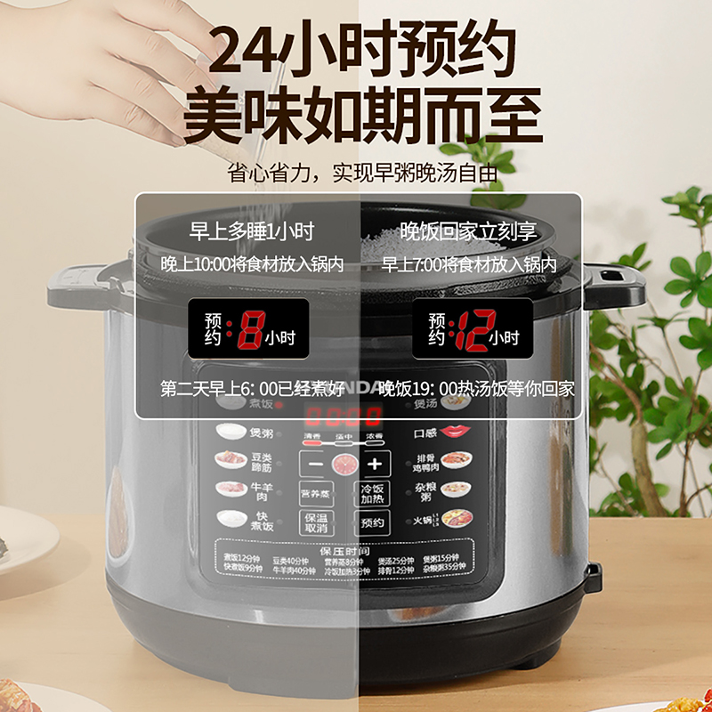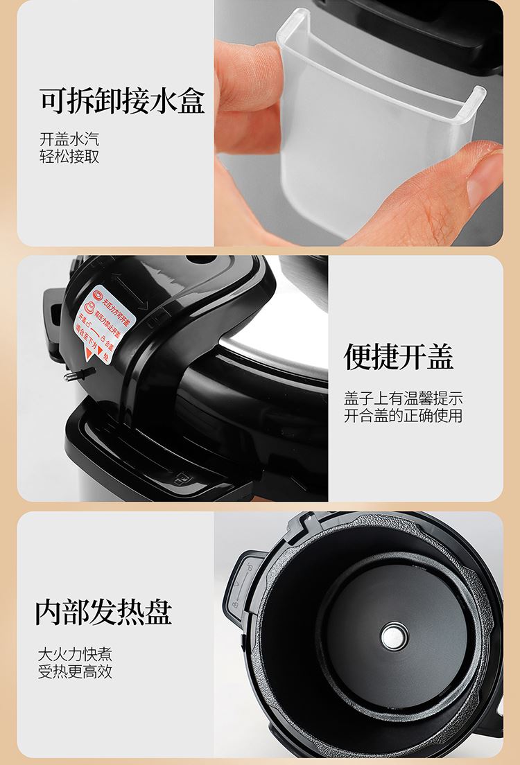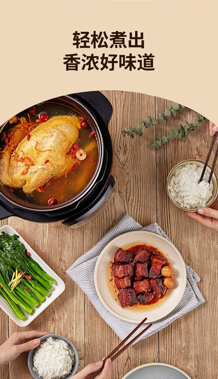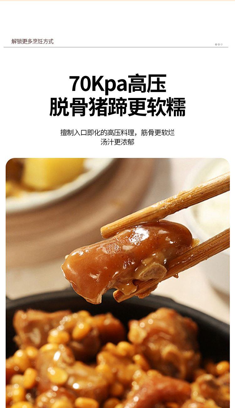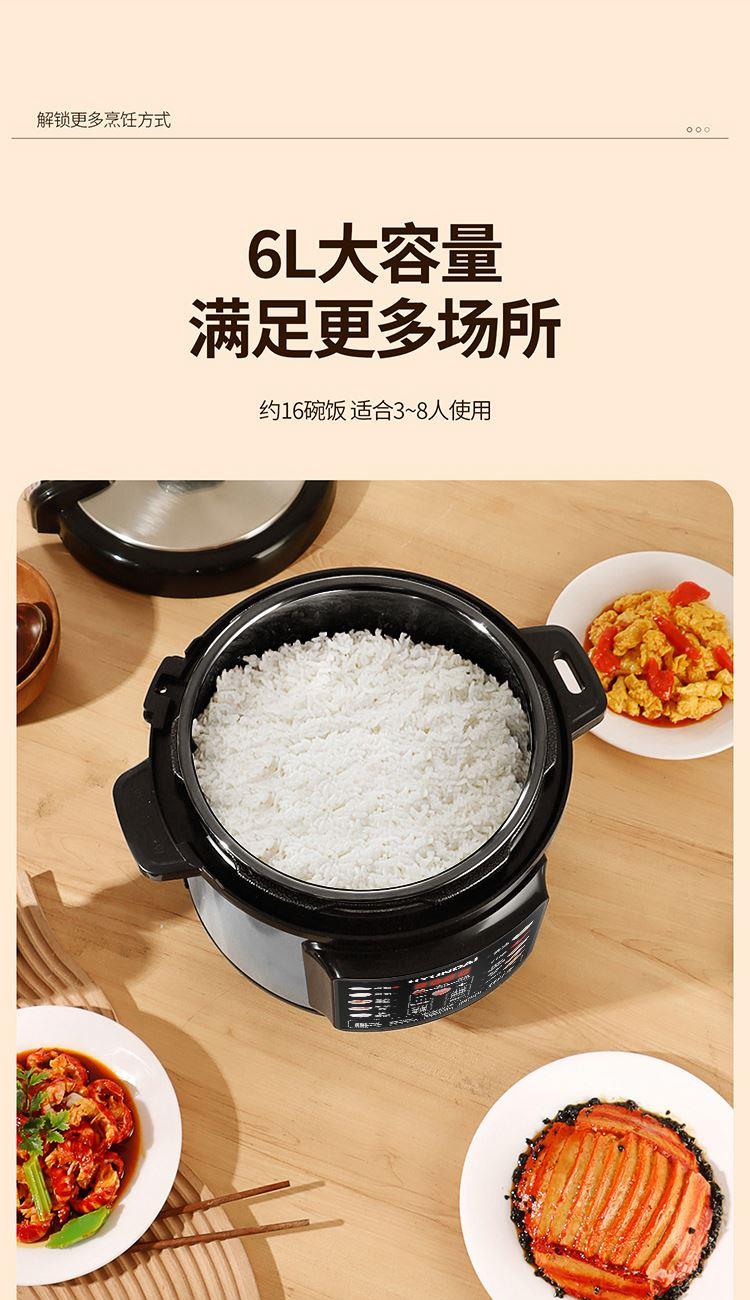 产品容量:6L、颜色:星空灰 额定功率:1000W 产品重量:净重3.8kg / 毛重4.6kg 包装尺寸:365*365*375mm 产品尺寸:320*330*330mm 1、6L大容量,适合2-12人家庭使用; 2、10种功能菜单,轻松做出饭店味道,食材精煮更入味; 3、三种口感可调,清香、适中、软糯三种模式可选; 4、预约保温,24H预约,煮完自动保温; 5、插立式锅盖,上盖可立设计,定位锅盖位置节省空间; 6、70Kpa压力烹煮,脱骨猪蹄更软糯,高压料理,筋骨更软烂,汤汁更浓郁。