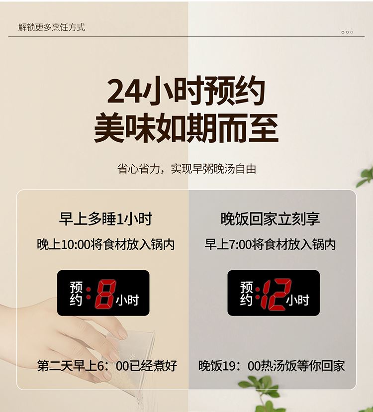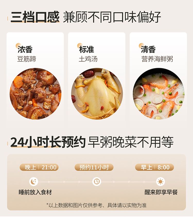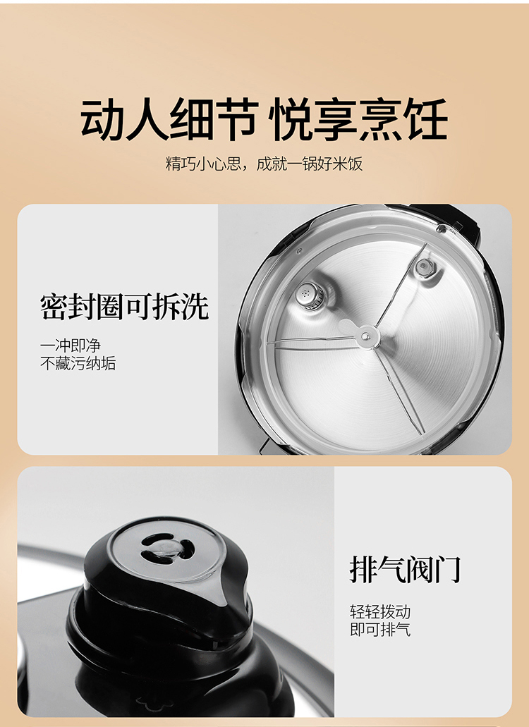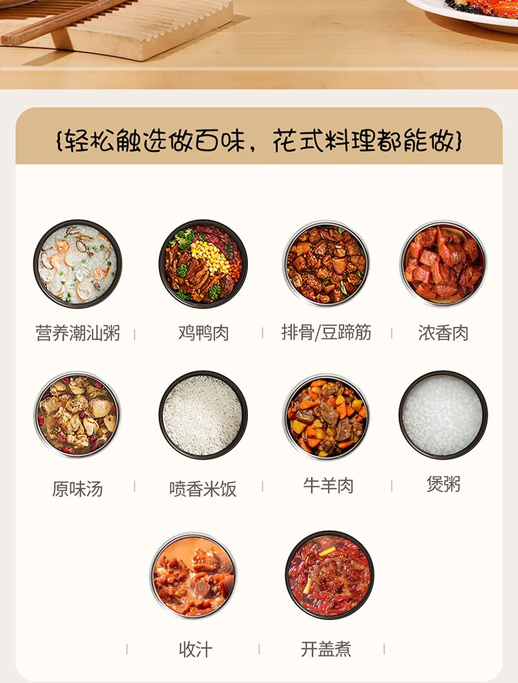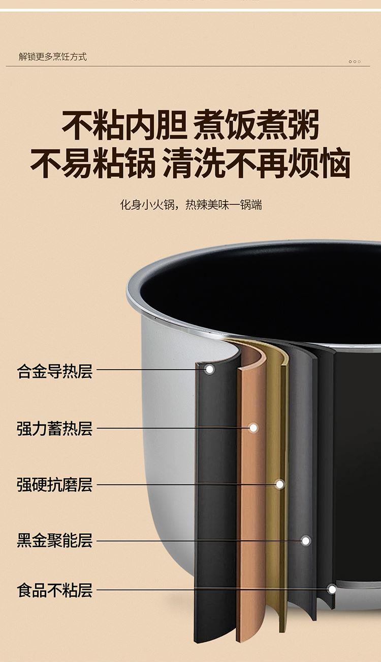 产品容量:6L、颜色:星空灰 额定功率:1000W 产品重量:净重3.8kg / 毛重4.6kg 包装尺寸:365*365*375mm 产品尺寸:320*330*330mm 1、6L大容量,适合2-12人家庭使用; 2、10种功能菜单,轻松做出饭店味道,食材精煮更入味; 3、三种口感可调,清香、适中、软糯三种模式可选; 4、预约保温,24H预约,煮完自动保温; 5、插立式锅盖,上盖可立设计,定位锅盖位置节省空间; 6、70Kpa压力烹煮,脱骨猪蹄更软糯,高压料理,筋骨更软烂,汤汁更浓郁。
