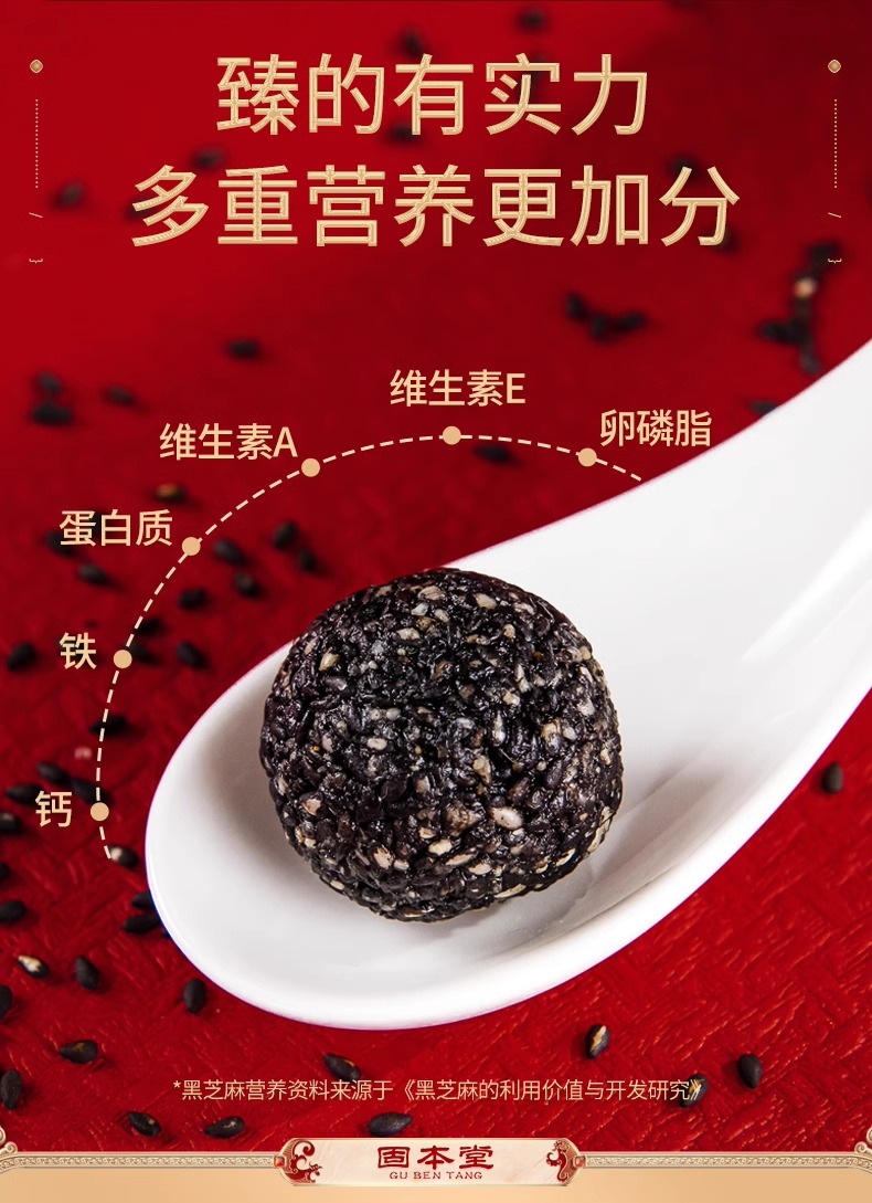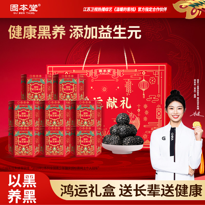 固本堂鸿运礼盒126g*8罐 【配料表】:黑芝麻、低聚果糖、蜂蜜 【食用方法】:开罐拆袋即食 贮藏方法】:置阴凉干燥处、建议冷藏保存 【保质期】:6个月