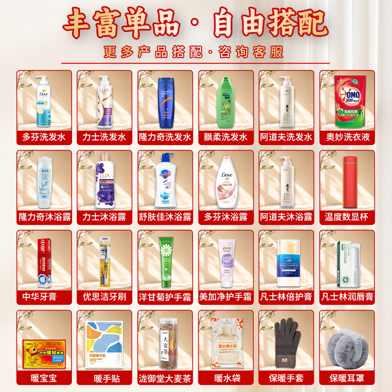 礼袋尺寸:20*27*10cm 包装尺寸:66* 45*51 CM 产品配置:(香型随机) 多芬洗发水380ml 多芬沐浴露300ml 凡士林保湿霜140g 珊瑚绒毛巾30*60cm 高露洁牙膏90g 高露洁牙刷 暖水袋500ml 海氏海诺好暖鸭暖贴(1片装/袋)*5袋 香港大药房裂可宁35g 李时珍蒸汽眼罩——5片/盒 精美礼袋