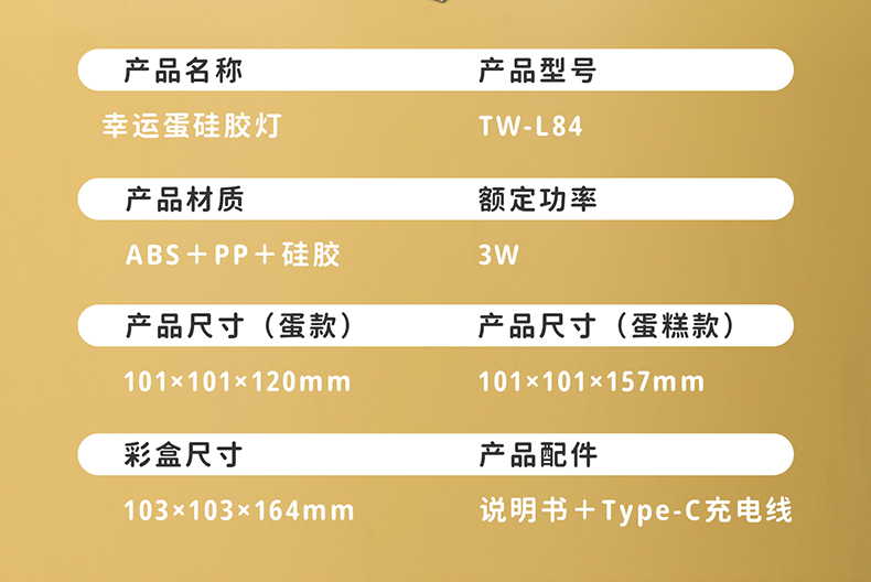产品:幸运蛋硅胶灯 产品型号:TW-L84 产品规格: 约101x101x157mm(蛋糕款) 包装规格:约103x103x164mm 产品材料:ABS+PP+硅胶 包装材料:铜版纸 产品配件:说明书+充电线 额定电压:DC5V1A 额定功率:3W LED功率:1W(6×0.2W/LED模块) 电池容量:800mAh 充电时间:约3-4h 续航时间:亮度续航时间:≈4H 60%亮度续航时间:≈6H 30%亮度续航时间:≈12H 执行标准:GB/T 7000.204 GB/T 7000.1 产品净重: 约229g(蛋糕款) 产品毛重: 约301g(蛋糕款) 信息: 净重: 约18.1kg(蛋糕款) 毛重: 约19.1kg(蛋糕款) 外箱尺寸:约540x437x517mm