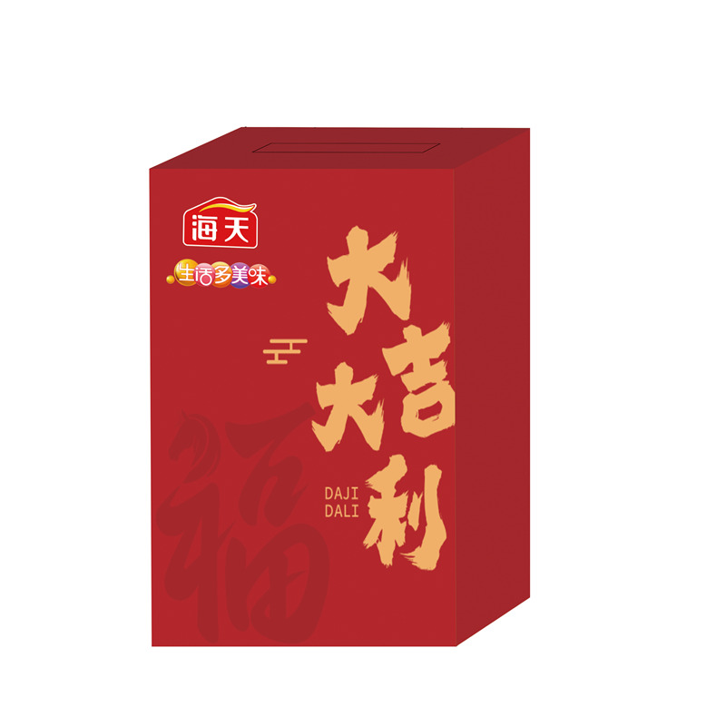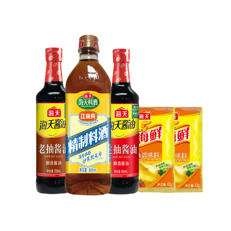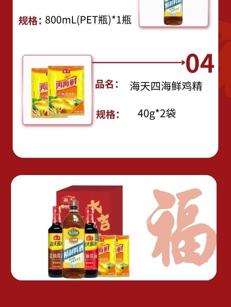 配置: 海天生抽酱油500mL(PET瓶)*1瓶 海天老抽酱油500mL(PET瓶)*1瓶 海天精制料酒800mL(PET瓶)*1瓶 海天四海鲜鸡精40g*2袋 卖点: 可选产品丰富多样,礼箱随心组合,多种价位因需而定,充分满足各种送礼需求,是商务送礼、单位福利的用心之选。