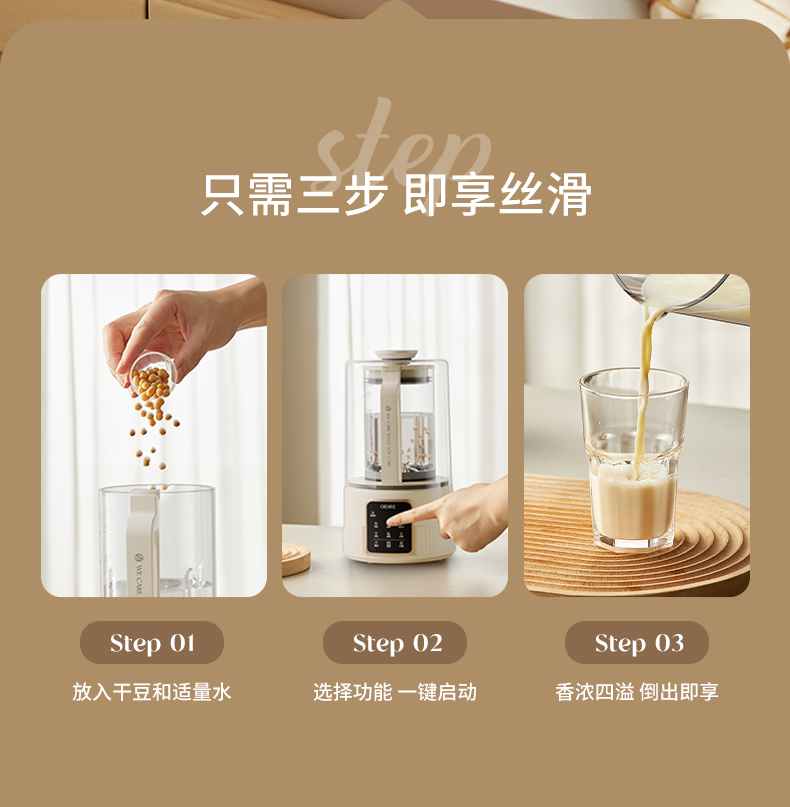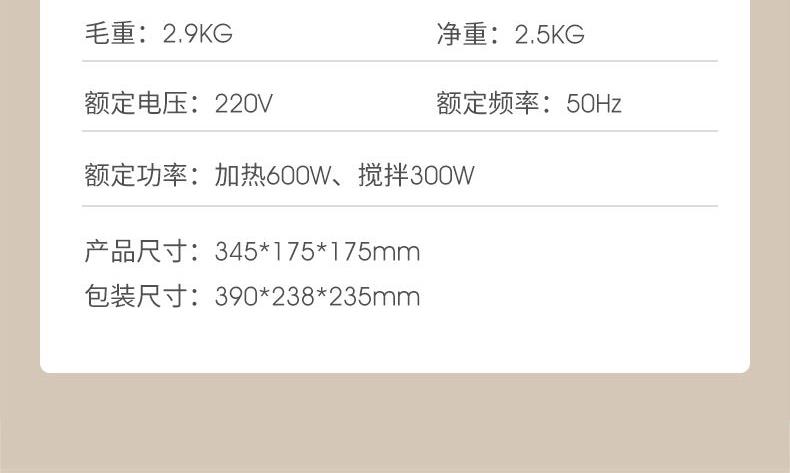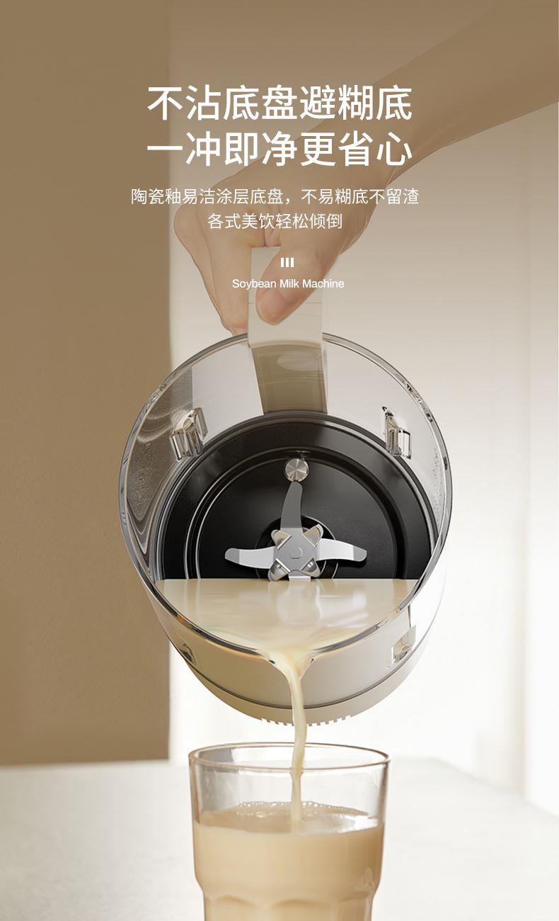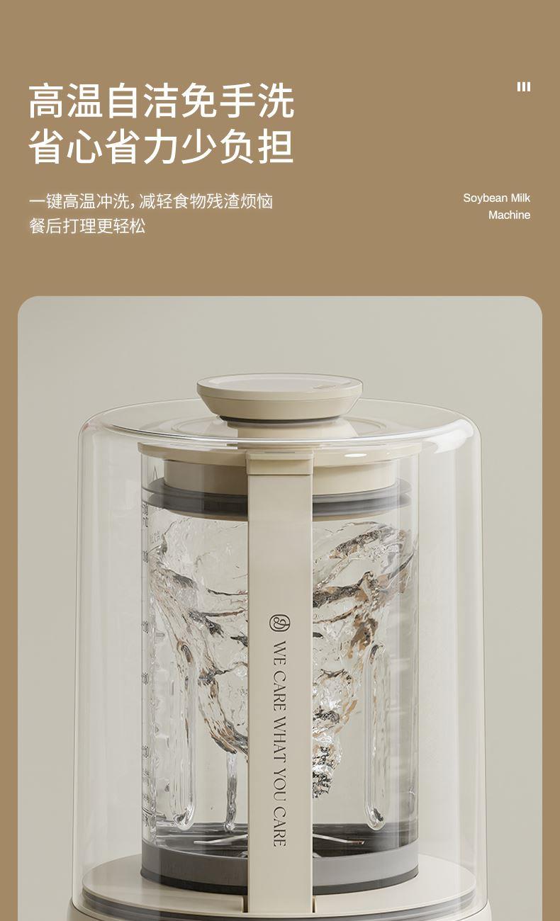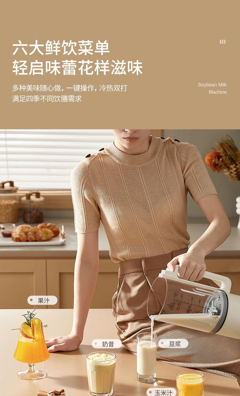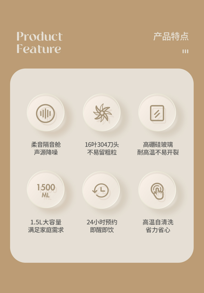 主要材质:PP+高硼硅玻璃+不锈钢 电压:220V 功率:加热600W搅拌300W 容量:1.5L 1、1.5L大容量(冷1.3L/热1L),满足用户四季需求 2、高硼硅玻璃杯体,骤冷骤热不易开裂 3、陶瓷釉不沾涂层发热盘,清洗方便糊底 4、24小时预约,尽享美味 5、柔音隔音罩,物理降低噪音 6、高温清洗功能,省心方便 7、16页不锈钢刀组,有效绞打食材