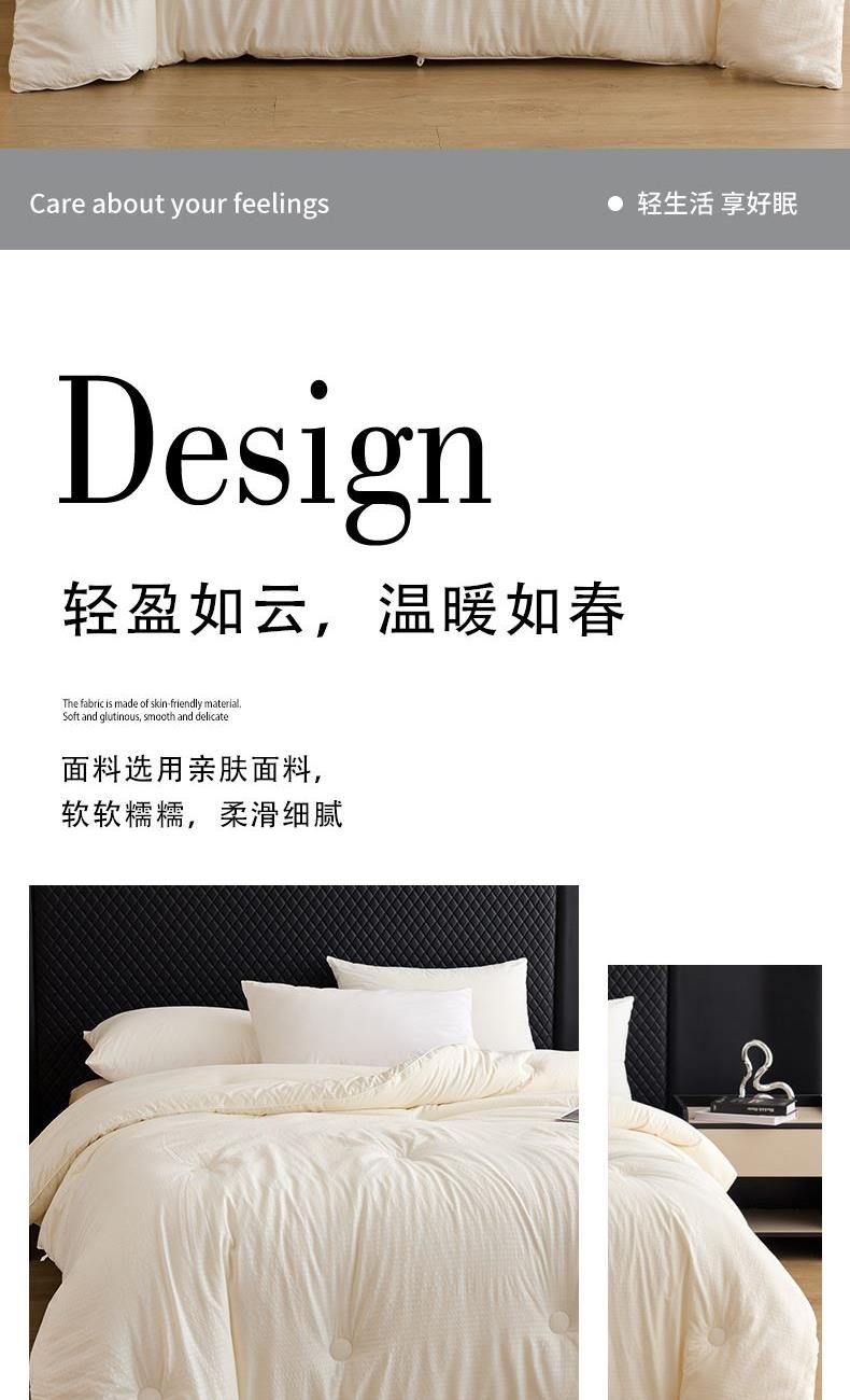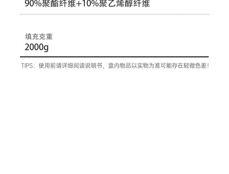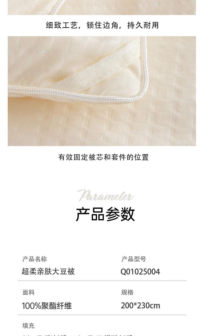产品型号:Q01025004 规 格:200*230cm 填 充:90%聚酯纤维+10%聚乙烯醇纤维 填充克重:2000g 面 料:聚酯纤维 装 箱 数:7 面料选用亲肤面料,软软糯糯,柔滑细腻; 大豆纤维具有细密的透气孔,科学调配填充比列,触感柔软,提供舒适的睡眠体验。 精美红色礼袋包装,自用送礼两相宜;