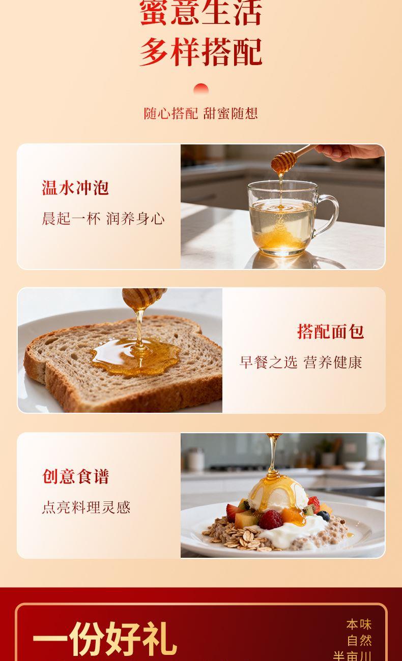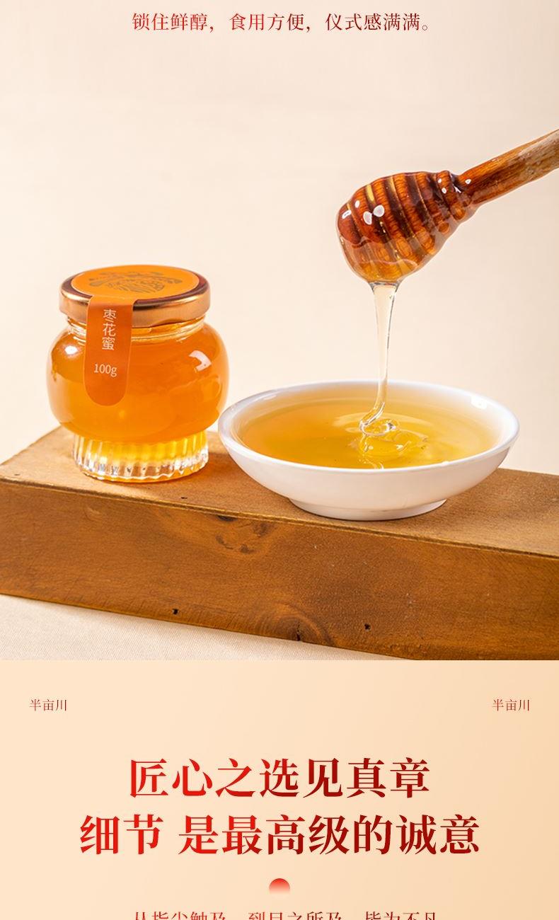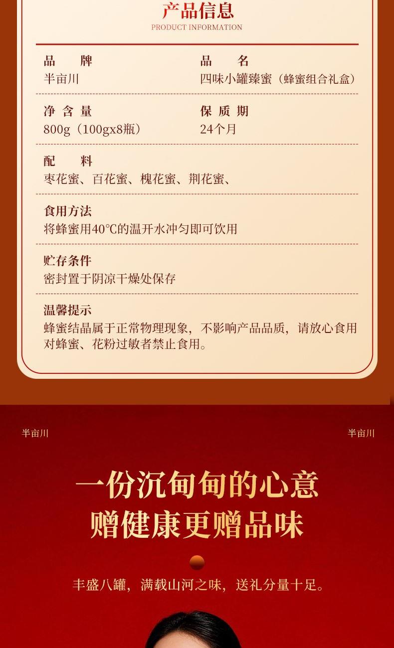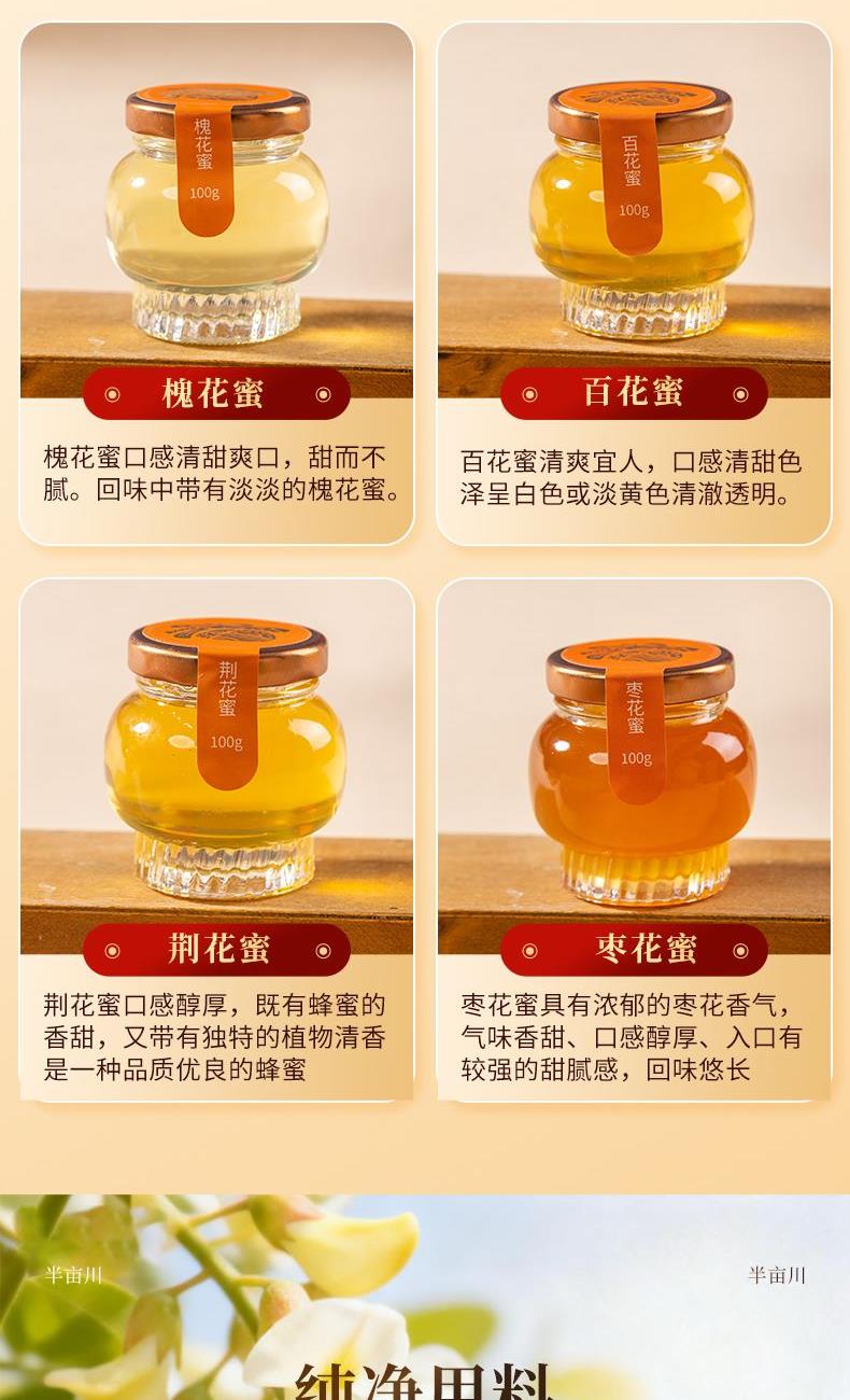 产品配置: 枣花蜜100g*2 百花蜜100g*2 槐花蜜100g*2 荆花蜜100g*2 净含量:800g 礼盒尺寸:45*7.5*21cm 半亩川四味蜜礼,100g精巧装, 一口尝遍四种天然蜜香, 清甜醇厚各具风味,无添加更纯粹。