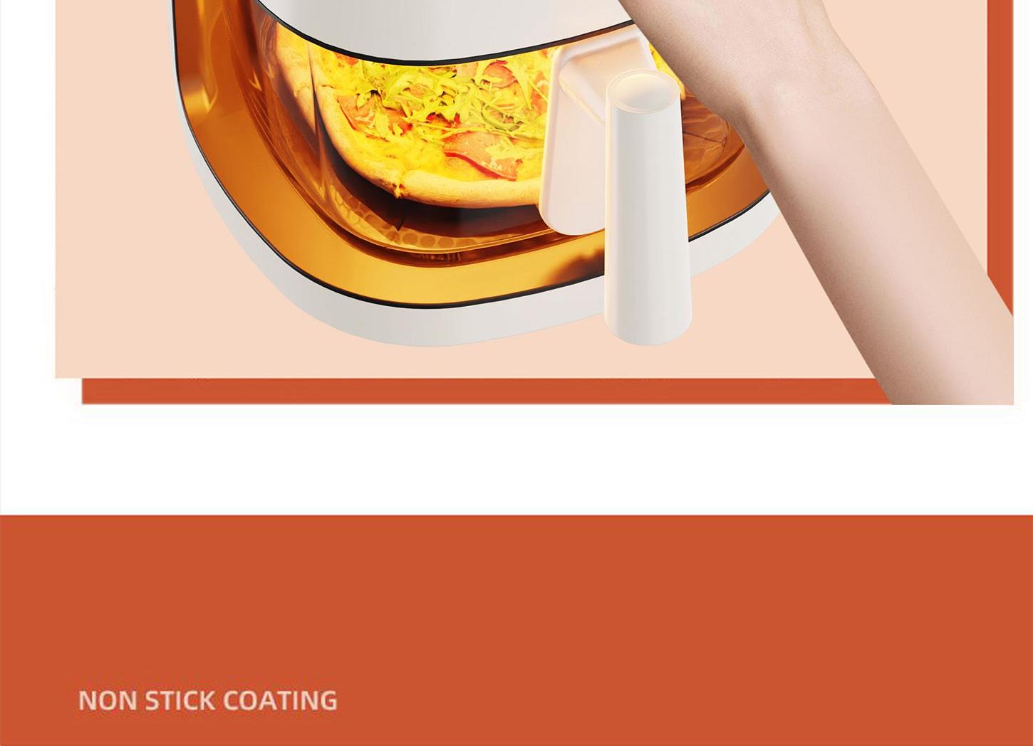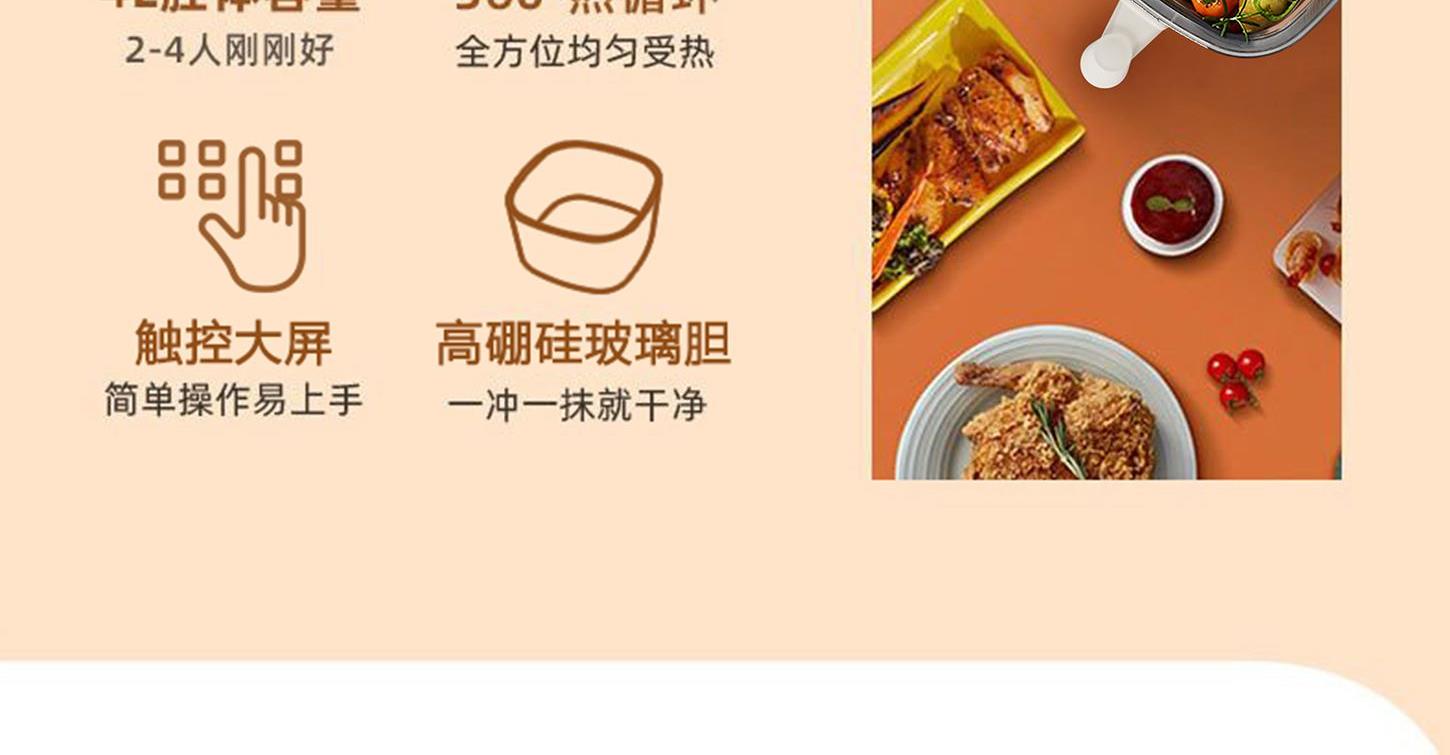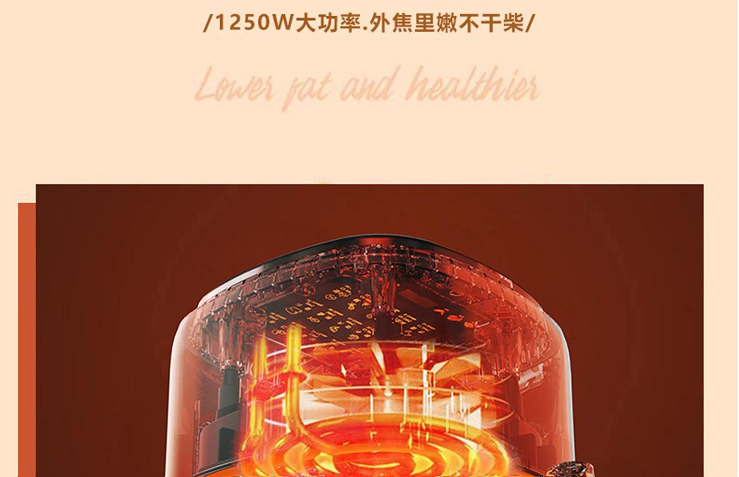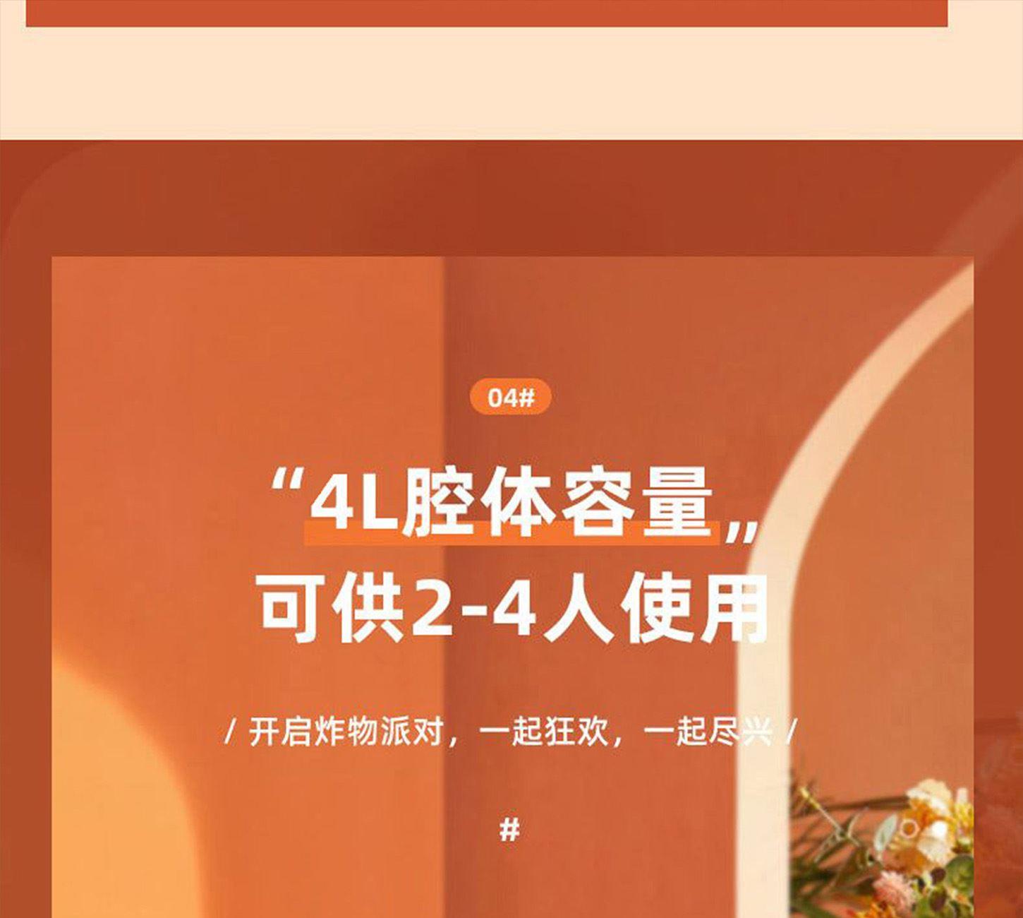 额定电压:220V~ 额定频率:50Hz 额定功率:1250W 容 量:4L • 一体隔热把手,抽拉更安全; • 后置散热系统,安全更耐用; • 高硼硅玻璃胆,美味看得见; • 食品接触级不沾锅涂层,久用不沾容清洁; • 长效控时、控温,80-200℃ 宽域调温,0-60min自由定时; • 24H超长时间预约,美食提前安排; • 4.0L黄金比例容量,满足全家人健康美食任门。