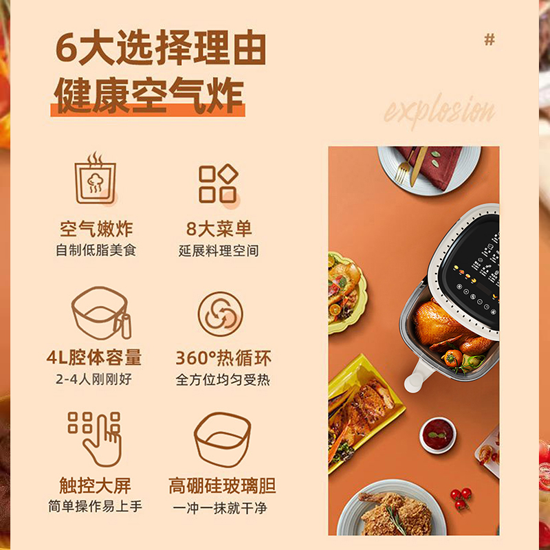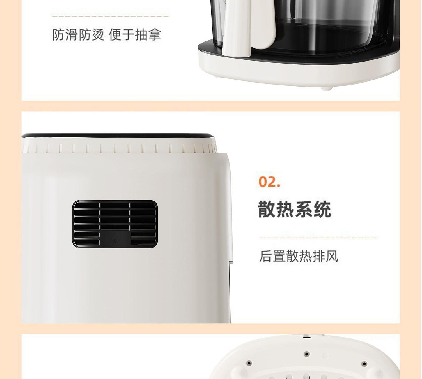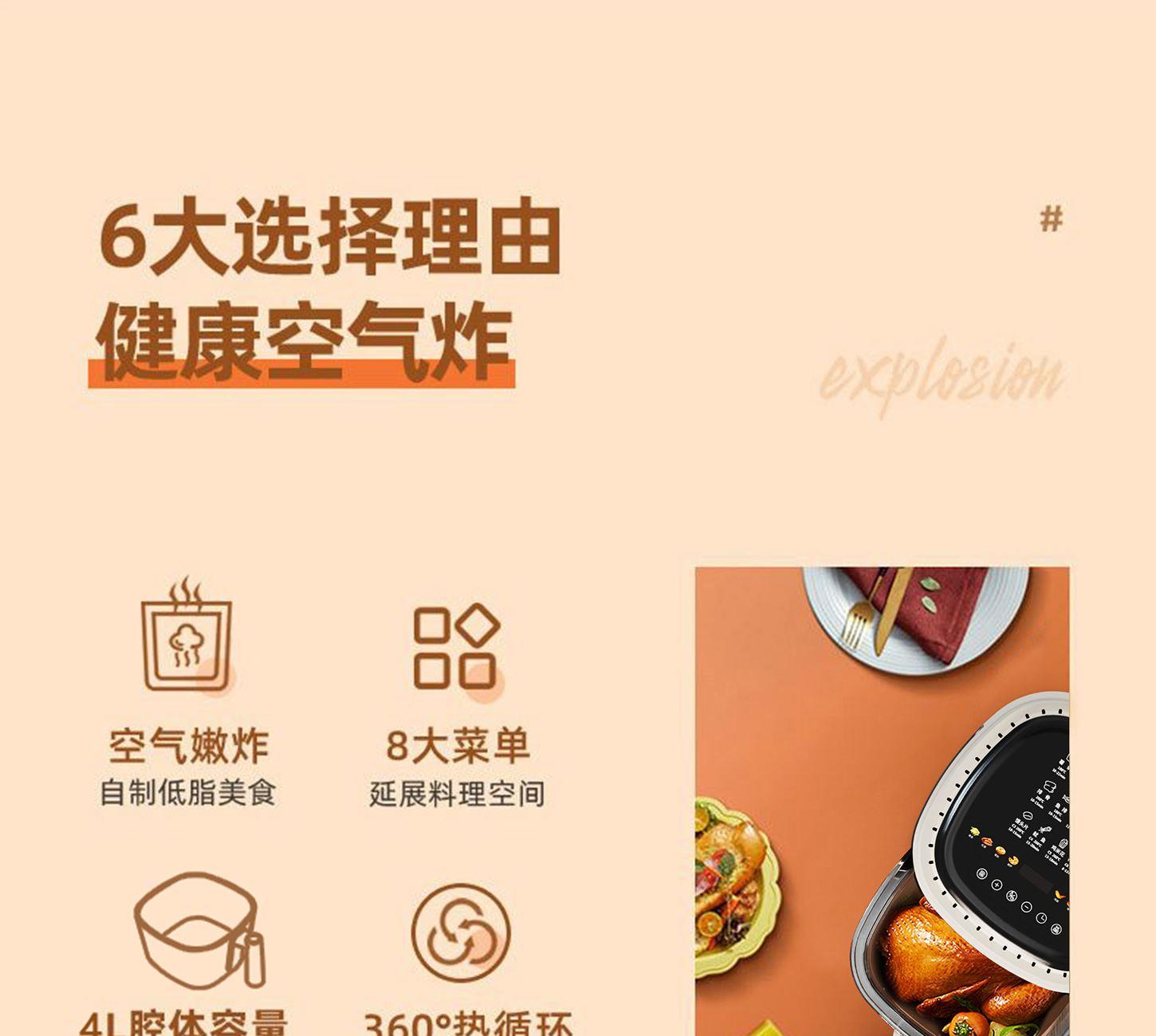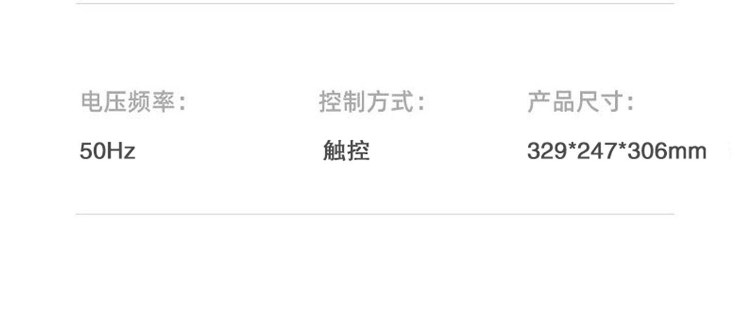 额定电压:220V~ 额定频率:50Hz 额定功率:1250W 容 量:4L • 一体隔热把手,抽拉更安全; • 后置散热系统,安全更耐用; • 高硼硅玻璃胆,美味看得见; • 食品接触级不沾锅涂层,久用不沾容清洁; • 长效控时、控温,80-200℃ 宽域调温,0-60min自由定时; • 24H超长时间预约,美食提前安排; • 4.0L黄金比例容量,满足全家人健康美食任门。