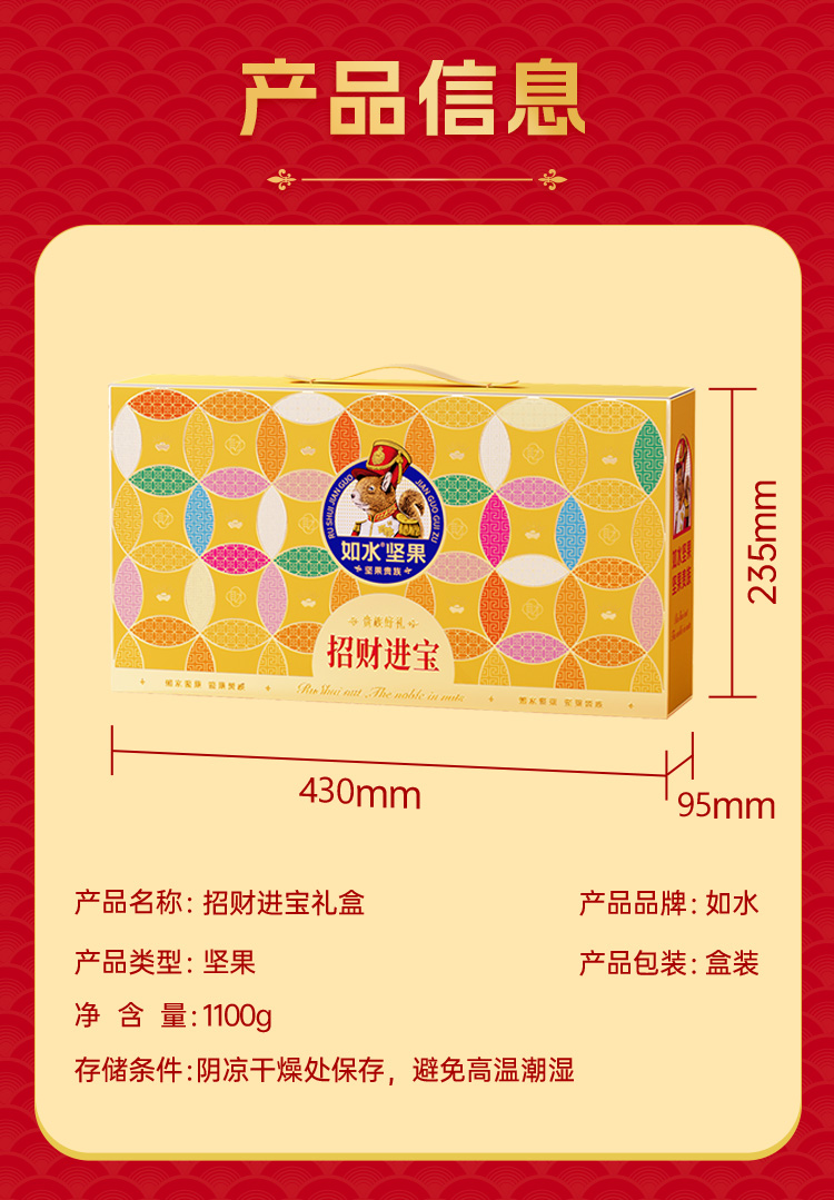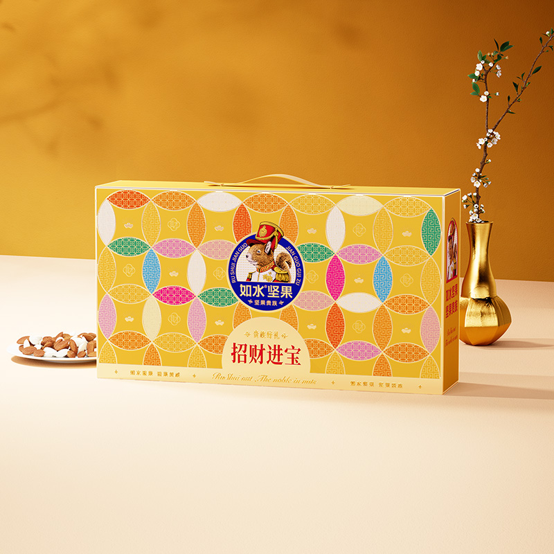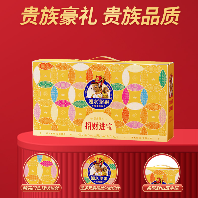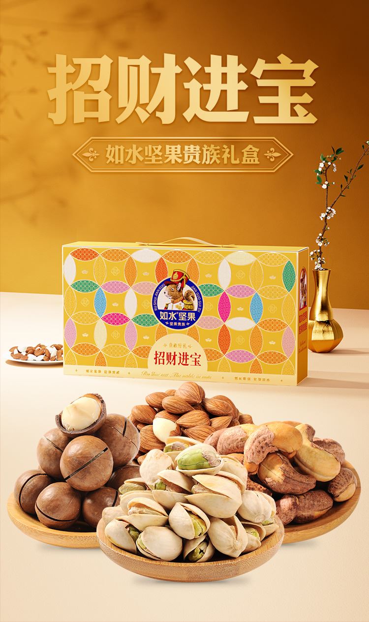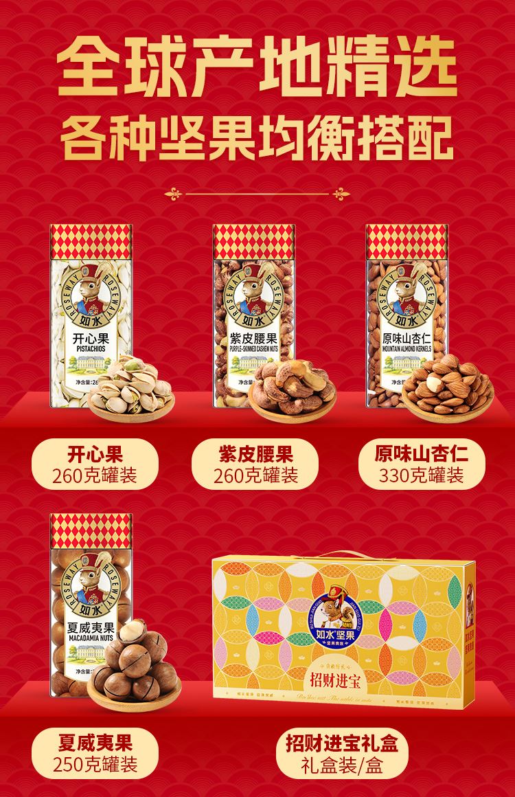 如水招财进宝礼盒 净含量:1100g 如水开心果260g 如水紫皮腰果260g 如水原味山杏仁330g 如水夏威夷果250g