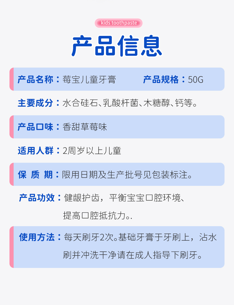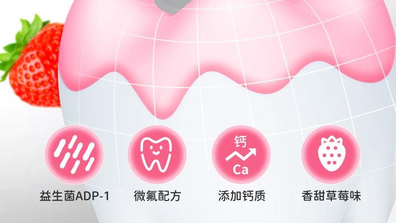 容量:50g 型号:YG-MB050-1 1.富含益生菌ADP-1、ADP-2能够减低牙周囊袋深度,增加口腔益菌,有效预防儿童牙周病及蛀牙。 2.微米级质感摩擦剂,清洁牙齿的同时保护儿童牙齿牙釉质。 3.成分简单,不添加防腐剂激素等,宝宝安心,妈妈放心 4.草莓味道,让宝宝爱上刷牙,添加木糖醇,强健牙齿