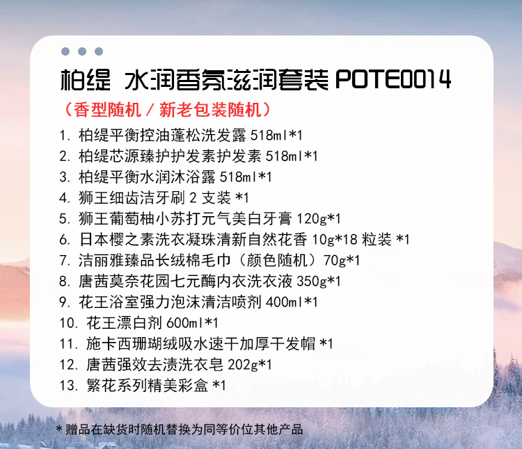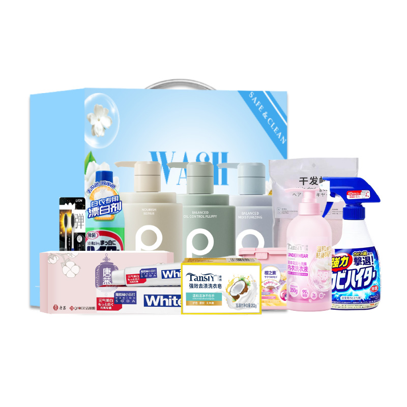 配置:(香型随机/新老包装随机) 1.柏缇平衡控油蓬松洗发露518ml*1 2.柏缇芯源臻护护发素护发素518ml*1 3.柏缇平衡水润沐浴露518ml*1 4.狮王细齿洁牙刷2支装*1 5.狮王葡萄柚小苏打元气美白牙膏120g*1 6.日本樱之素洗衣凝珠清新自然花香10g*18粒装*1 7.洁丽雅臻品长绒棉毛巾(颜色随机)70g*1 8.唐茜莫奈花园七元酶内衣洗衣液350g*1 9.花王浴室强力泡沫清洁喷剂400ml*1 10.花王漂白剂600ml*1 11.施卡西珊瑚绒吸水速干加厚干发帽*1 12.唐茜强效去渍洗衣皂202g*1 13.繁花系列精美彩盒*1