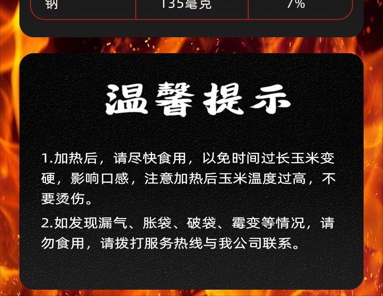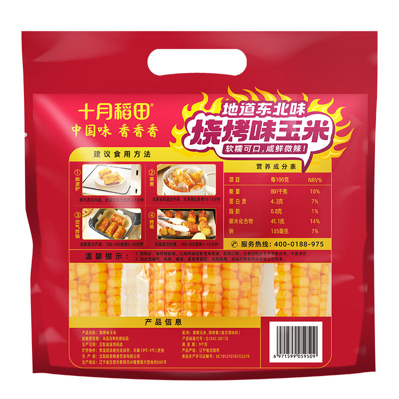 产品信息: ①规格:1kg ②保质期:9个月 ③产地:辽宁省沈阳市 ④特点:鲜香粘糯,玉米与酱汁奇妙搭配,东北烧烤秘制工艺,鲜香入味