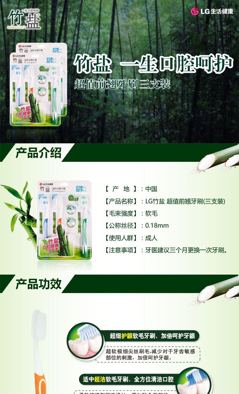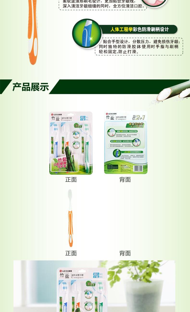 •精炼的护齿精华——竹盐成分,呵护牙龈、洁白牙齿、清洁口腔、清新口气、减轻牙渍; •具有护理牙齿和牙龈的良好作用,给口腔带来多方位的健康呵护; •特有含氟配方在牙齿表面形成坚固保护膜,预防锯齿; •天然竹盐成分含有丰富的矿物质,有助于温和呵护牙齿和牙龈; 牙刷:细软护龈软毛牙刷,加倍呵护牙龈,柔软纤细尖丝刷毛,减少对于牙齿敏感部位的刺激,加倍呵护牙龈。 适中软毛牙刷,清洁口腔,柔软波浪形刷毛设计,更加贴合牙龈线,深入清洁牙龈细缝的同时,多方位清洁口腔。 人体工程学彩色防滑刷柄设计,贴合手型设计,分散压力,避免损伤牙龈;同时独特的防滑胶体使用时手指与刷柄轻松固定,防止打滑