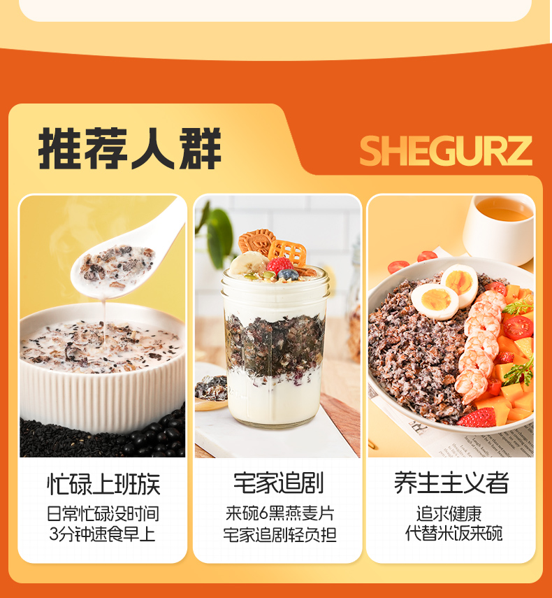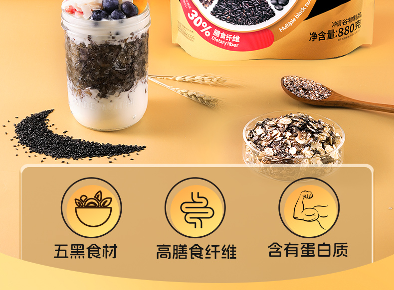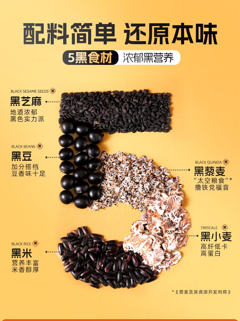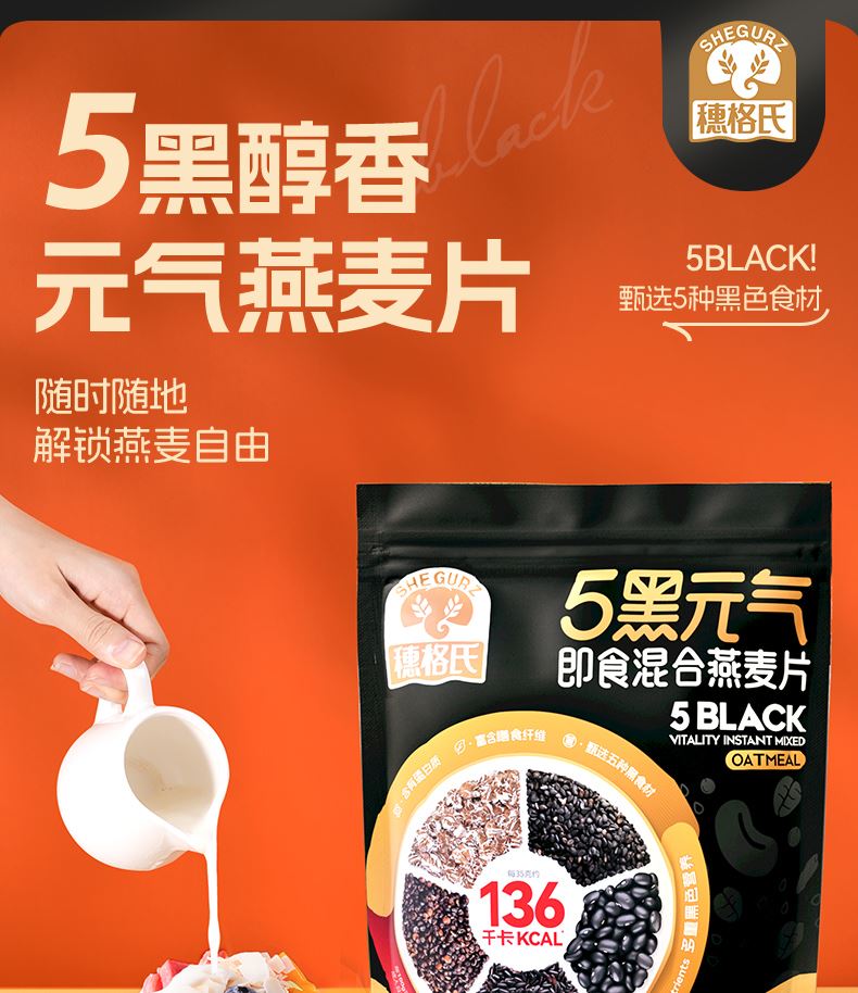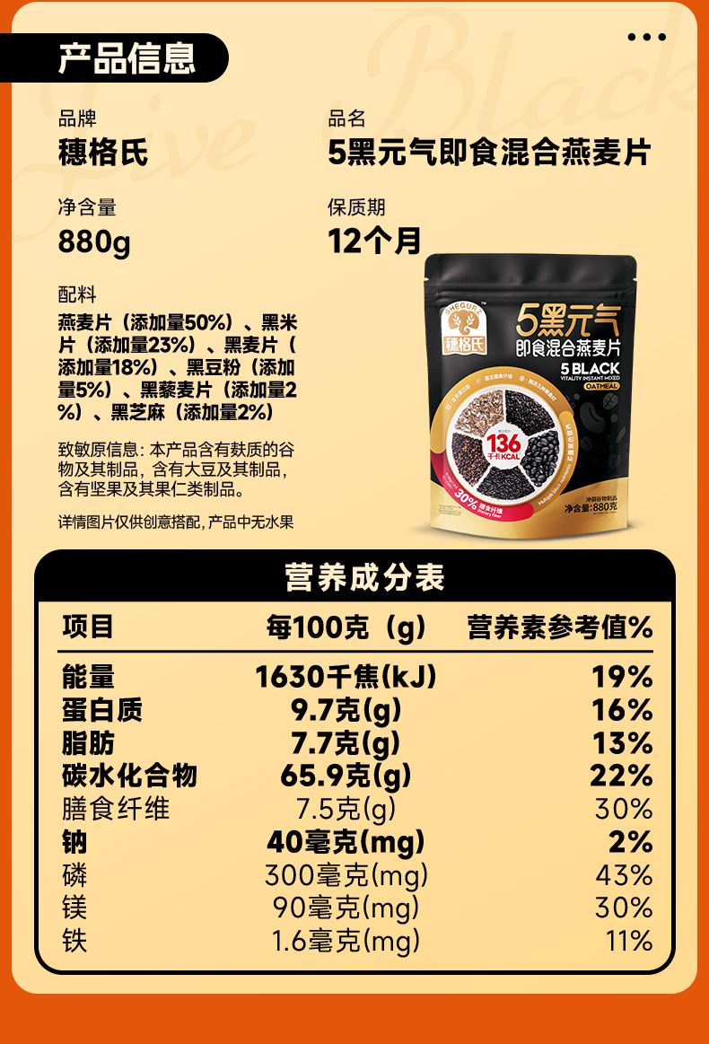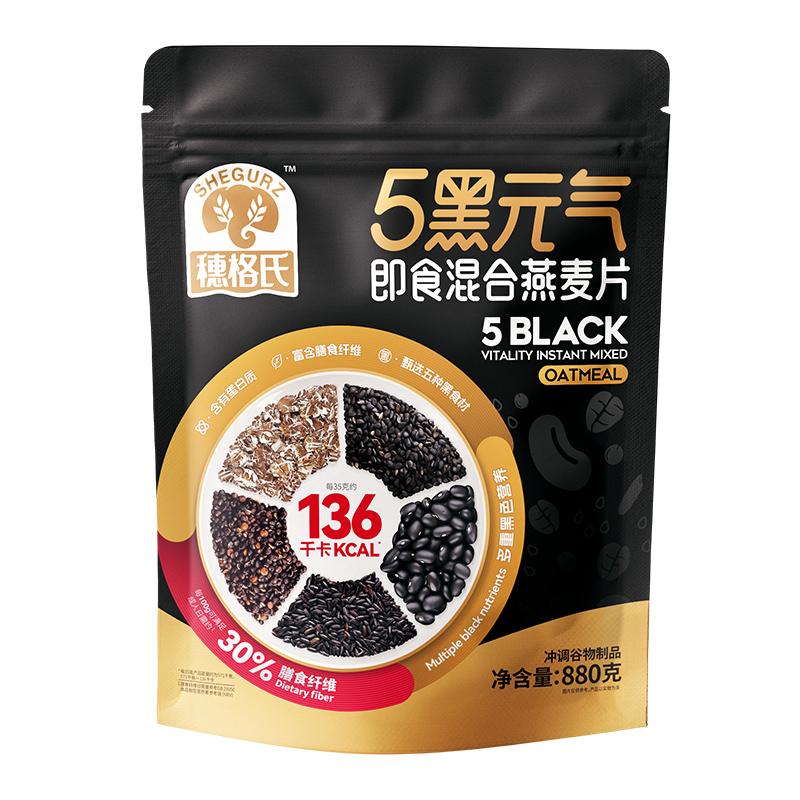 穗格氏5黑混合燕麦片880g袋装 配料表:燕麦片、黑米片、黑麦片、黑豆粉、黑藜麦片、黑芝麻。 1,食养原料: 黑小麦-高纤低卡高蛋白 黑米-营养丰富 米香醇厚 黑芝麻-地道浓郁 黑色实力派 黑藜麦-“太空粮食”撸铁党福音 黑豆粉-加分搭档 豆香味十足 2,澳洲进口全燕麦,保留麸皮、胚芽、胚乳的多种营养; 3,本产品富含膳食纤维,代餐甄选。 4,适合多种人群,父母长辈,学生党,上班族。