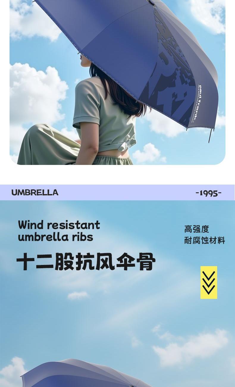 产品型号:PFU205 产品容量:58.5cm*12K 颜 色:蓝色 产品材质:铁/纤维/半遮光黑胶 产品配置: 伞*1