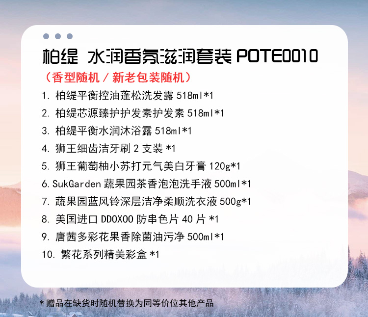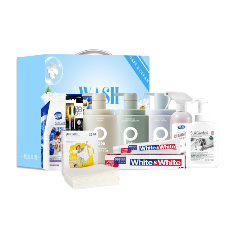 配置:(香型随机/新老包装随机) 1.柏缇平衡控油蓬松洗发露518ml*1 2.柏缇芯源臻护护发素护发素518ml*1 3.柏缇平衡水润沐浴露518ml*1 4.狮王细齿洁牙刷2支装*1 5.狮王葡萄柚小苏打元气美白牙膏120g*1 6.SukGarden蔬果园茶香泡泡洗手液500ml*1 7.蔬果园蓝风铃深层洁净柔顺洗衣液500g*1 8.美国进口DDOXOO防串色片40片*1 9.唐茜多彩花果香油污净500ml*1 10.繁花系列精美彩盒*1