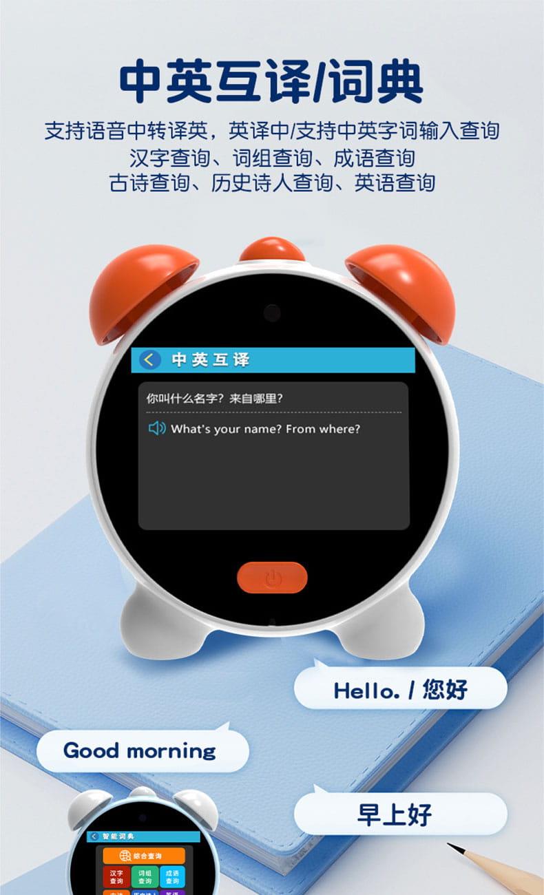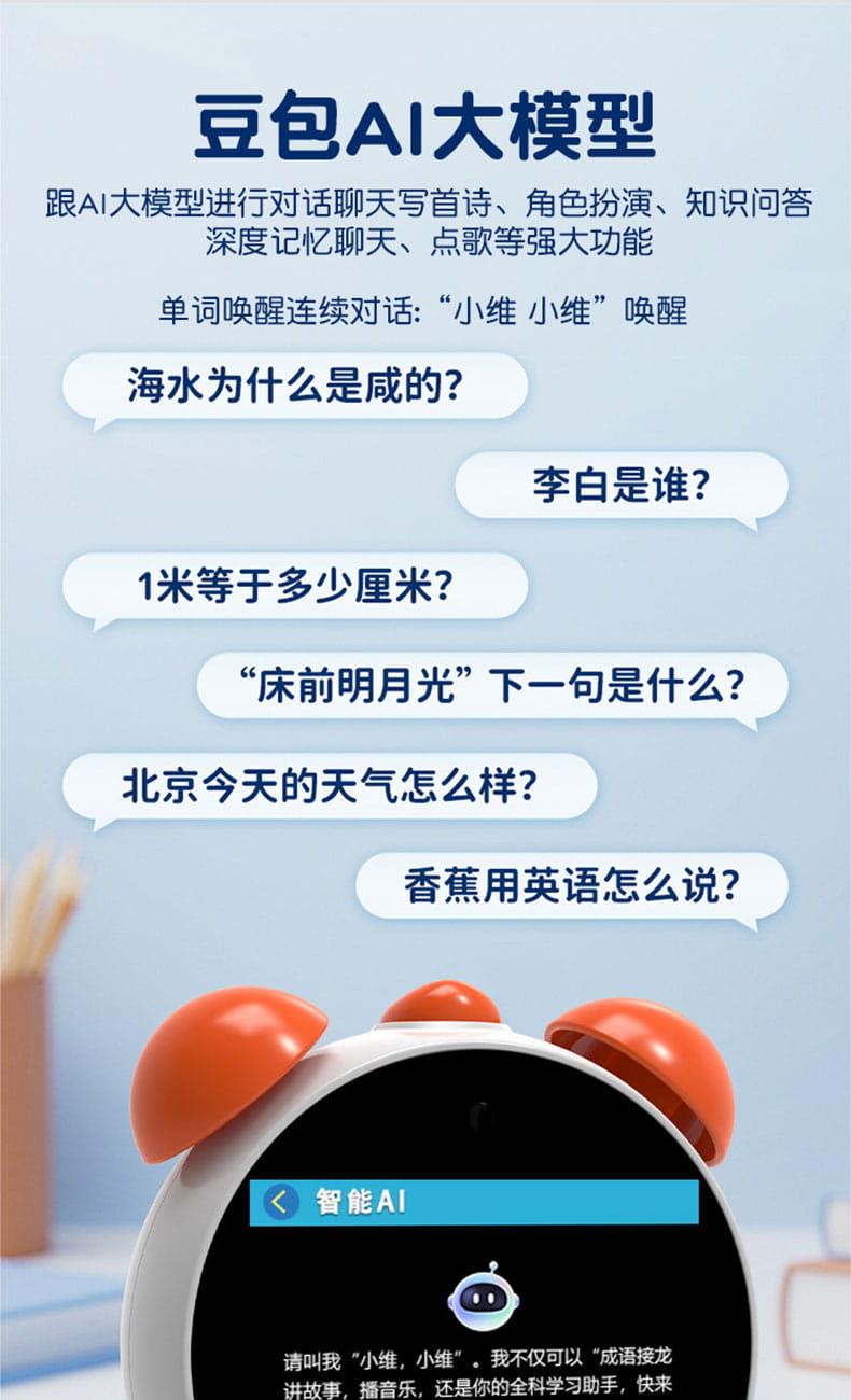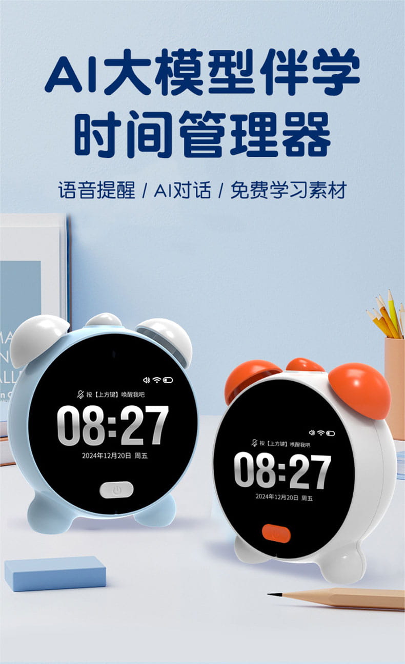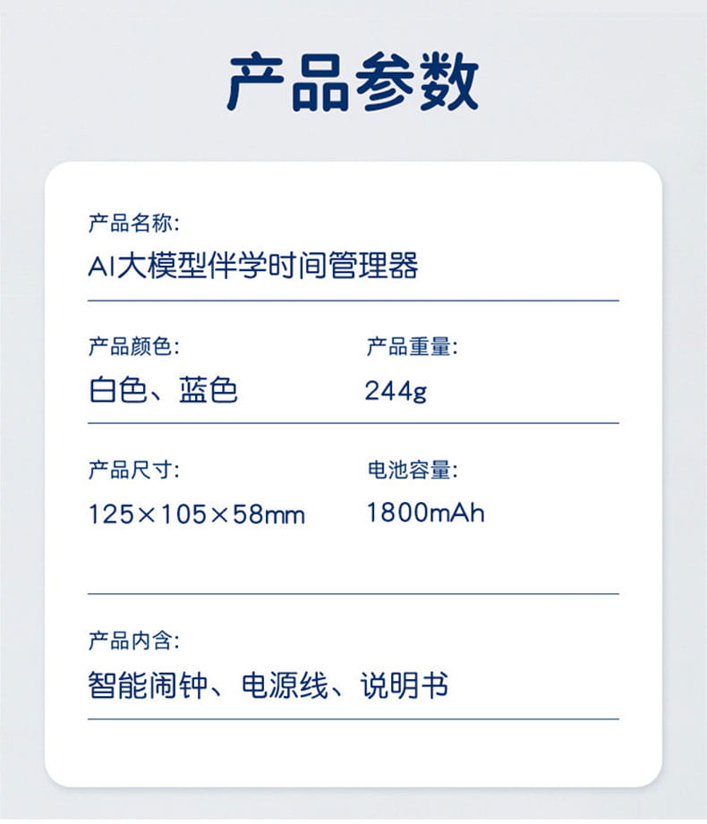产品尺寸:125*105*58mm 电池容量:1800mAh 操作方式:触控 连接方式:WIFI 产品颜色:白色、蓝色 整套毛重:244g 整箱数量:60 智能语音交互,语音唤醒,智能问答,语音查词 番茄时间管理法,可设置50组闹钟 内置喜马拉雅少儿 科大讯飞星火大模型后台 内置豆包AI
