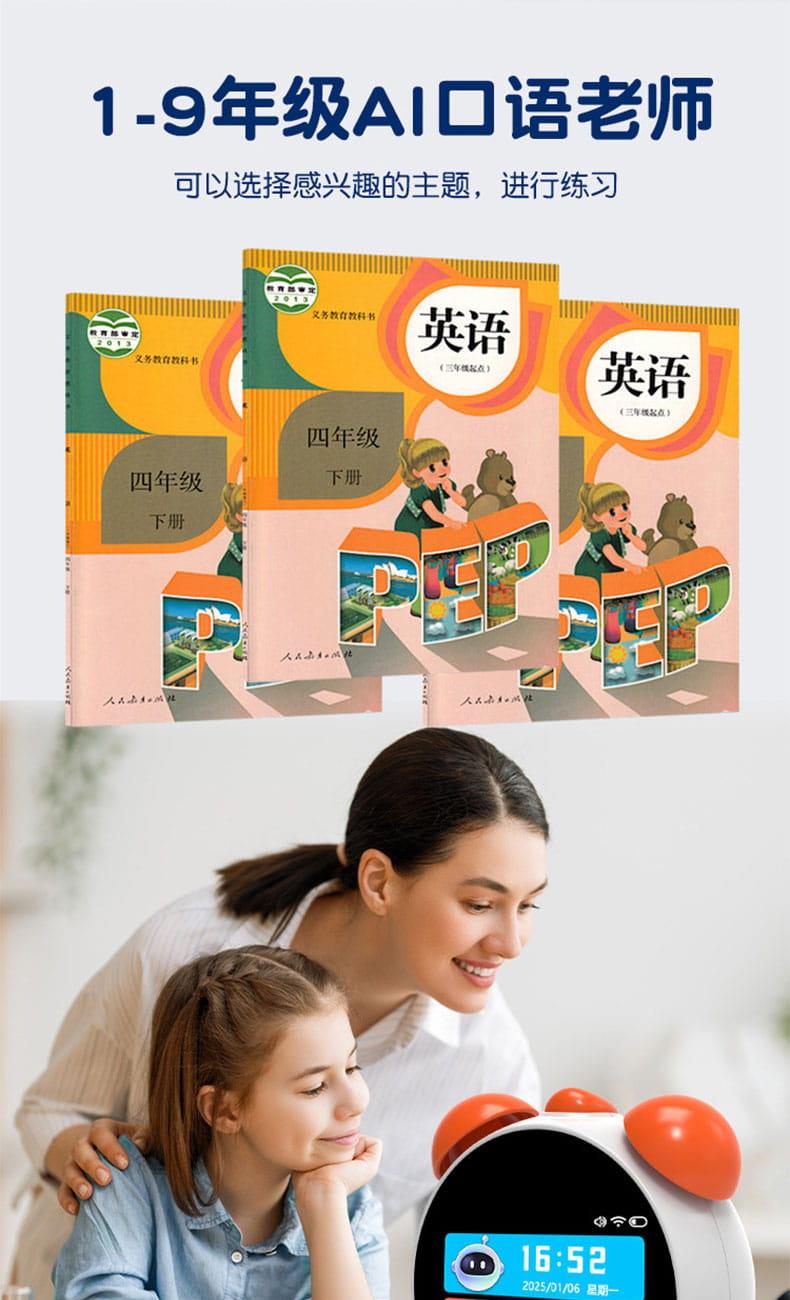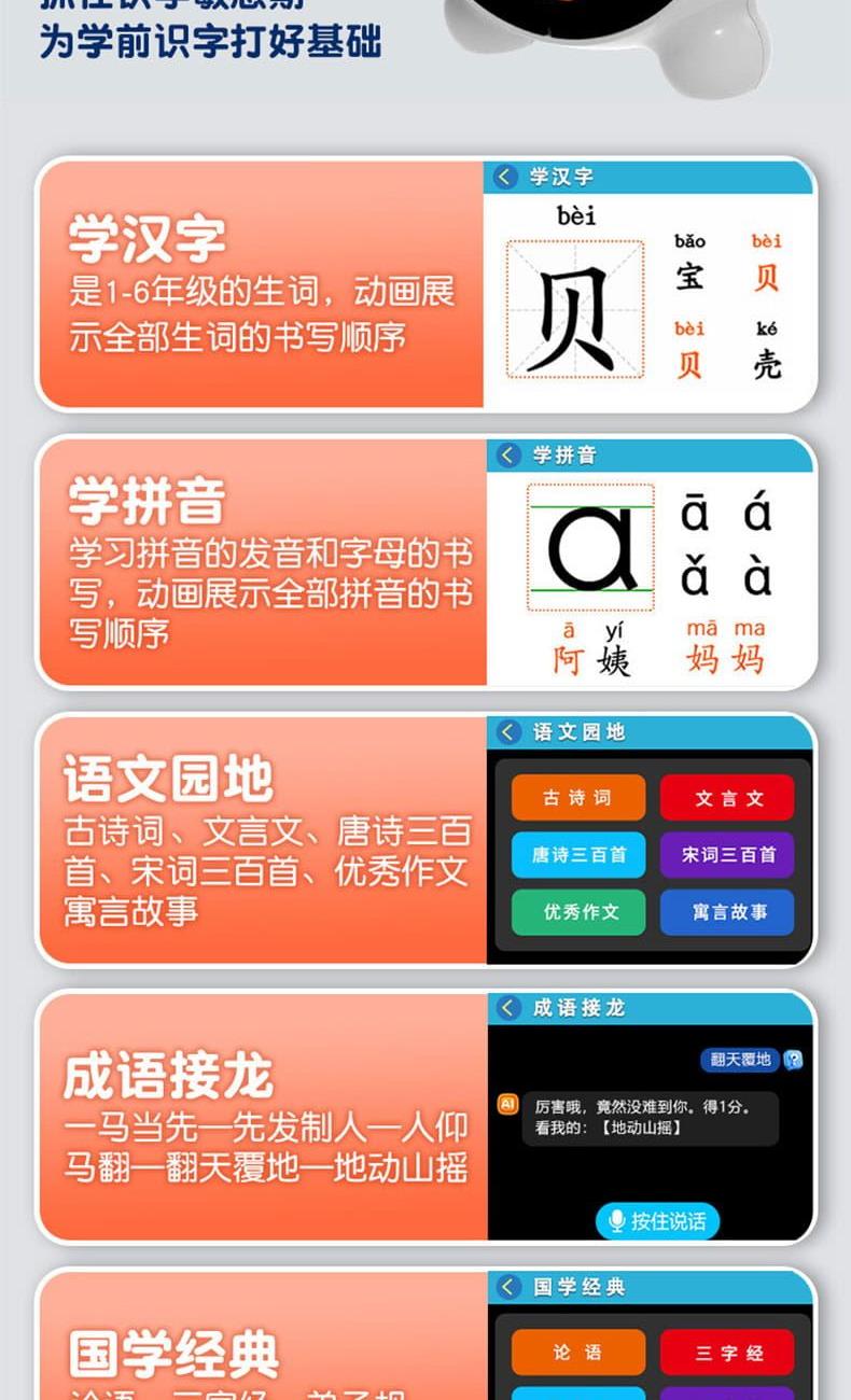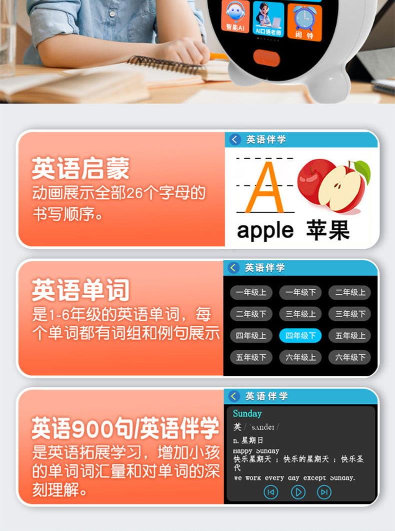 产品尺寸:125*105*58mm 电池容量:1800mAh 操作方式:触控 连接方式:WIFI 产品颜色:白色、蓝色 整套毛重:244g 整箱数量:60 智能语音交互,语音唤醒,智能问答,语音查词 番茄时间管理法,可设置50组闹钟 内置喜马拉雅少儿 科大讯飞星火大模型后台 内置豆包AI