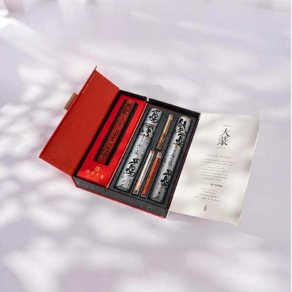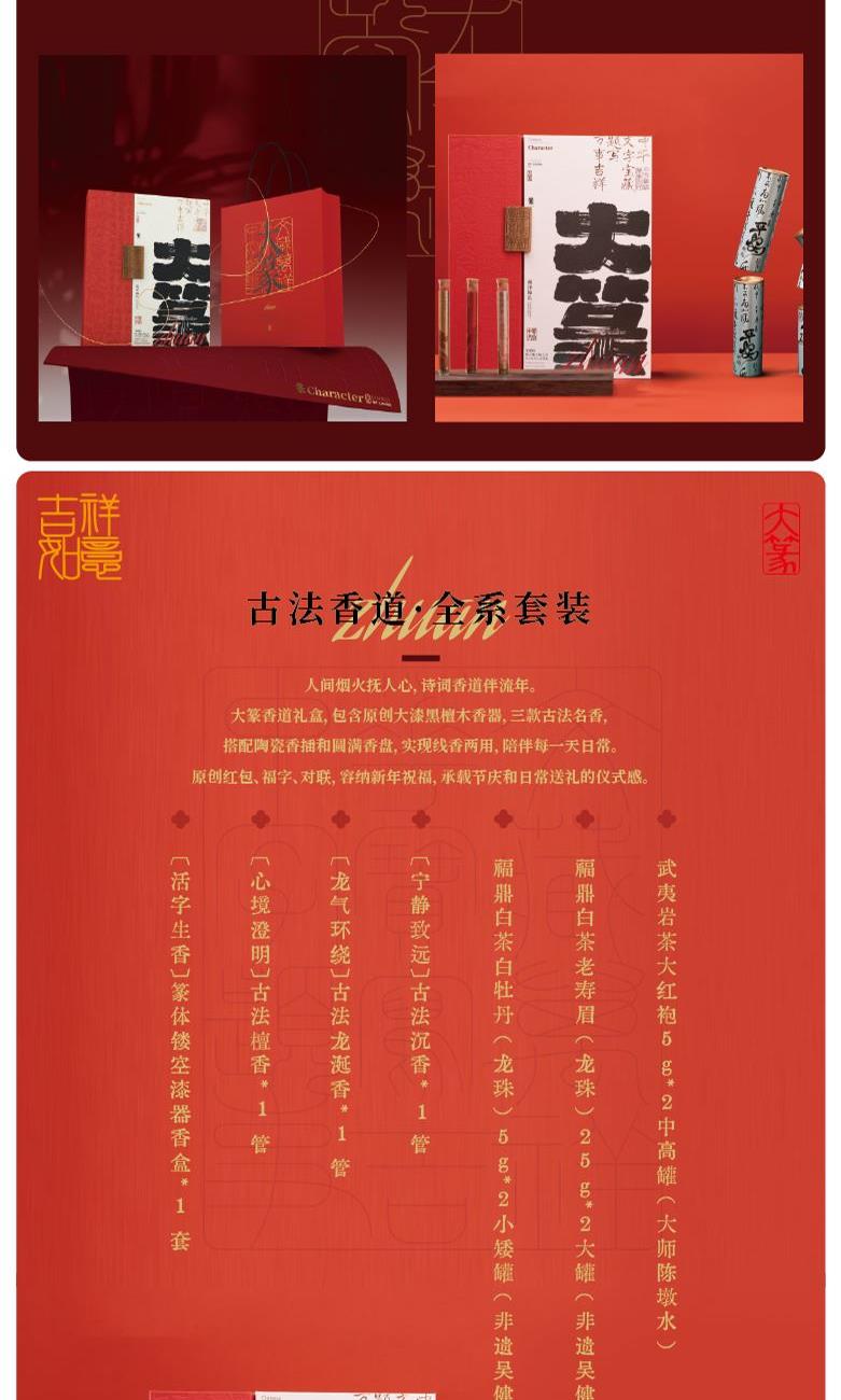 【龙气环绕】古法龙涎香*1套 【活字声香】篆体镂空漆器香盒*1套 【心境澄明】古法檀香 【宁静致远】古法沉香*1管 福鼎白茶白牡丹(龙珠)5g*2小矮罐(非遗吴健) 福鼎白茶老寿眉(龙珠)25g*2大罐(非遗吴健) 武夷岩茶大红袍5g*2中高罐(大师陈墩水)