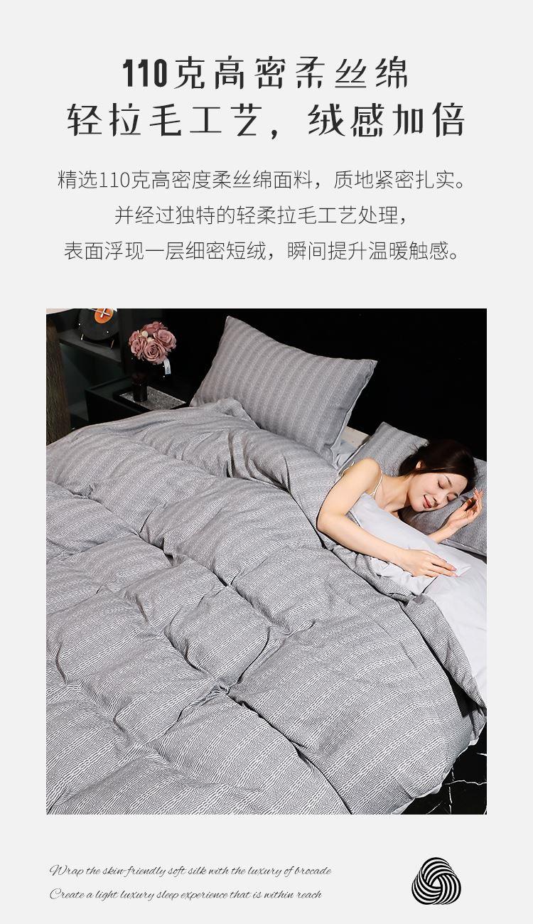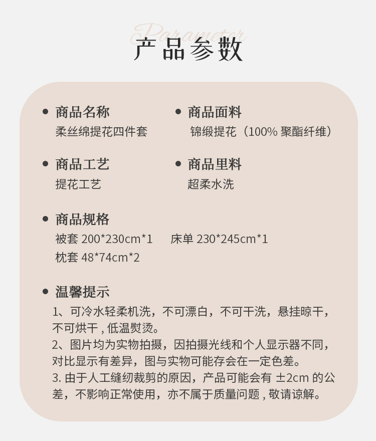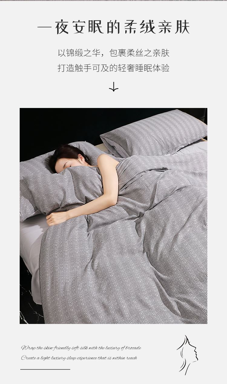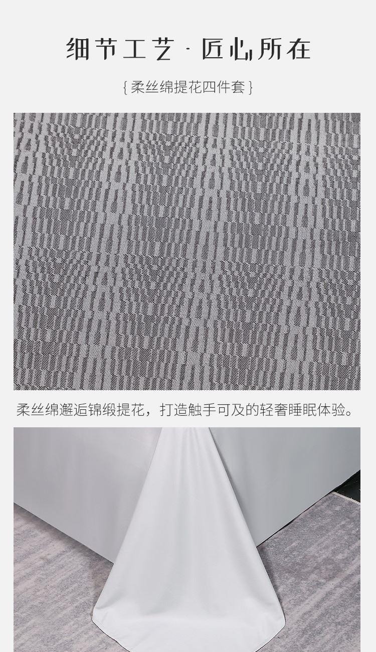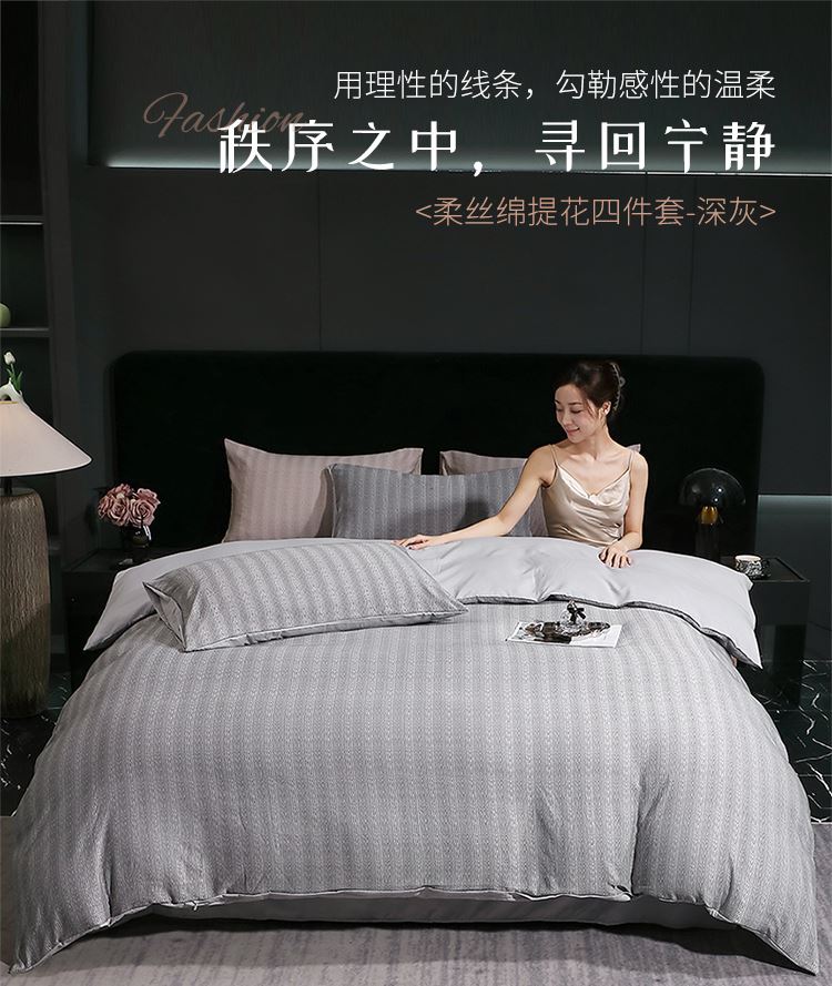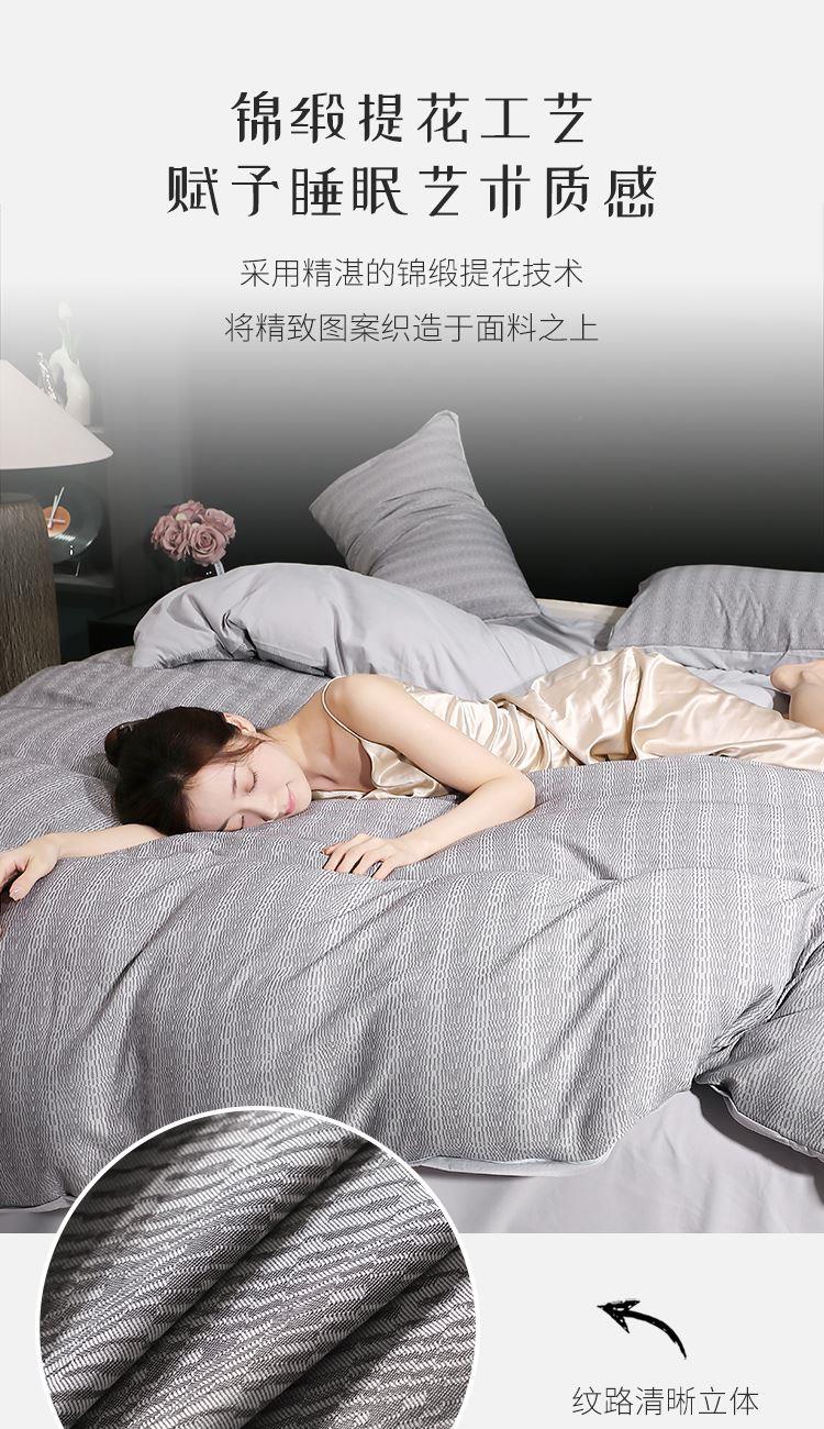 型 号: HS-J-XW25401 面 料: 锦缎提花(聚酯纤维) 底 料 :超柔水洗 规 格 : 被套200*230cm*1 床单230*245cm*1 枕套48*74cm*2 产品说明: 2025秋冬炫色锦丝缎提花四件套,优雅的提花工艺,胜于普通印花。环保活性印染,布面色泽鲜亮,垂悬感优。110克高密克重,轻拉毛,绒感更强。里面搭配亲肤纯色超柔面料,手感细腻,亲肤性佳。暗合被套,直角床单,信封枕,简约大气,是一款适合四季使用的居家床品。