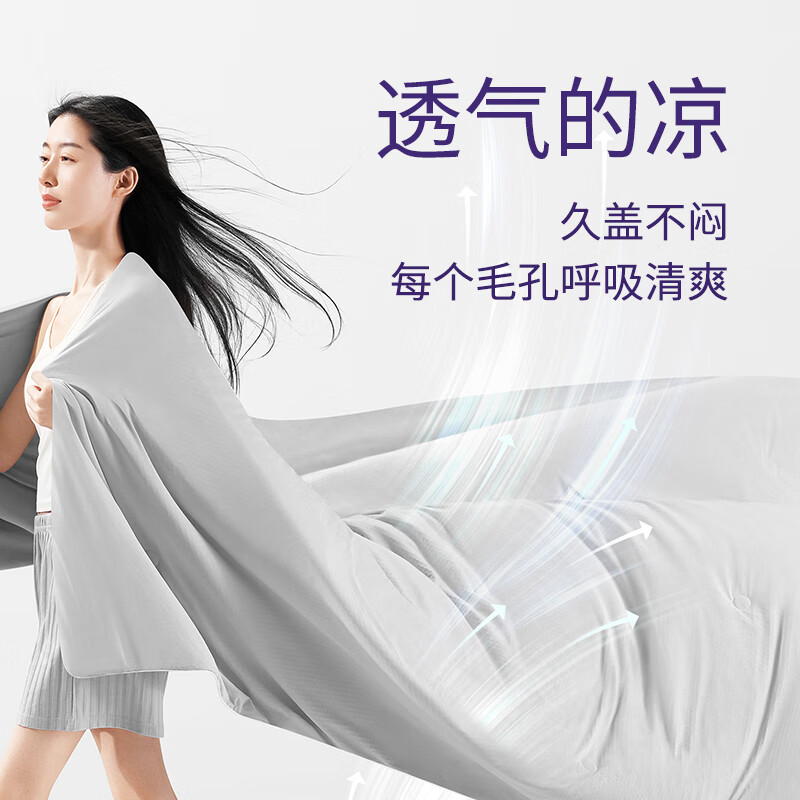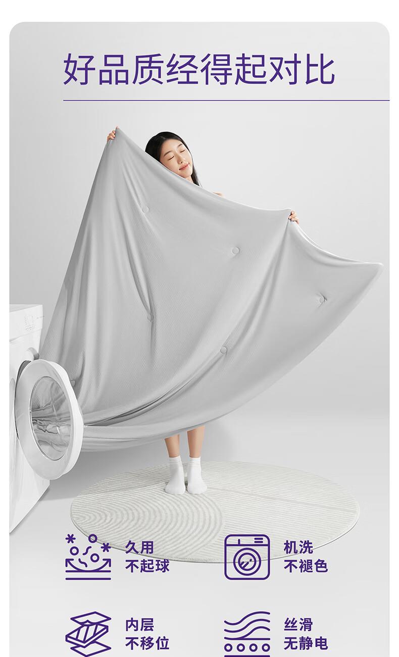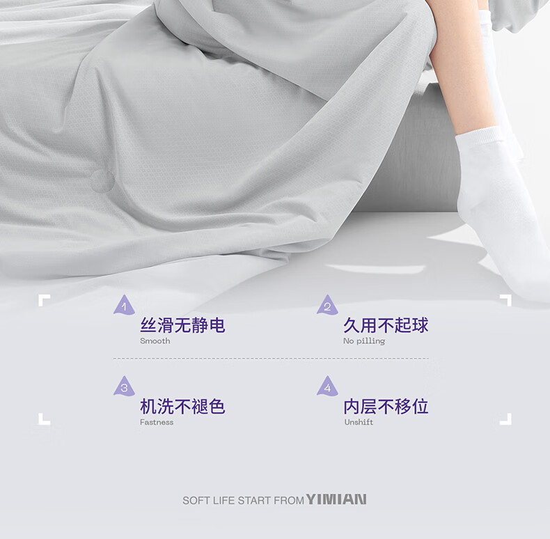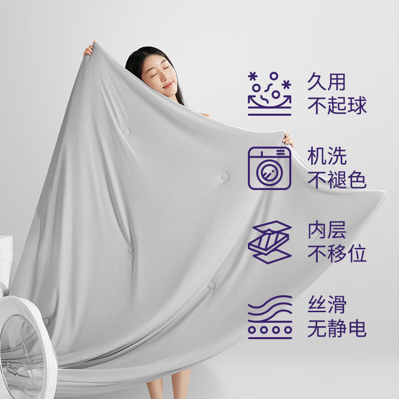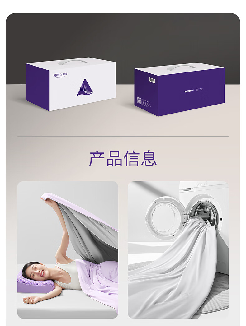 【产品颜色】 温和中灰 【产品材质】 面料: A面:86%聚酯纤维 14%氨纶 B面【八孔提花】:86%聚酯纤维 14%氨纶 【产品规格】180*200cm 【产品重量】约1.8KG 【包装尺寸】手提式礼盒:38*18*18cm 【每箱数量】9个 产品主卖点: 即刻凉感 1.显而易见的透气性 2.专研芯体防钻毛,不起球 3.双c检测A类品质
