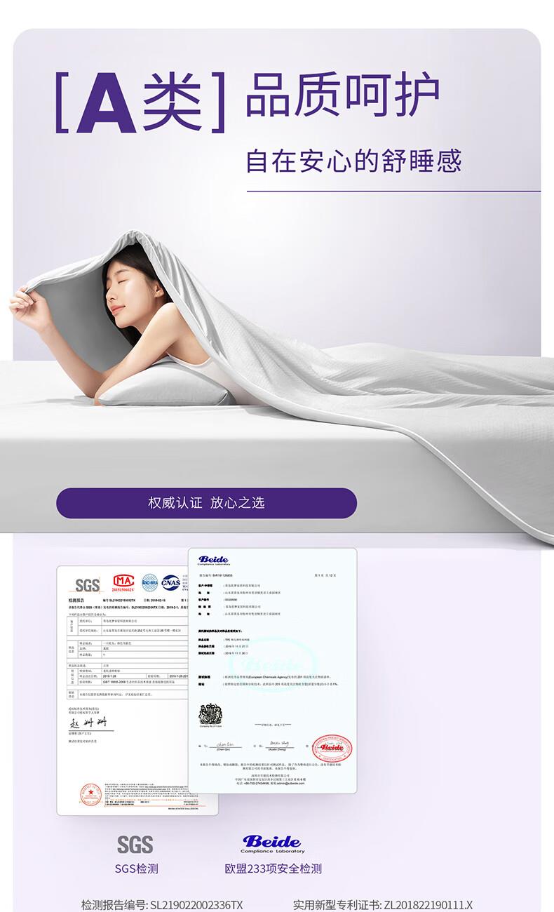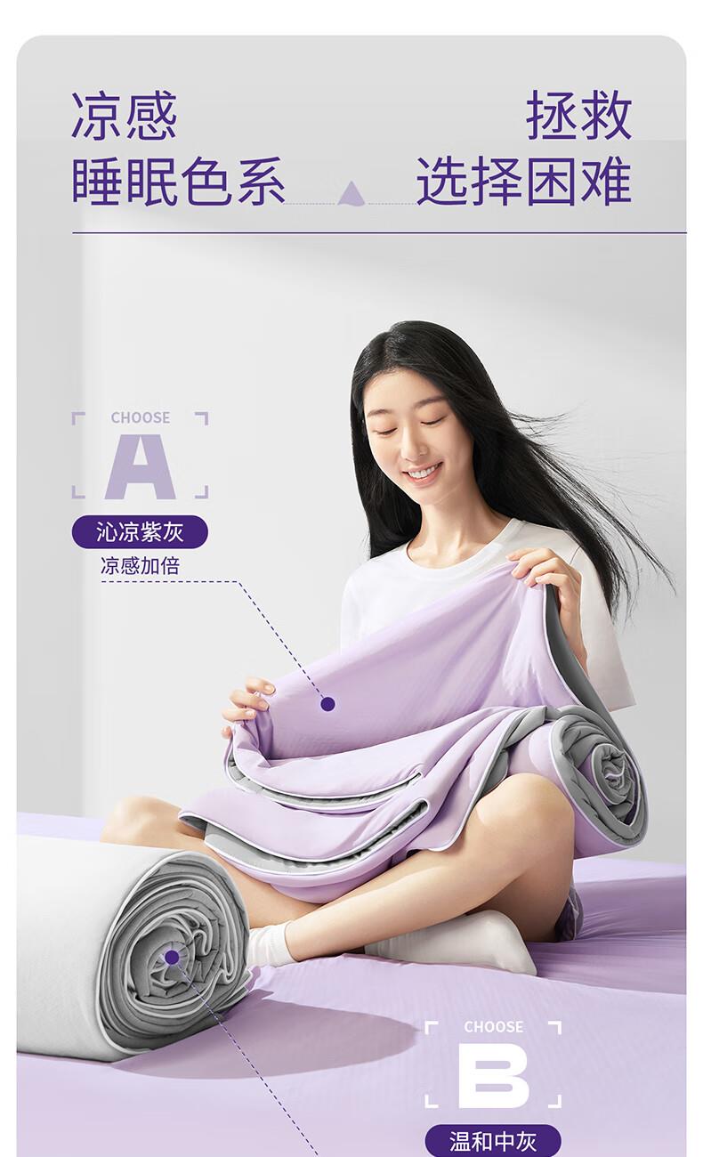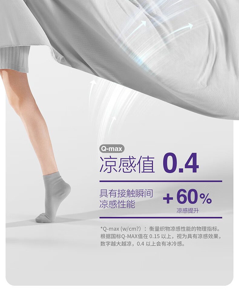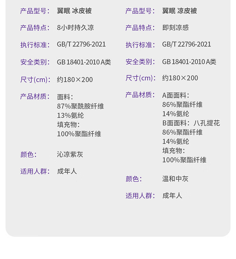 【产品颜色】 温和中灰 【产品材质】 面料: A面:86%聚酯纤维 14%氨纶 B面【八孔提花】:86%聚酯纤维 14%氨纶 【产品规格】180*200cm 【产品重量】约1.8KG 【包装尺寸】手提式礼盒:38*18*18cm 【每箱数量】9个 产品主卖点: 即刻凉感 1.显而易见的透气性 2.专研芯体防钻毛,不起球 3.双c检测A类品质