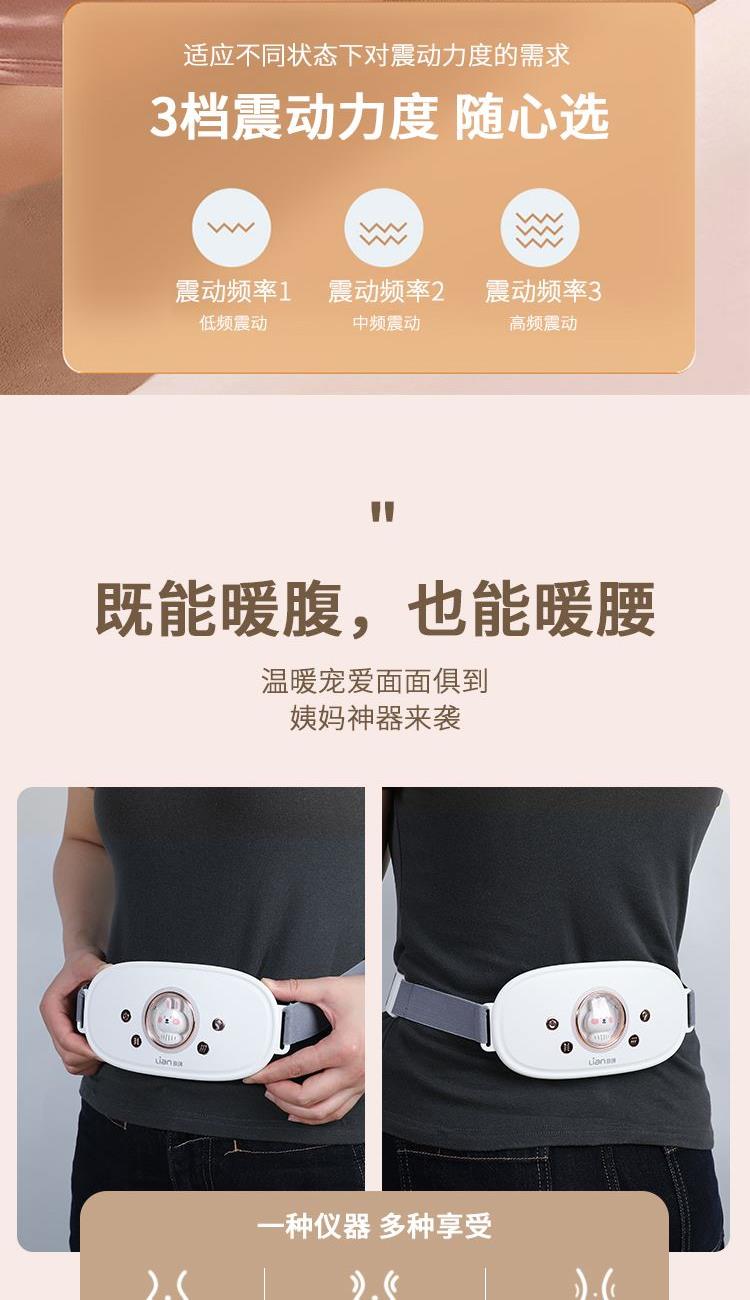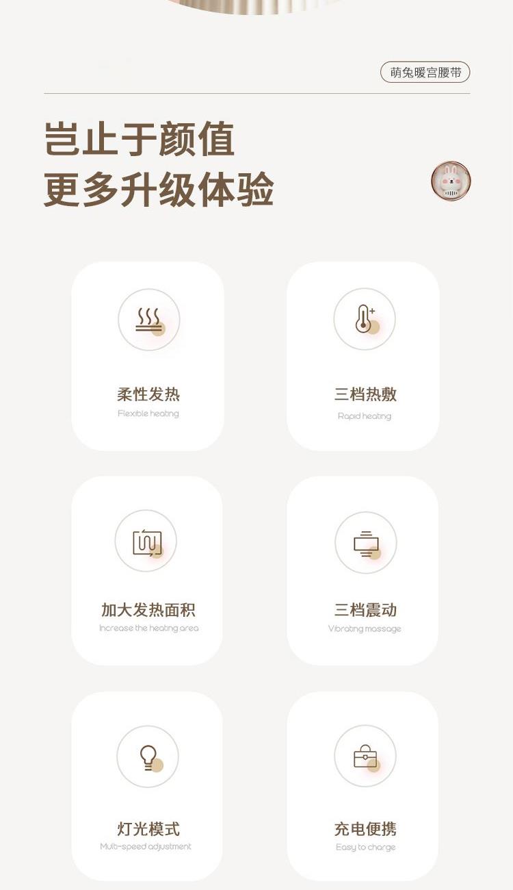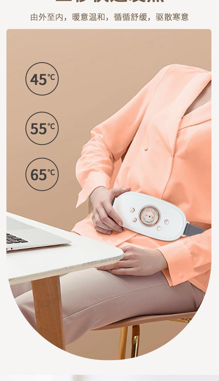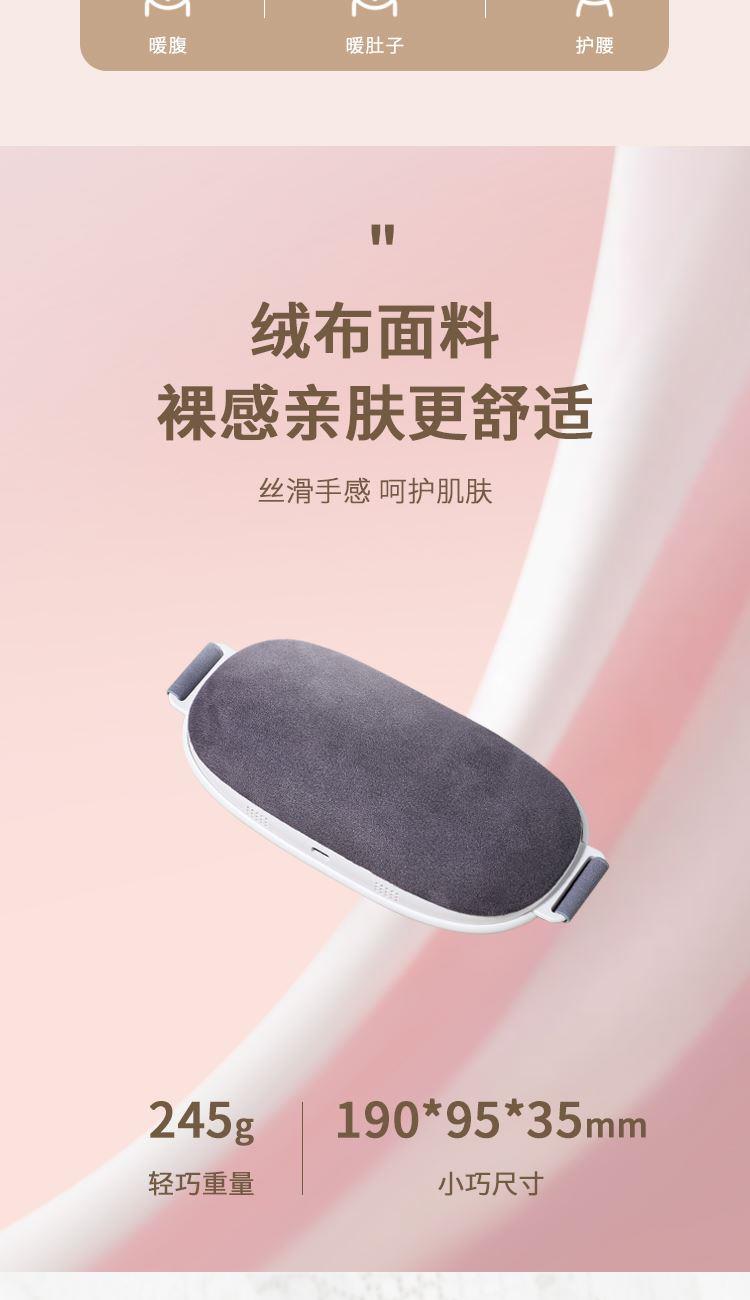 产品参数 充电电压:5V 充电电流:1A 工作电压:3.7V 额定功率:5W 电池规格:3.7V/1800mAh 材质:ABS 绒布 产品净重:0.25kg 产品毛重:0.38kg 彩盒尺寸:240×121×67mm 产品特点 1、恒温热敷,暖宫驱寒,缓解经期疼痛好帮手; 2、三档温度调节,45°,55°,65°; 3、三档多点震动,仿真按摩,舒缓不适; 4、氛围夜灯,温馨舒适;轻巧便捷,可随身携带; 5、弹性松紧带,可以随意调节长短; 6、不止暖宫,还可缓解腰酸背痛。