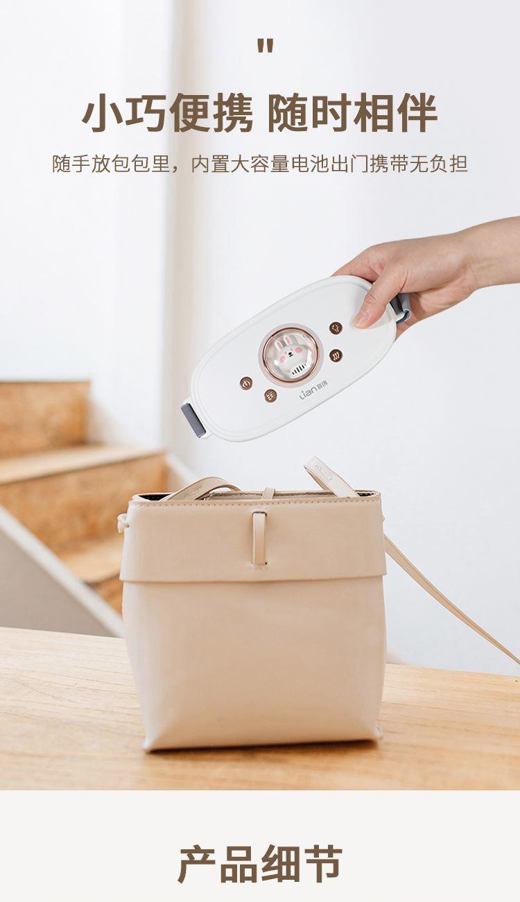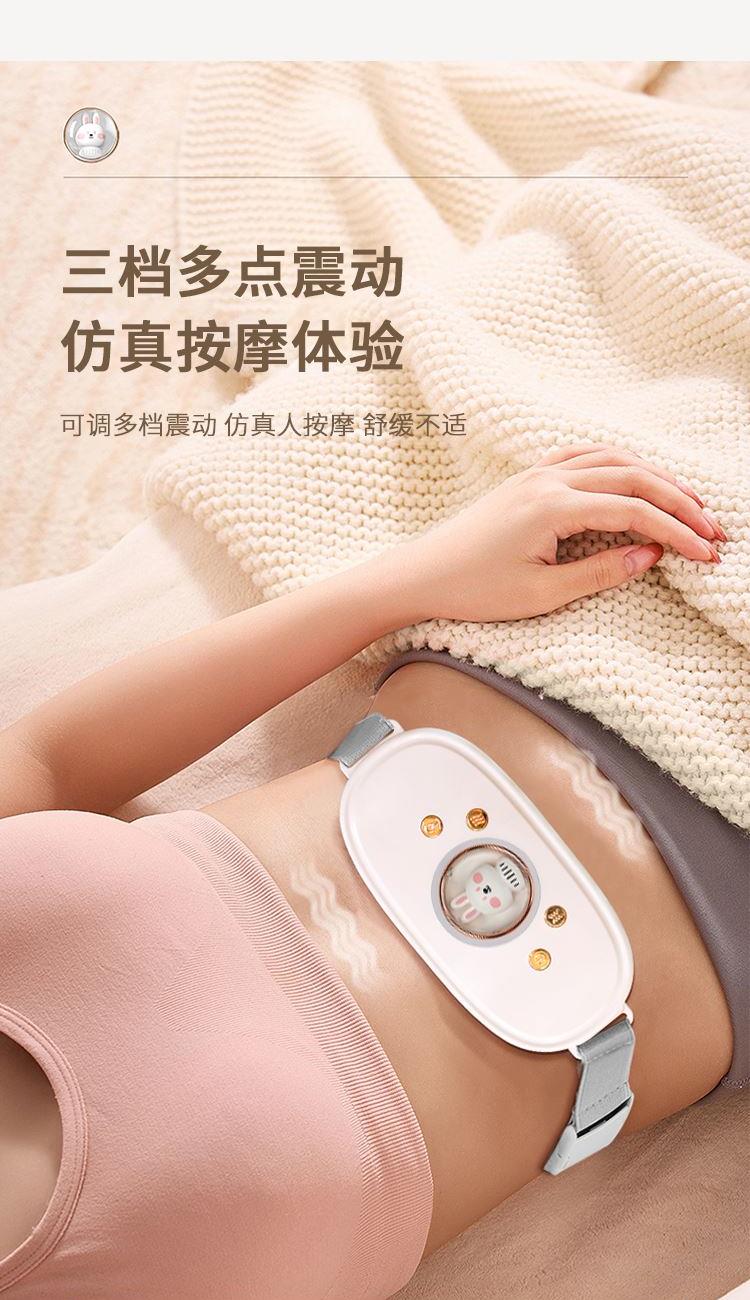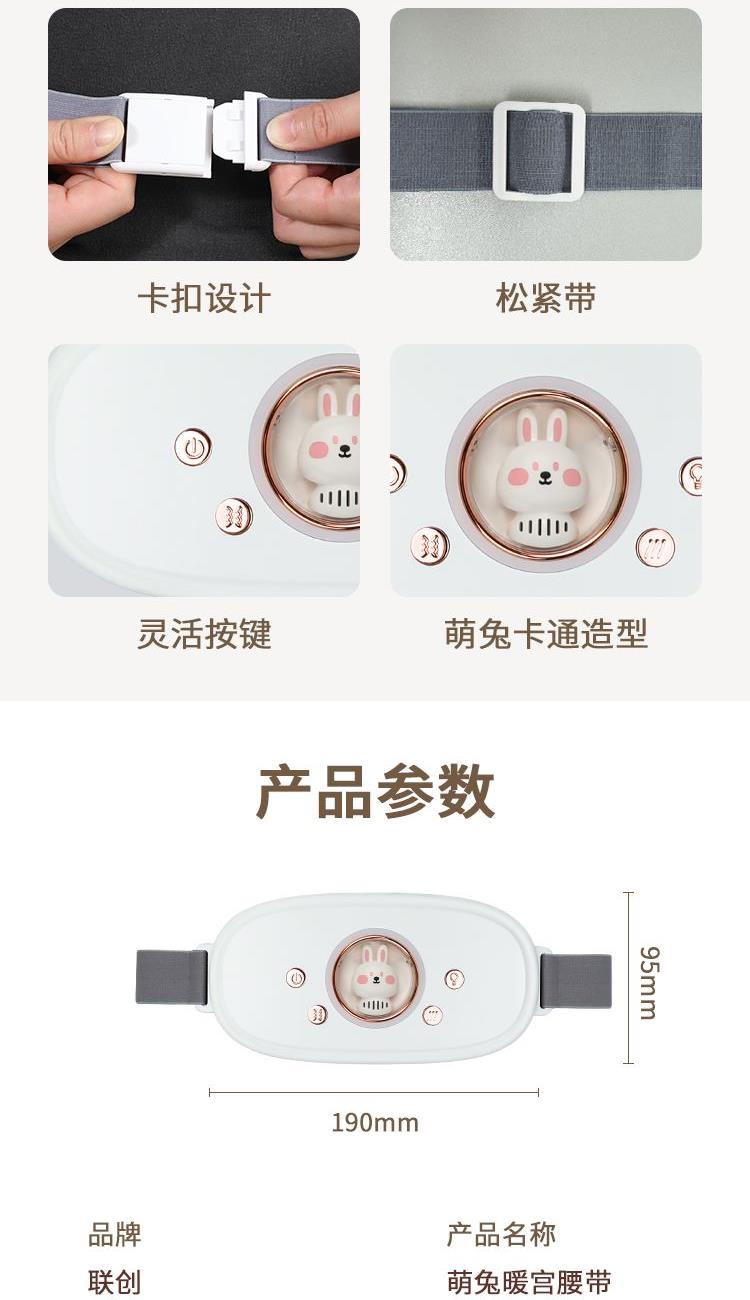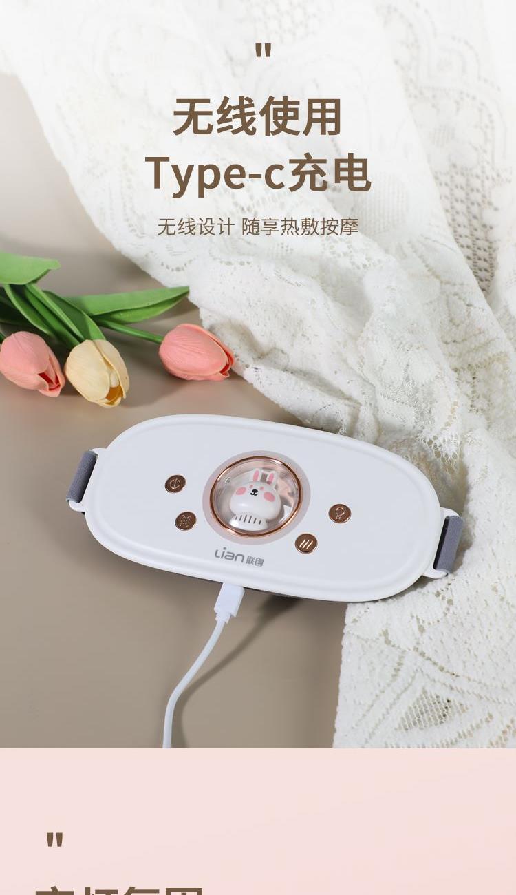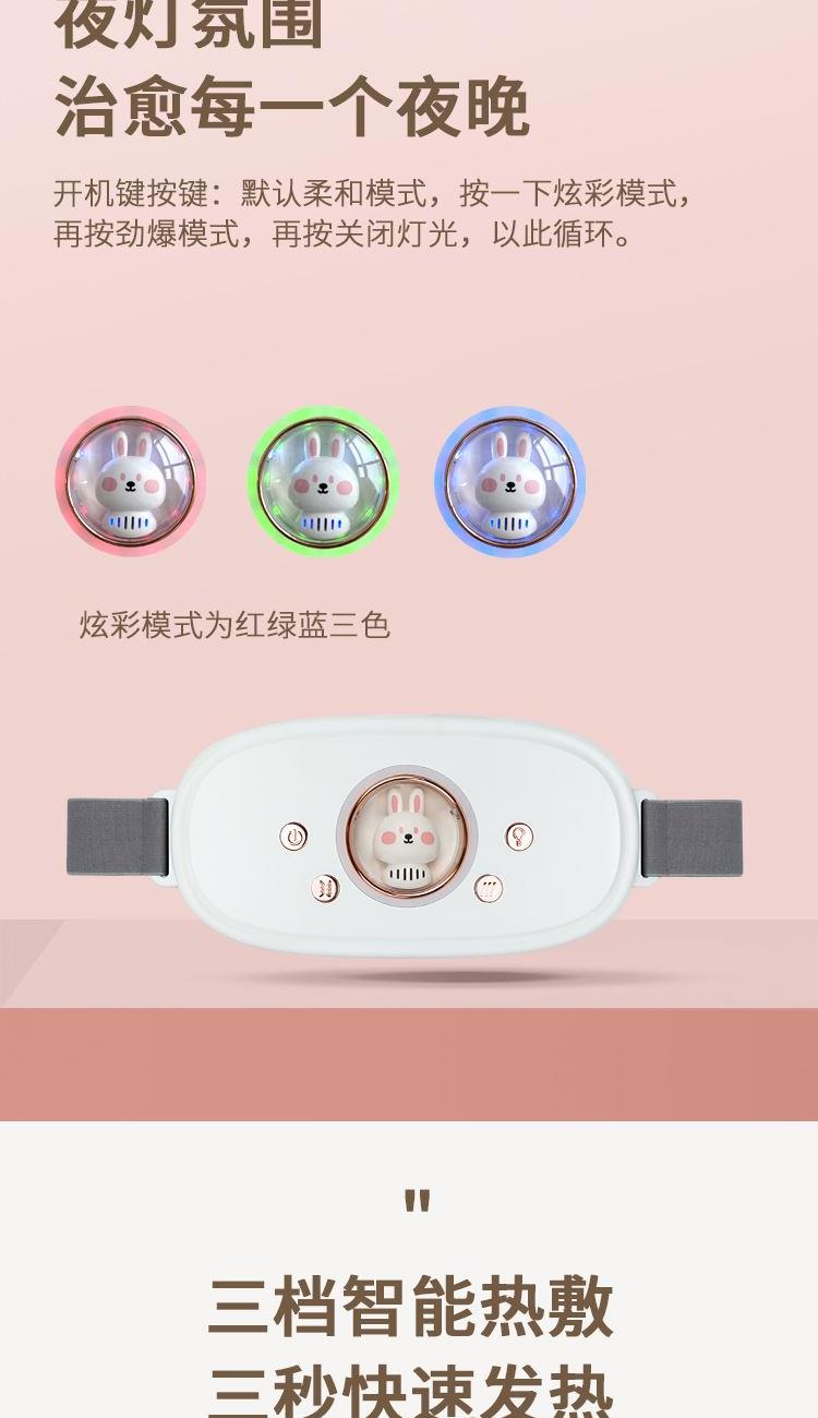 产品参数 充电电压:5V 充电电流:1A 工作电压:3.7V 额定功率:5W 电池规格:3.7V/1800mAh 材质:ABS 绒布 产品净重:0.25kg 产品毛重:0.38kg 彩盒尺寸:240×121×67mm 产品特点 1、恒温热敷,暖宫驱寒,缓解经期疼痛好帮手; 2、三档温度调节,45°,55°,65°; 3、三档多点震动,仿真按摩,舒缓不适; 4、氛围夜灯,温馨舒适;轻巧便捷,可随身携带; 5、弹性松紧带,可以随意调节长短; 6、不止暖宫,还可缓解腰酸背痛。