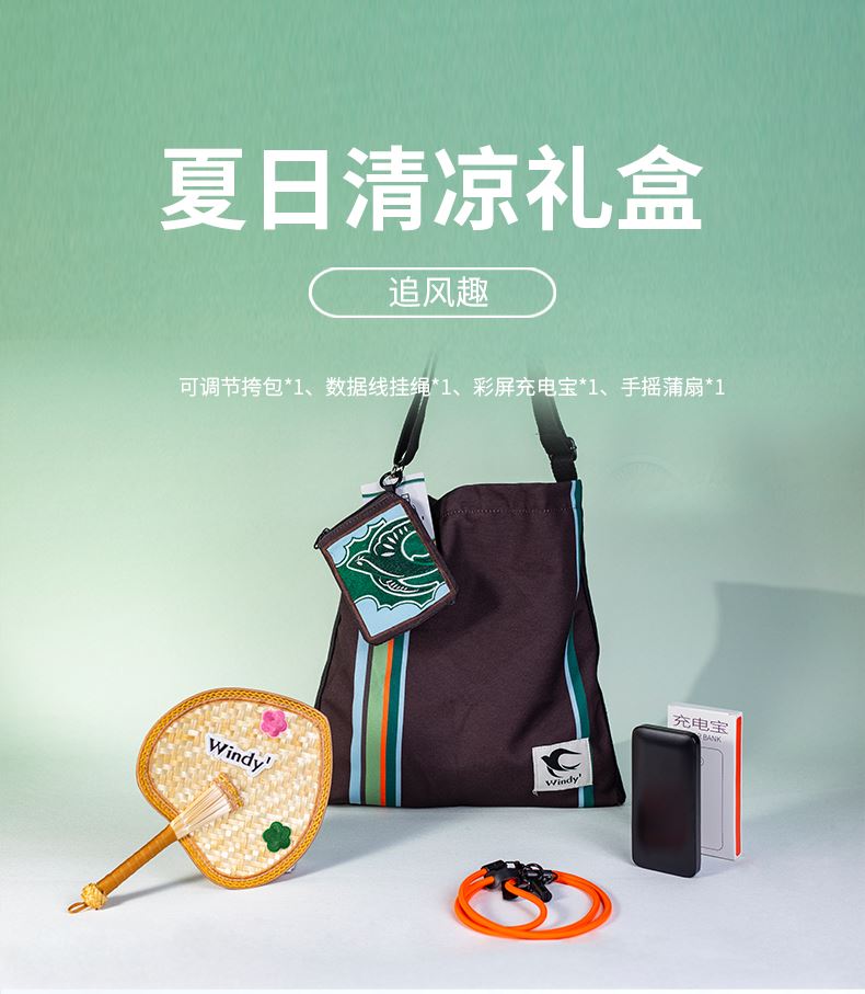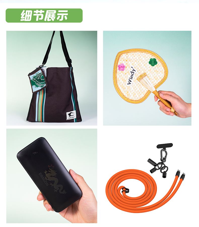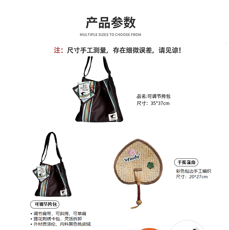 礼盒参数: 挎包尺寸:35*37cm 外箱尺寸:45*36*40cm 套装重量:1090g/套 详细介绍: 1.调节肩带,可斜挎、可单肩 • 提花刺绣卡包,灵活拆卸 • 外材质涤纶、内料黑色桃皮绒 2.手摇蒲扇 彩色包边手工编织 尺寸:20*27cm 3.彩屏灯光充电宝 容量:10000mAH 输入电压/电流: 5V 2.4A 输出功率:10W MAX 4.数据线挂绳 手机挂绳/三头数据线 尺寸:长120cm