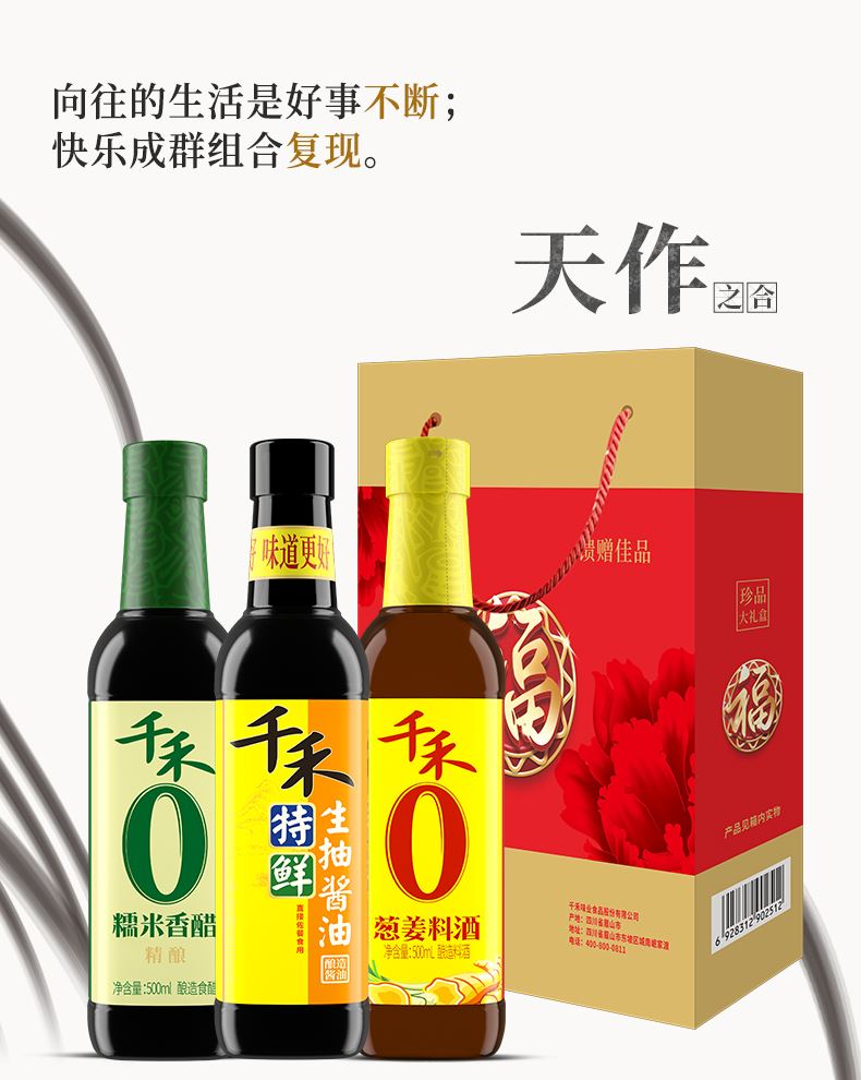 千禾福沁本鲜礼盒1500ml,内配: 千禾特鲜生抽酿造酱油500ml 千禾糯米香醋精酿500ml 千禾葱姜料酒500ml