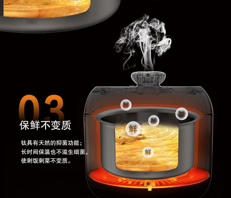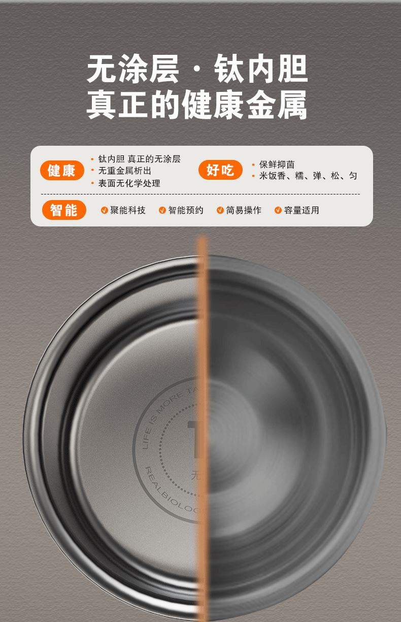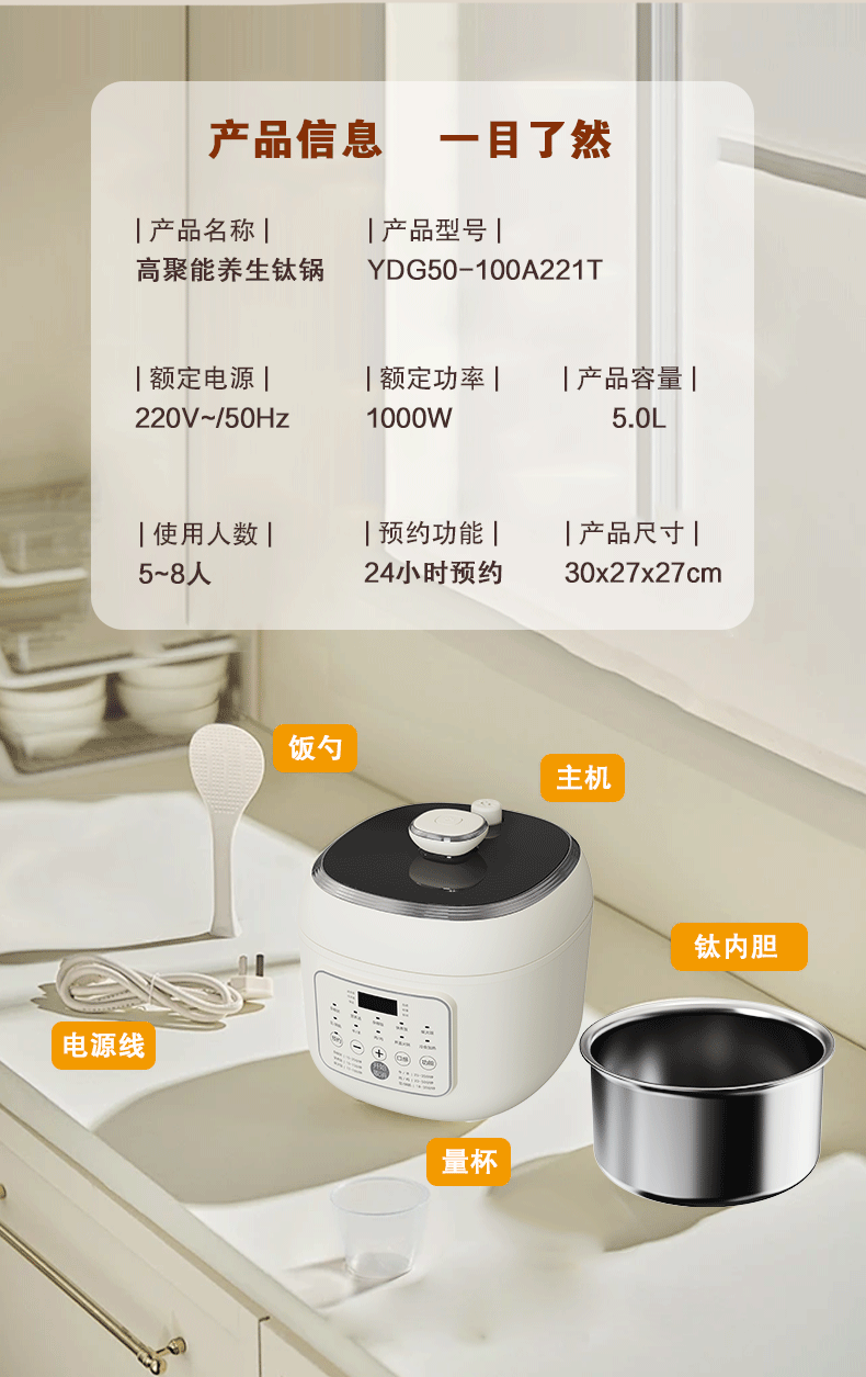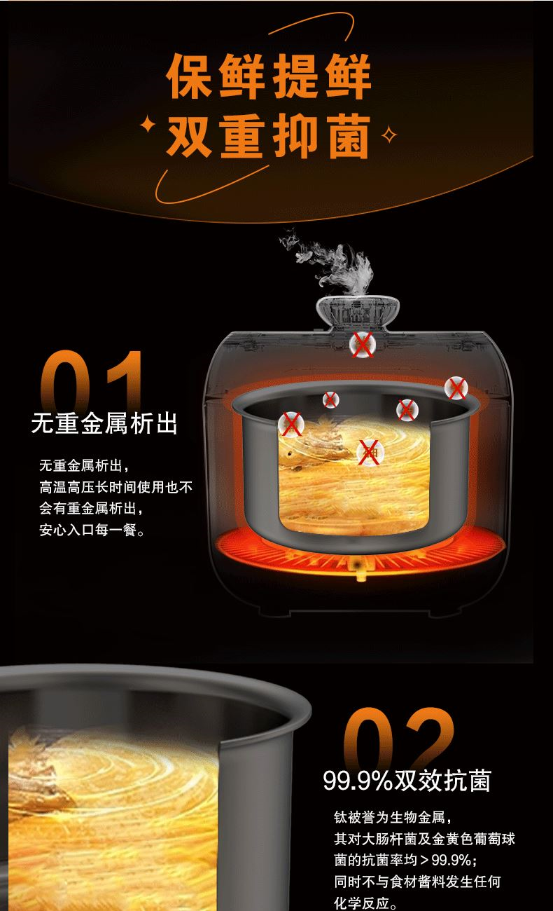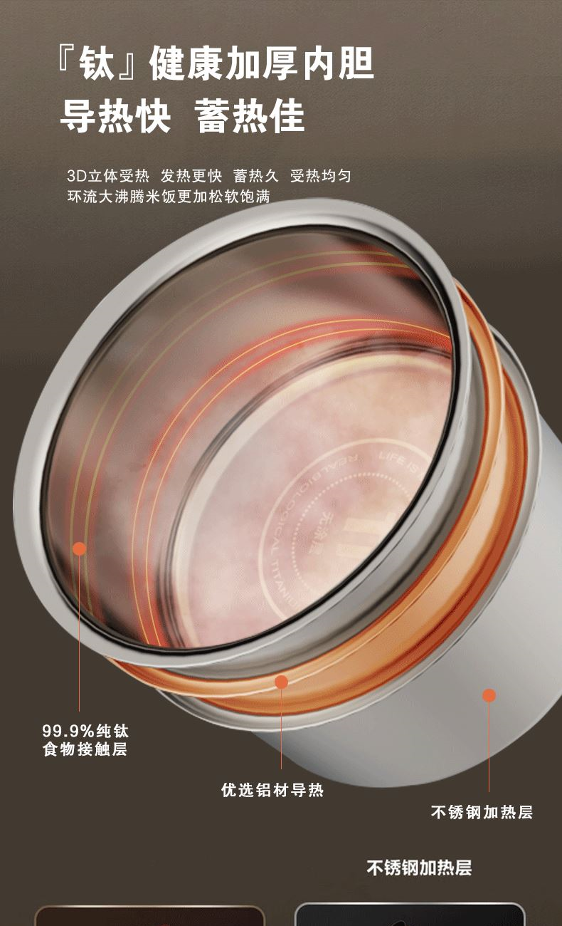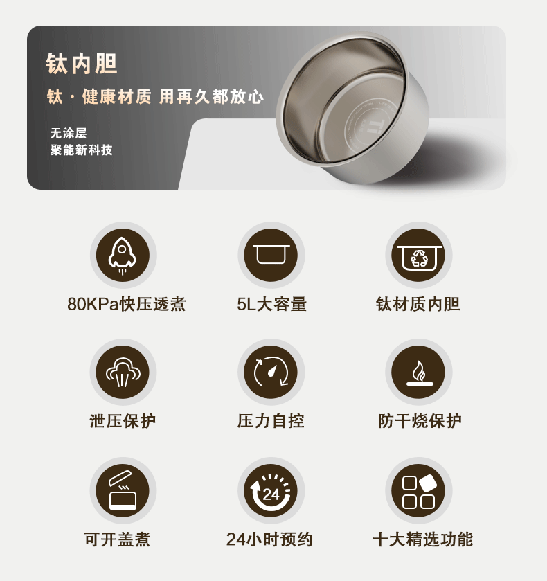 额定容量:5L 额定功率:1000W 内胆材质:钛+铝+钢 ※ 健康材料 -- 全新钛内胆 ※ 饭煲3.0时代 -- 0涂层 0重金属 0生锈 ※ 有效抑制细菌保鲜、保持食材原汁原味及安全健康 ※ 聚能技术科技 -- 80KPA高压高温聚能快速烹煮 ※ 软糯、标准、劲道三种口味选择 ※ 分体式上盖设计,一键泄压排压 ※ 智控程序 --十大预设菜单