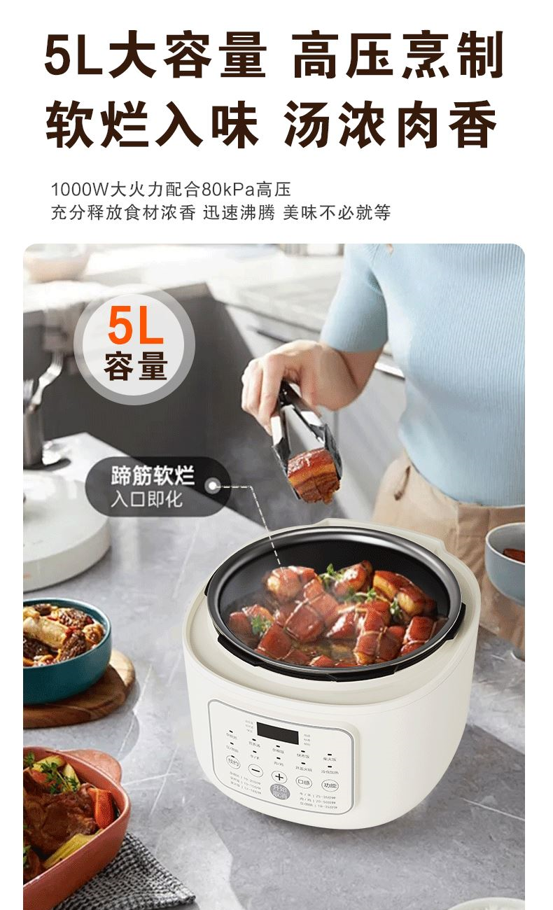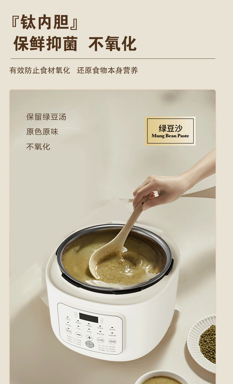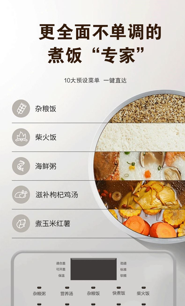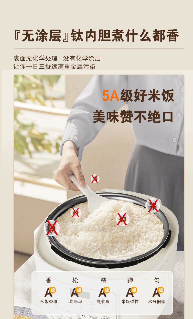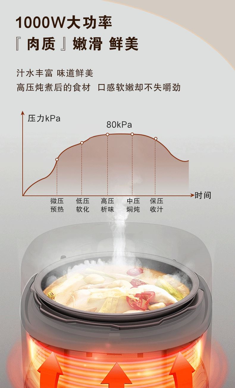 额定容量:5L 额定功率:1000W 内胆材质:钛+铝+钢 ※ 健康材料 -- 全新钛内胆 ※ 饭煲3.0时代 -- 0涂层 0重金属 0生锈 ※ 有效抑制细菌保鲜、保持食材原汁原味及安全健康 ※ 聚能技术科技 -- 80KPA高压高温聚能快速烹煮 ※ 软糯、标准、劲道三种口味选择 ※ 分体式上盖设计,一键泄压排压 ※ 智控程序 --十大预设菜单