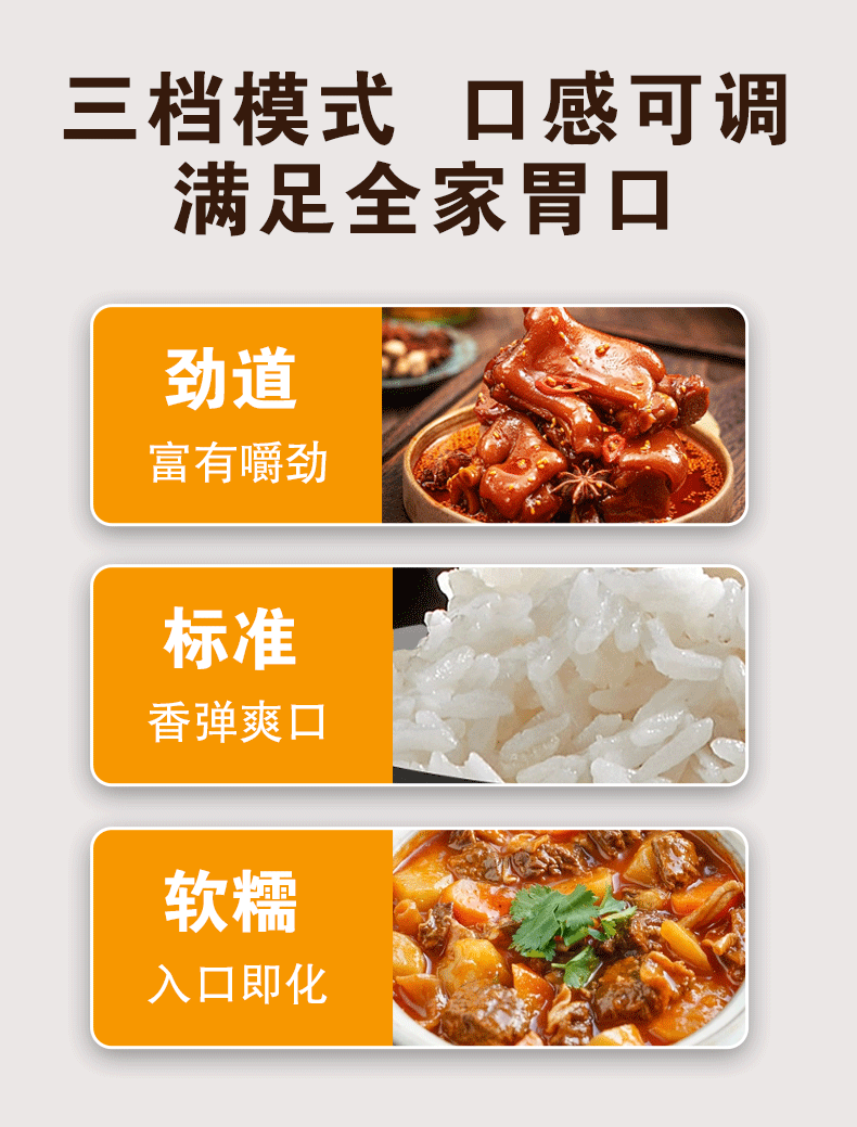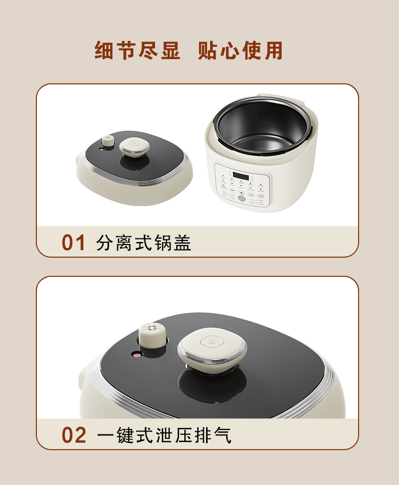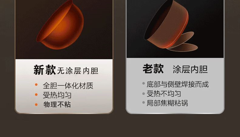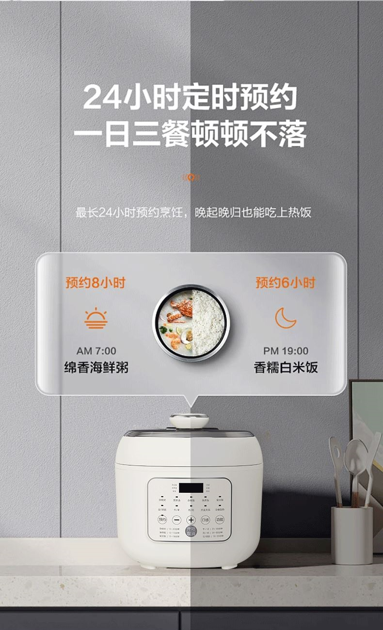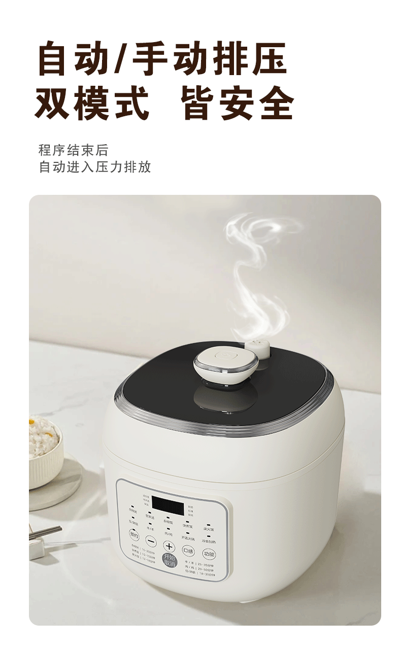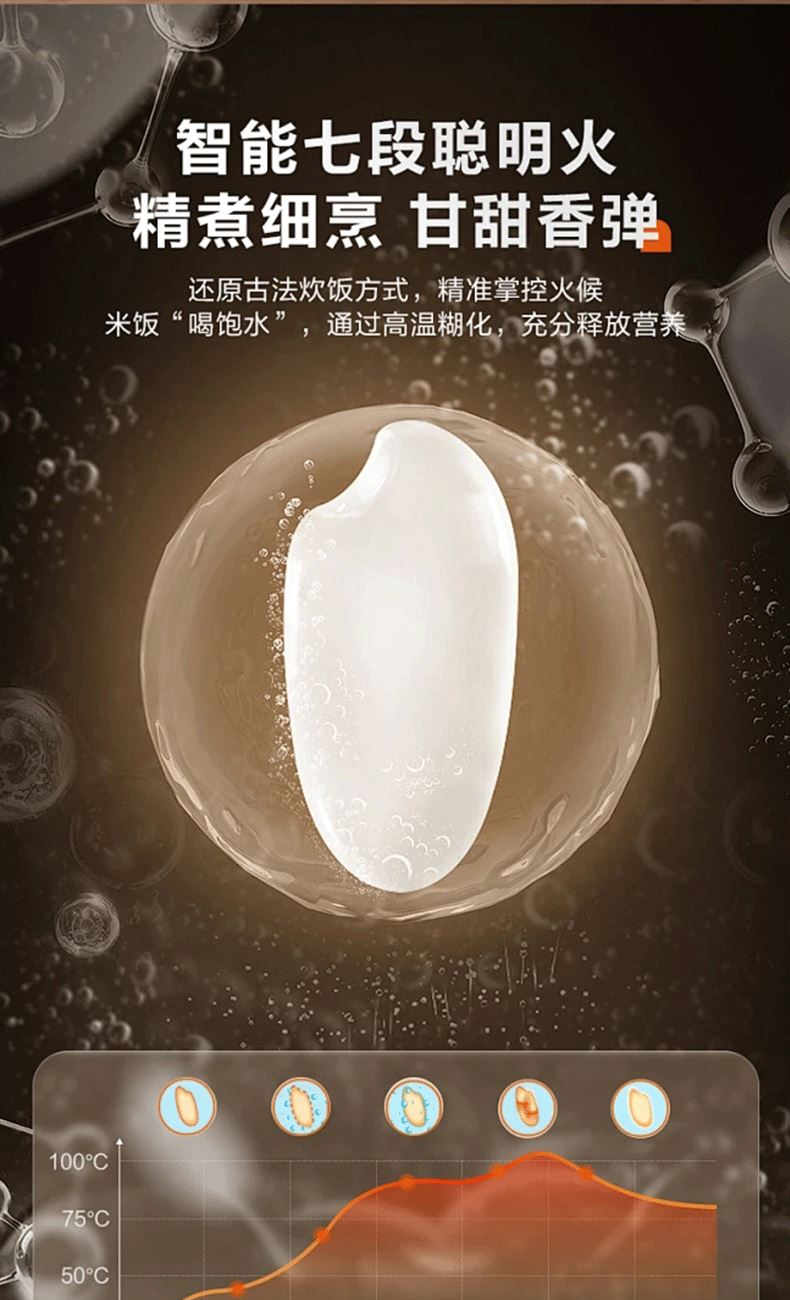 额定容量:5L 额定功率:1000W 内胆材质:钛+铝+钢 ※ 健康材料 -- 全新钛内胆 ※ 饭煲3.0时代 -- 0涂层 0重金属 0生锈 ※ 有效抑制细菌保鲜、保持食材原汁原味及安全健康 ※ 聚能技术科技 -- 80KPA高压高温聚能快速烹煮 ※ 软糯、标准、劲道三种口味选择 ※ 分体式上盖设计,一键泄压排压 ※ 智控程序 --十大预设菜单