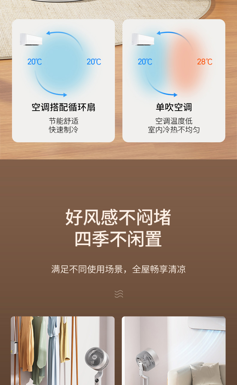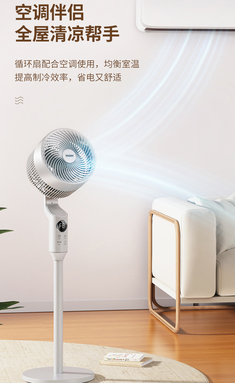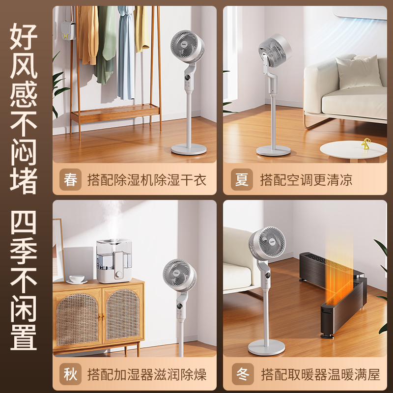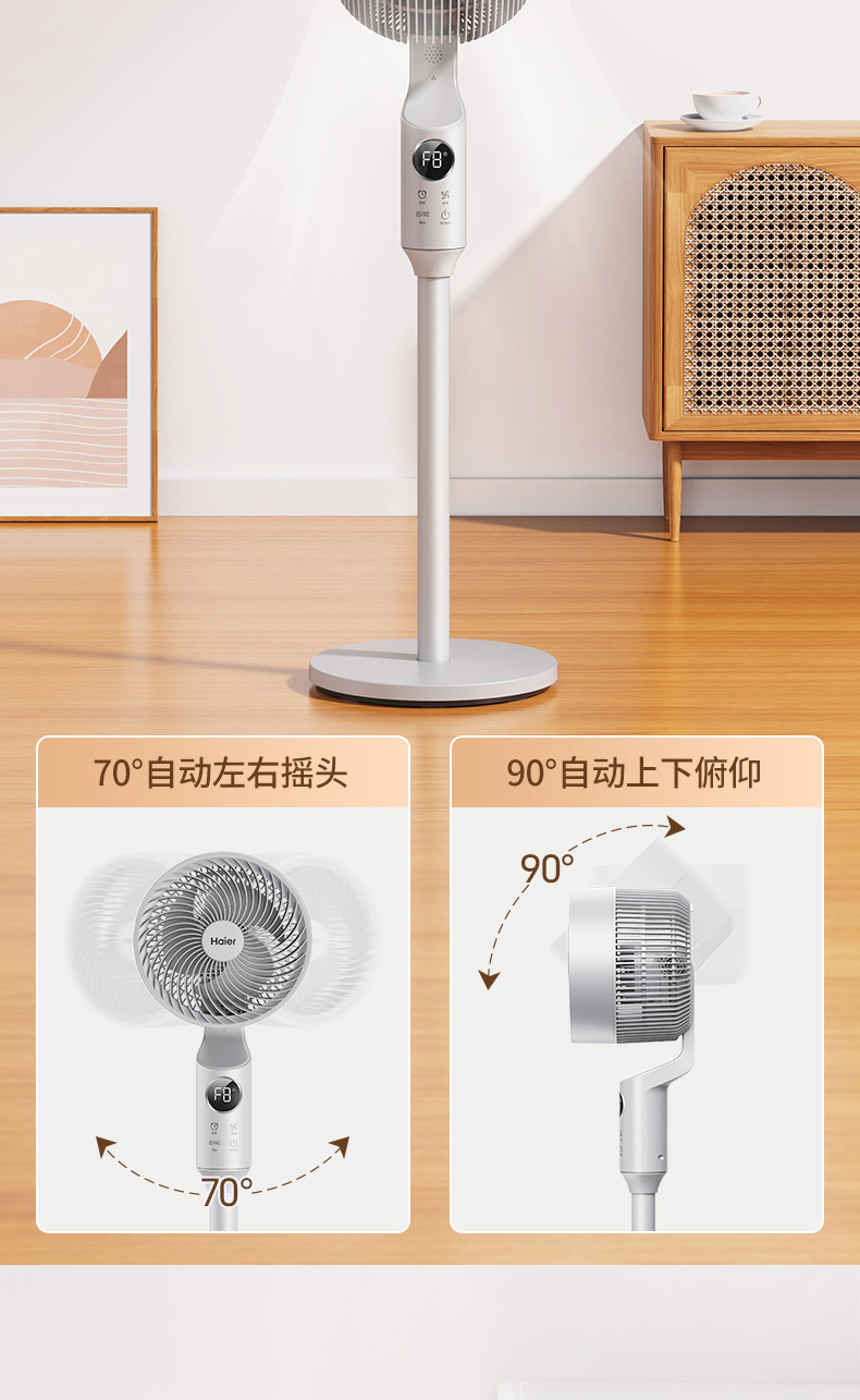 3D 立体循环送风:上下左右自动摇头,涡轮风道,12 米远距送风,快速全屋对流换气。 轻音低噪:运行安静(约 50dB),不扰睡眠,舒适柔风不直吹。 多档风速 + 定时:3/8 档风速(按版本), 12 小时定时,适配不同场景需求。 台地两用:可升降、可拆杆,落地 / 台式自由切换,客厅卧室书房通用。 节能安全:40W 低功率省电,过热保护,ABS 机身稳固耐用。