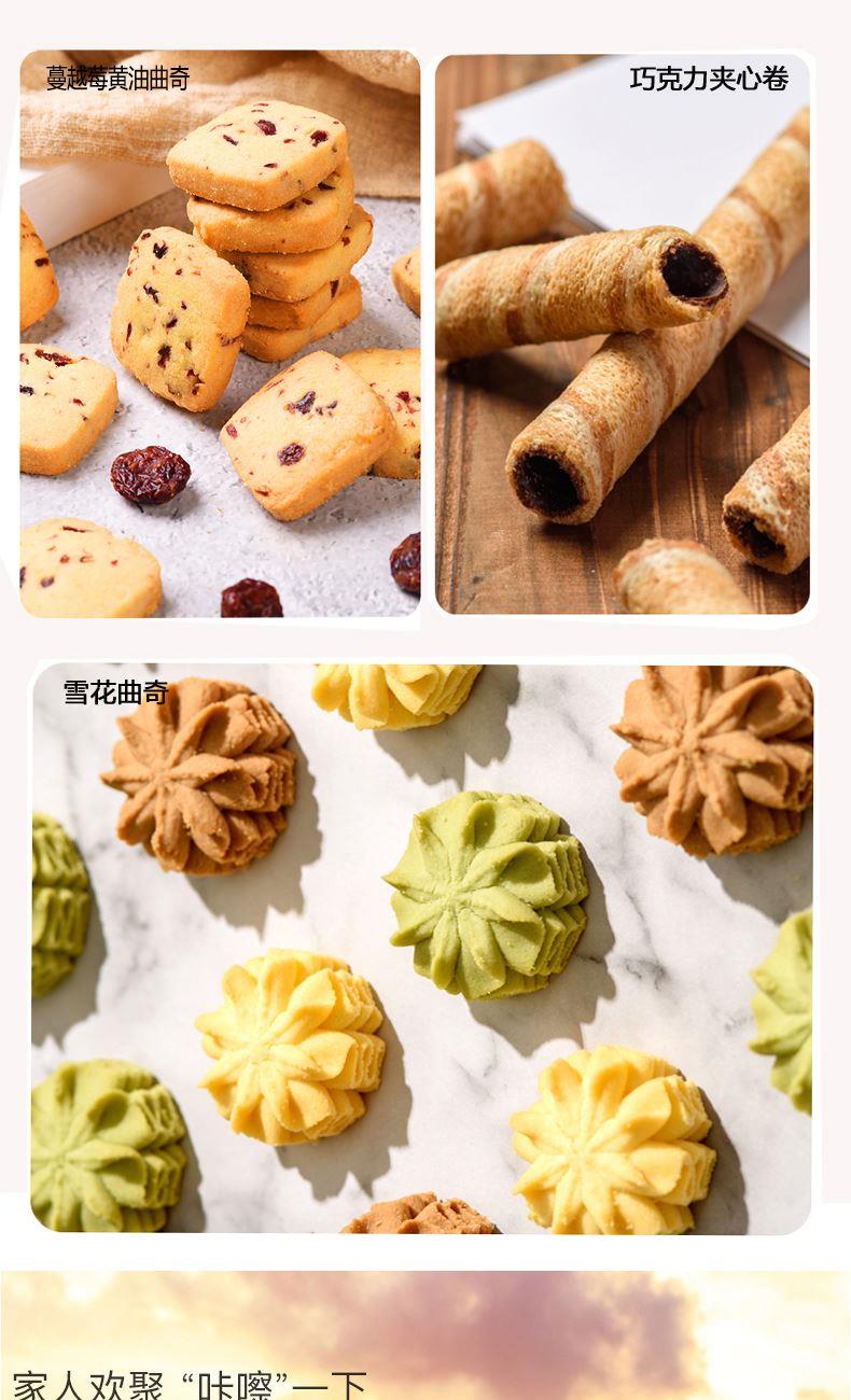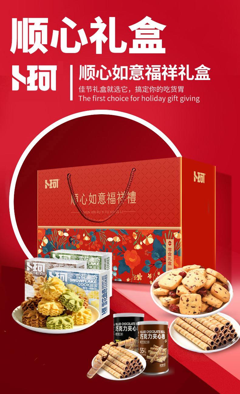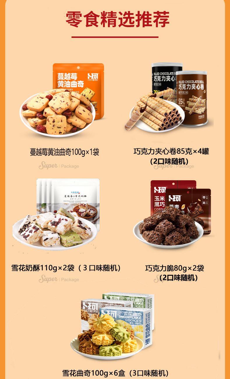克重:1420克 内配: 1、卜珂巧克力脆80g×2袋(2口味随机) 2、蔓越莓黄油曲奇100g×1袋 3、巧克力夹心卷(黑巧克力味)(榛子巧克力味)85g×4罐(2口味随机) 4、雪花奶酥110g×2袋(3口味随机) 5、雪花曲奇(黄油口味)(抹茶口味)(可可口味)100g×6盒(3口味随机) 礼盒规格:380*270*135mm 保质期:9月
