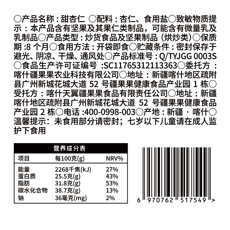 天山脚下3000小时黄金日照,颗颗杏仁吸饱纯净阳光,自然糖分凝结成酥脆香甜的味觉惊喜!轻咬一口,薄脆外衣包裹着奶香果仁,淡淡焦糖香与坚果醇香在舌尖共舞,不腻不涩,回味绵长,好吃到停不下手的魔力口感!低温烘烤工艺锁住营养,配料只有杏仁,让健康与怀旧甜蜜碰撞。撕开包装的瞬间,仿佛回到放学路上攥着零花钱买糖炒栗子的无忧时光,每一颗都是会讲故事的幸福果实。