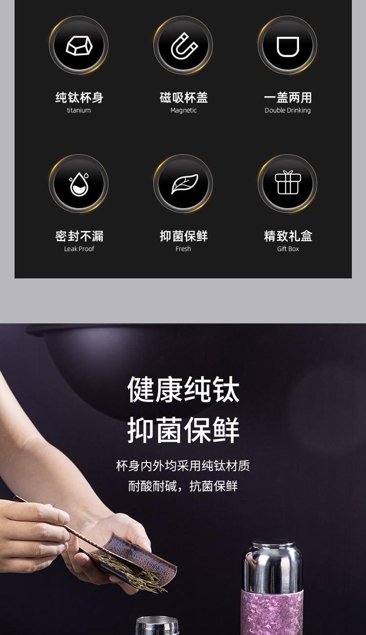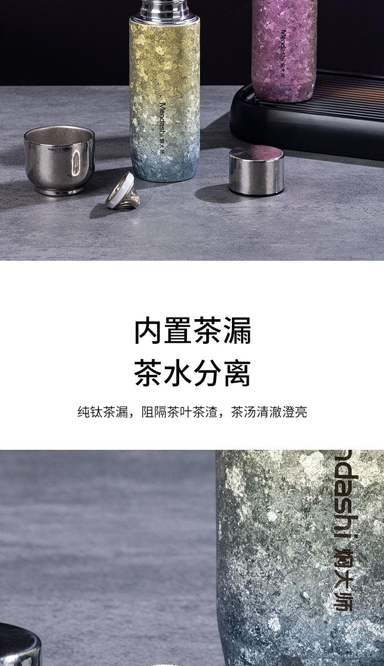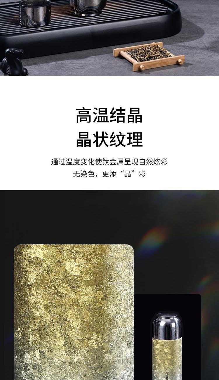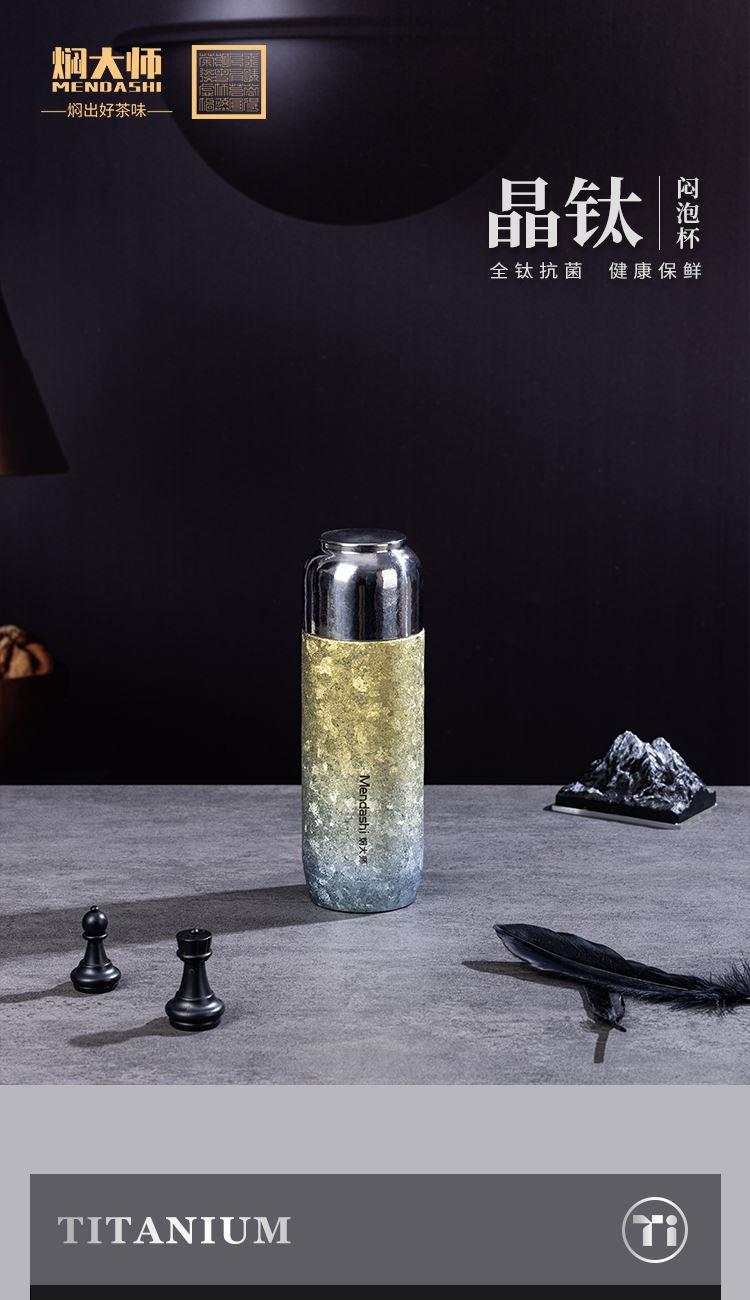 纯钛轻奢,品味之选 宝石肌理,手工打磨 内外纯钛,表里如一 磁吸瞬合,双盖锁鲜 外壳材质:纯钛(Titanium) 内胆材质:纯钛(Titanium) 茶漏材质:纯钛(Titanium) 塑 件:聚丙烯PP(食品接触用) 密 封 圈:食品接触用硅胶 保温效力:室温25℃条件下95℃满水容量测试12h≥45℃ 配 置:内外纯钛闷泡杯+纯钛茶漏 产品尺寸:213mm高*62mm底径 包装尺寸:275*180*96mm