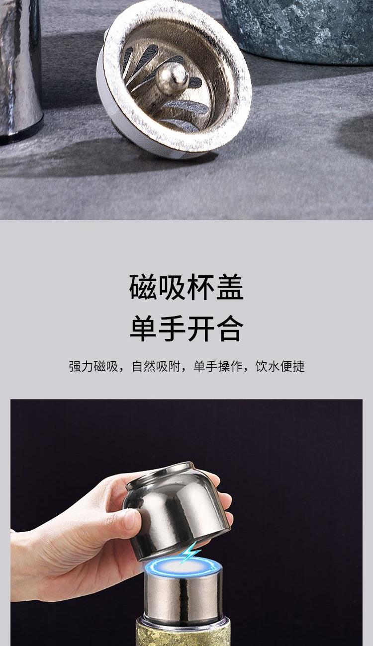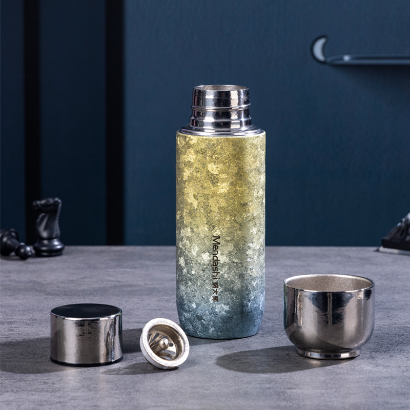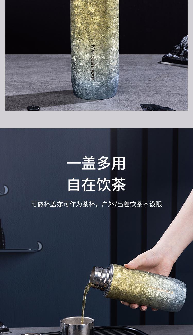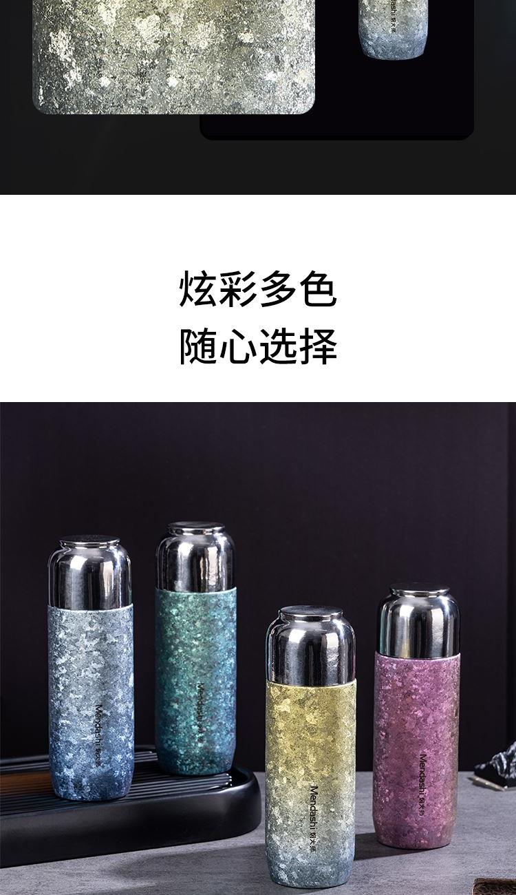 纯钛轻奢,品味之选 宝石肌理,手工打磨 内外纯钛,表里如一 磁吸瞬合,双盖锁鲜 外壳材质:纯钛(Titanium) 内胆材质:纯钛(Titanium) 茶漏材质:纯钛(Titanium) 塑 件:聚丙烯PP(食品接触用) 密 封 圈:食品接触用硅胶 保温效力:室温25℃条件下95℃满水容量测试12h≥45℃ 配 置:内外纯钛闷泡杯+纯钛茶漏 产品尺寸:213mm高*62mm底径 包装尺寸:275*180*96mm