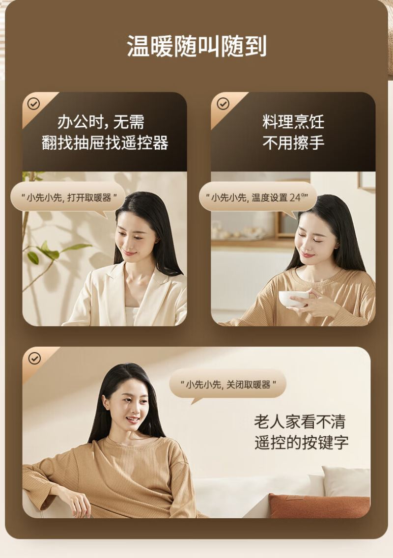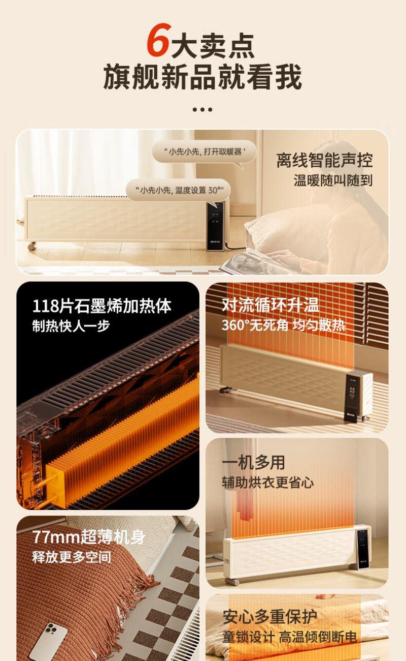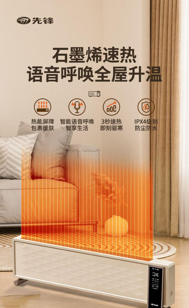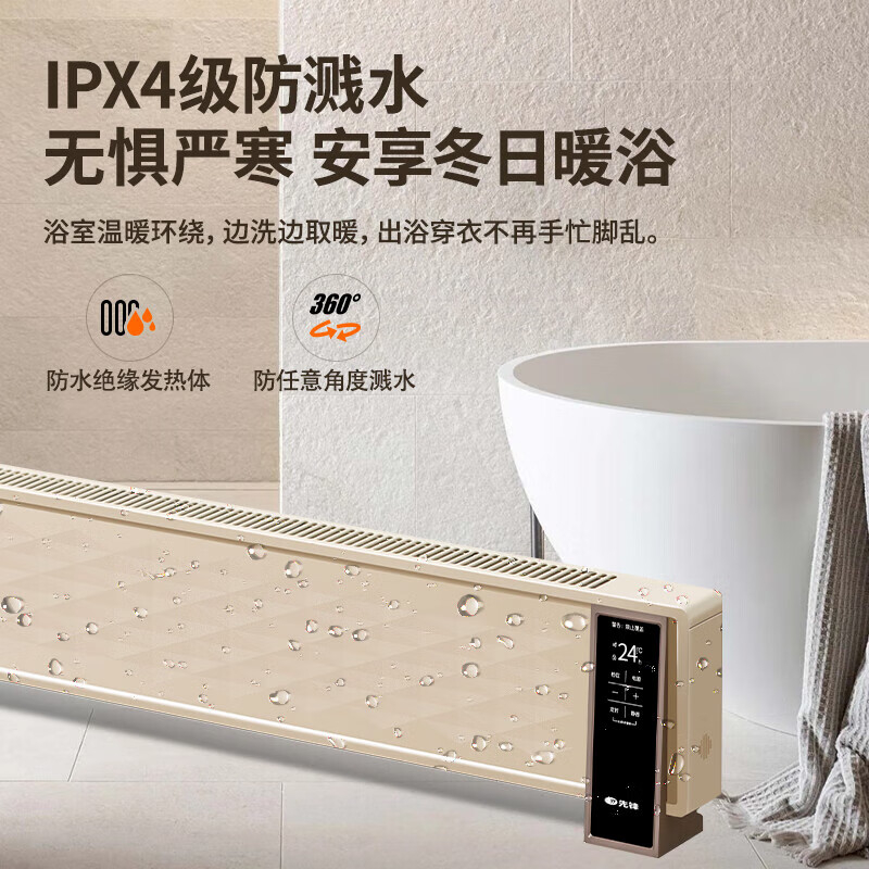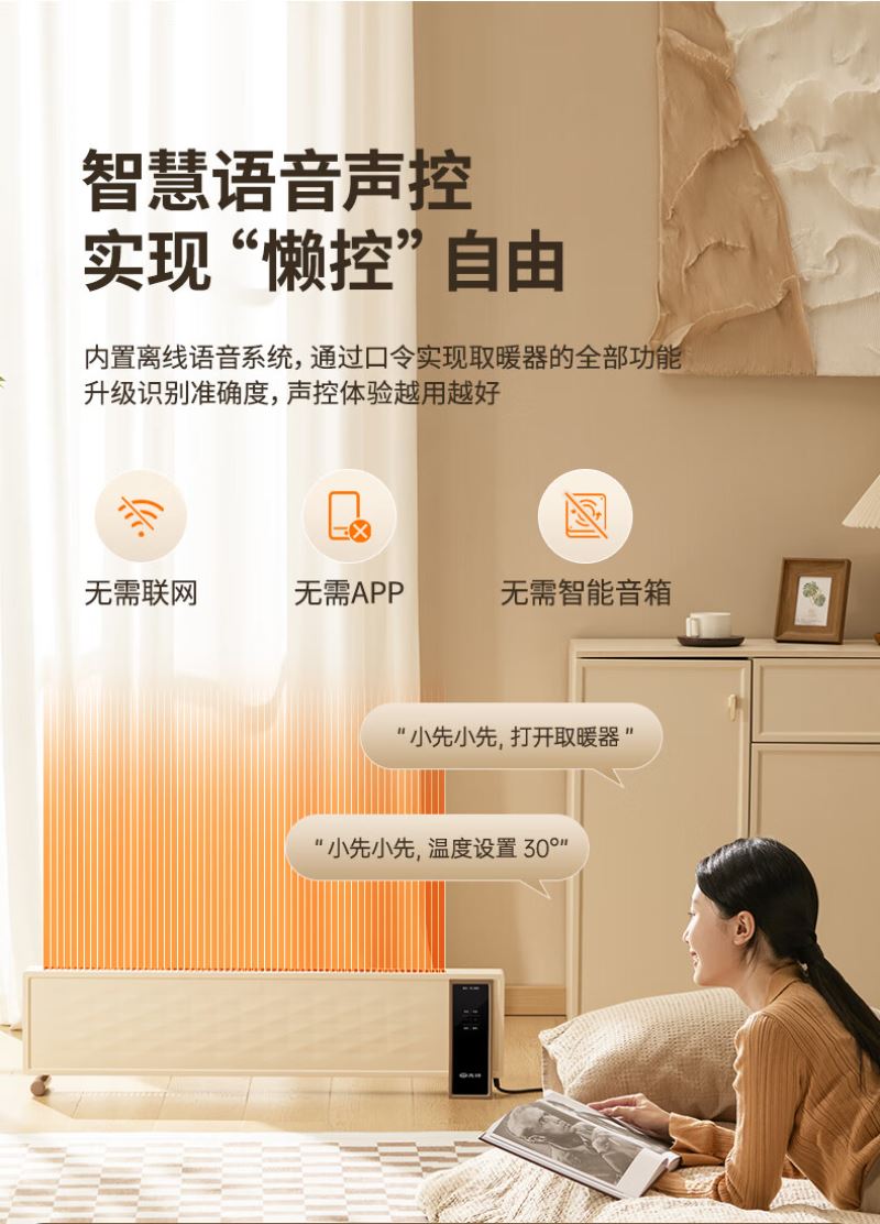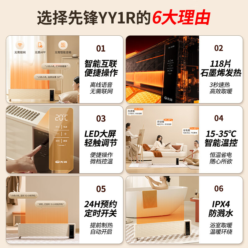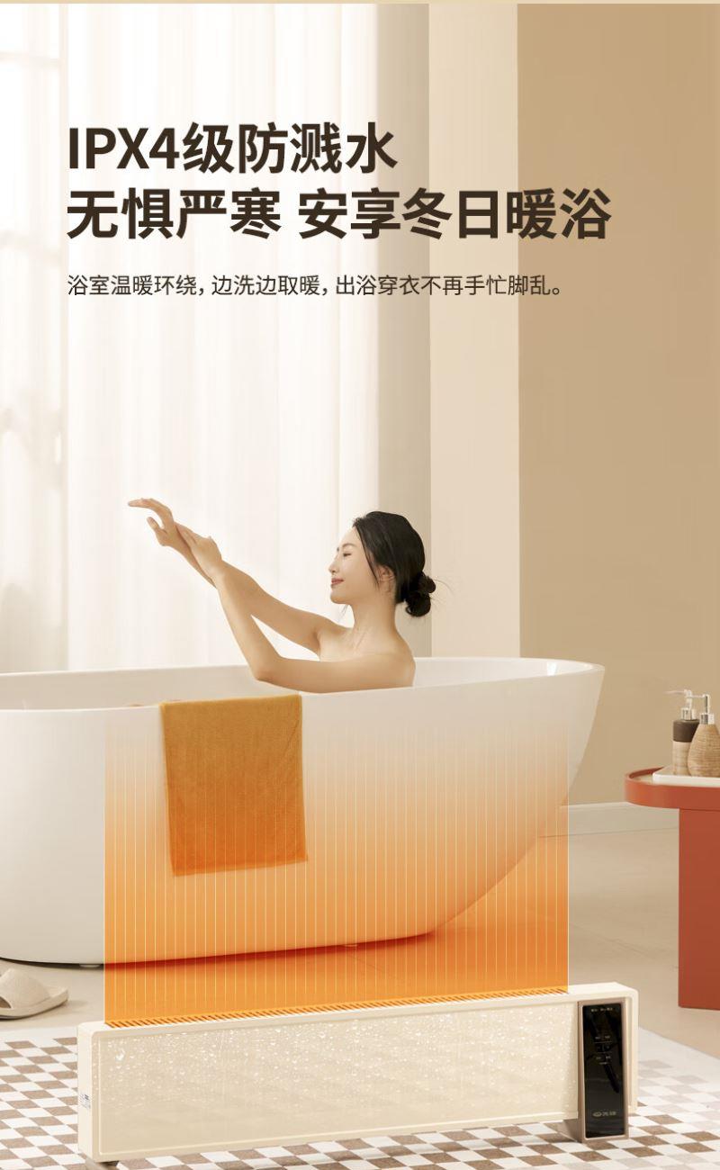 智能互联便捷操作,离线语音无需联网,118H石墨烯发热,3秒速热高效取暖,LED大屏轻触调节 便捷操作微档控温,15-35℃智能温控,恒温省电随心所欲,24H预约定时开关,提前制热自动开后,IPX4防溅水,浴室取暖温暖环绕。