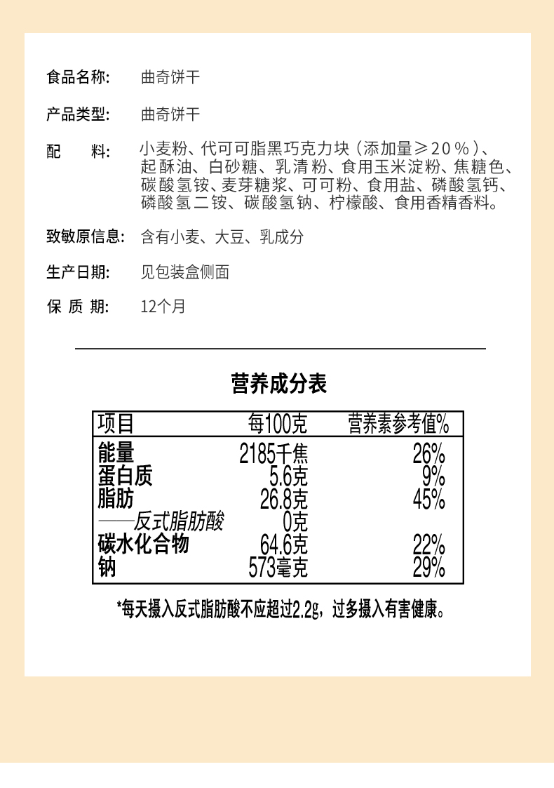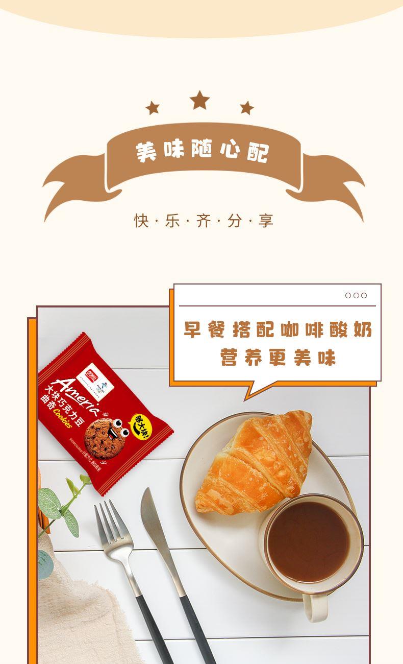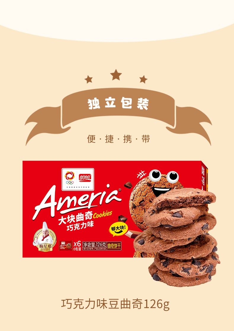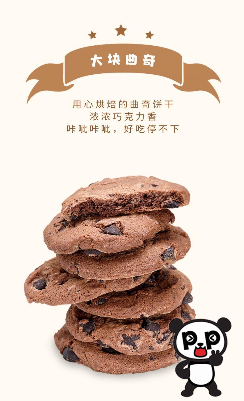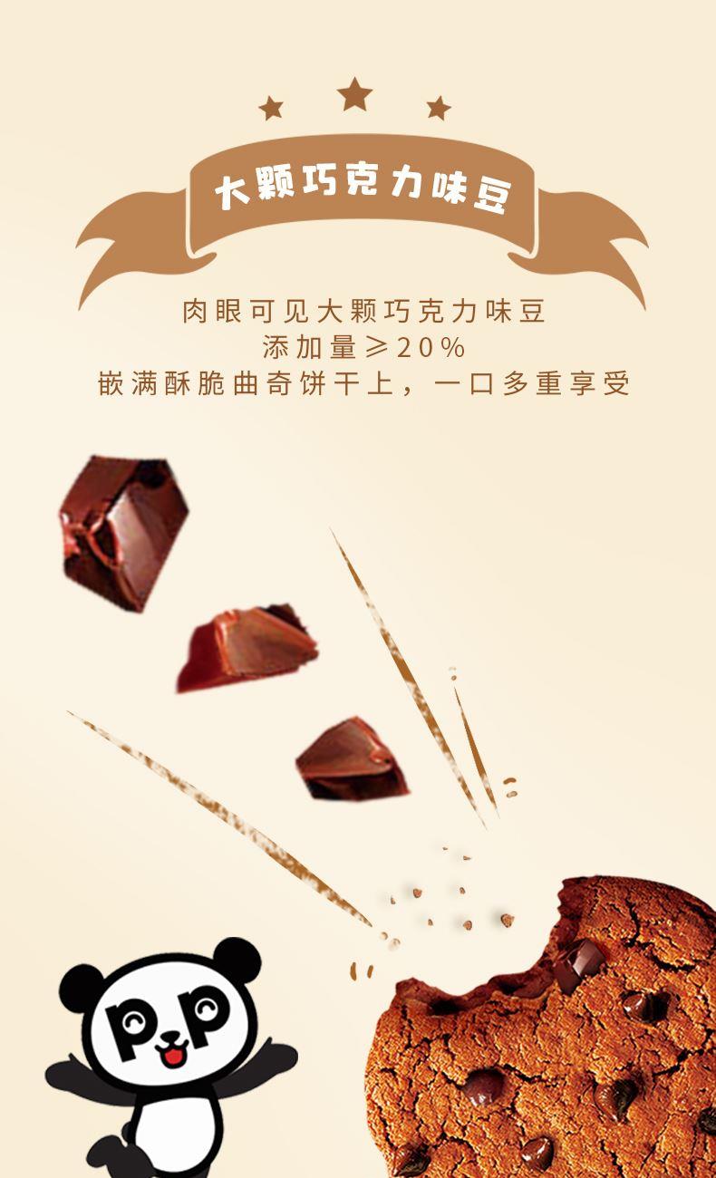 规格:126g 口味:巧克力味 盼盼大块巧克力曲奇126g,每一口都超满足!巧克力豆添加量≥20%,精选耐高温巧克力豆,香醇浓郁。进口可可粉搭配进口乳清粉,四区控温烘焙,酥脆掉渣。0反式脂肪酸,独立小包装,开吃,分享、解馋都超合适 。