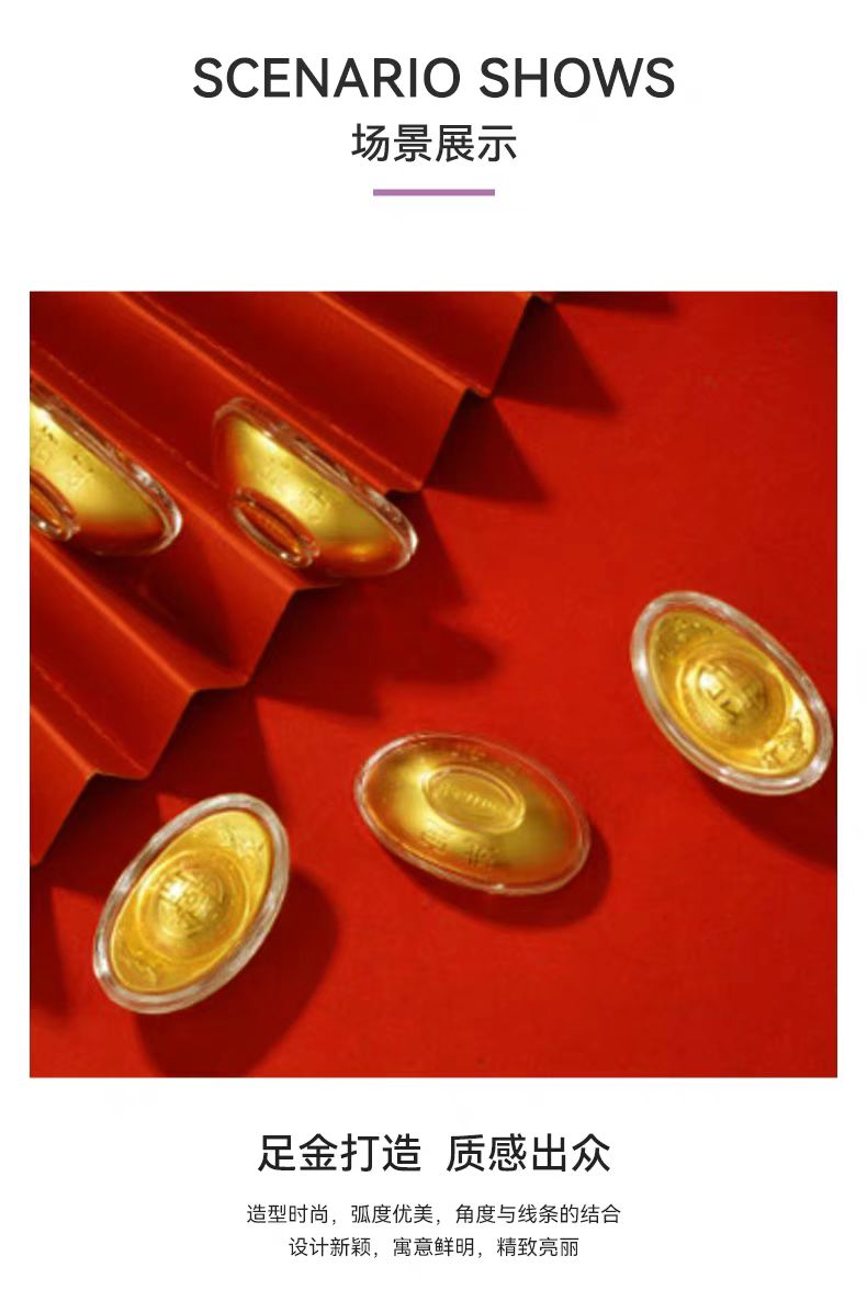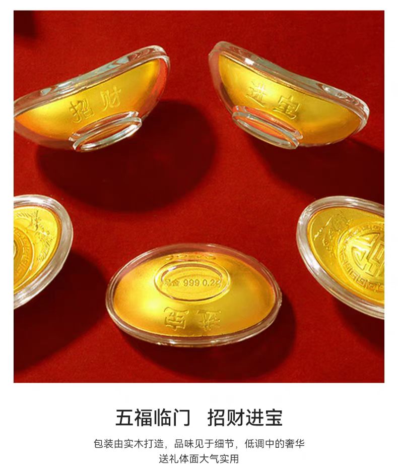 产品配置: 克重:999足金 1g ①0.2g金元宝×5个 ②检测证书×1份 ③精致礼盒×1个 送礼收藏佳品 五福临门,招财进宝 象征着金钱与财富,寓意财源广进,送人收藏都可。 五福临门 招财进宝 包装由实木打造,品味见于细节,低调中的奢华 送礼体面大气实用 足金打造 质感出众 造型时尚,弧度优美,角度与线条的结合 设计新颖,寓意鲜明,精致亮丽 金价实时波动,具体以下单为准