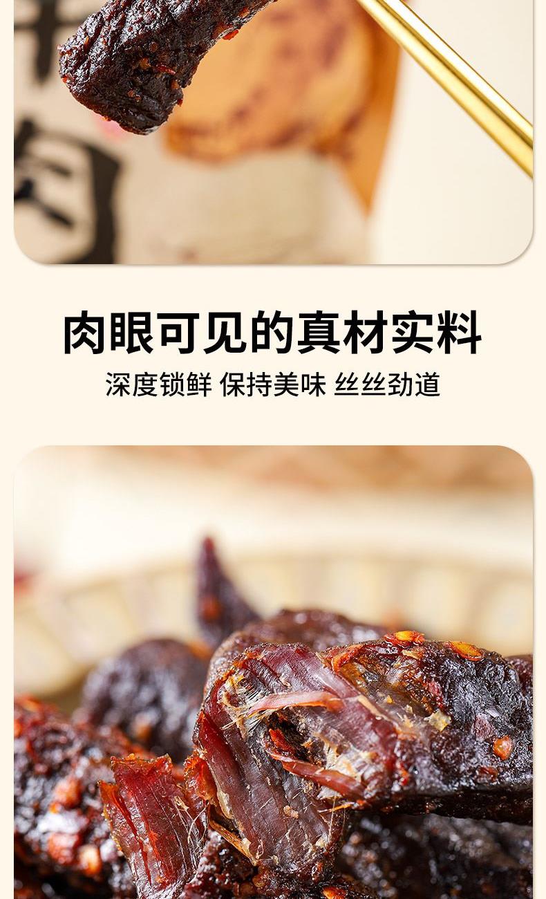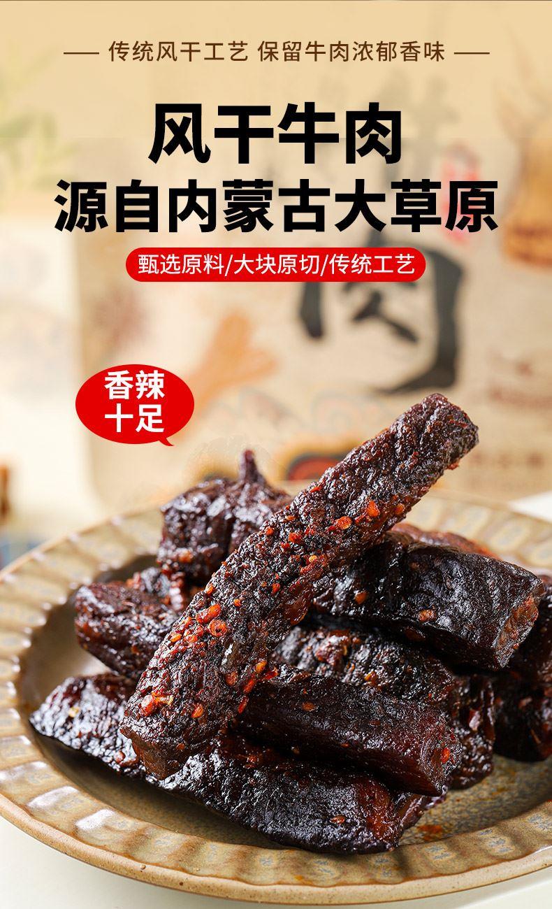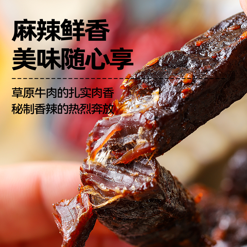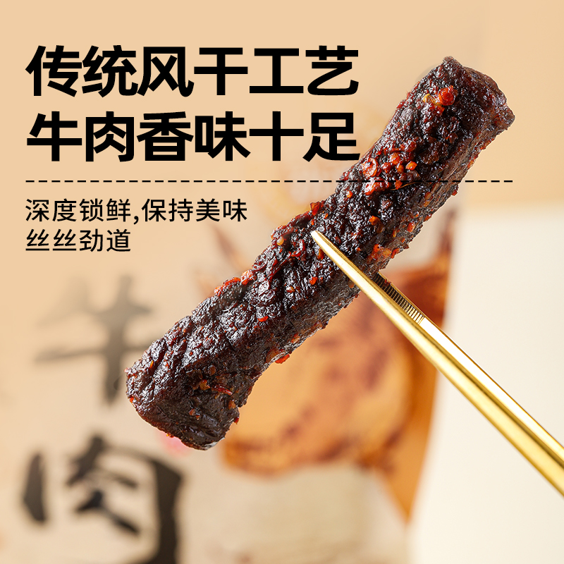 甄选原料,大块原切,麻辣鲜香,嚼劲十足;传统风干工艺,保留牛肉浓郁香味