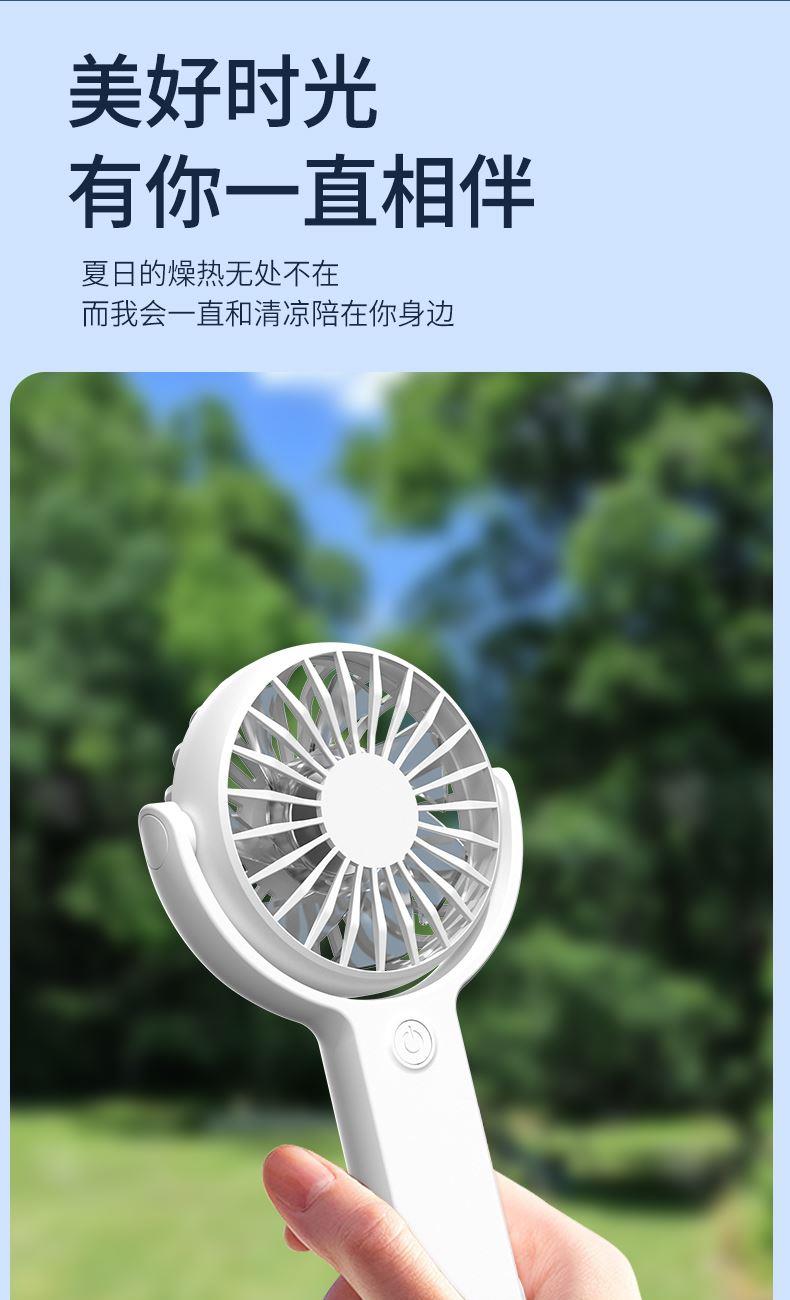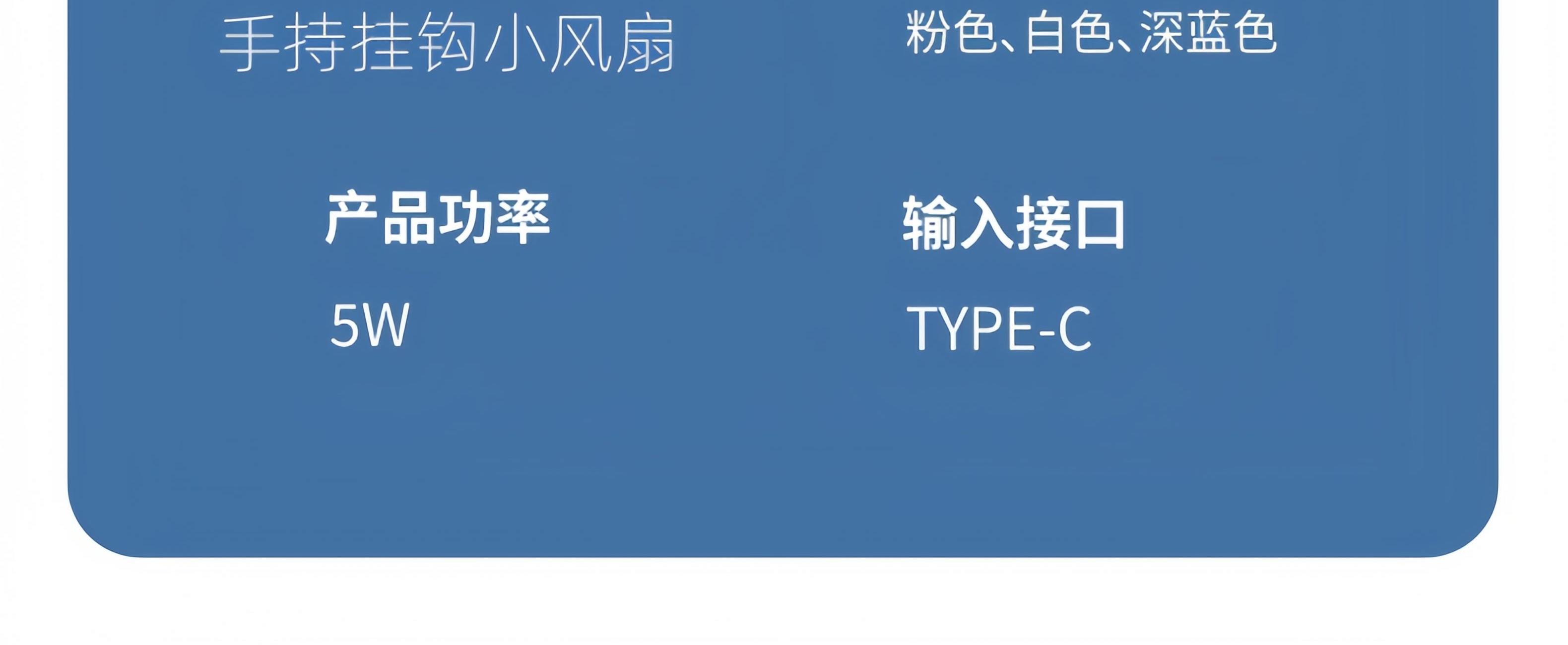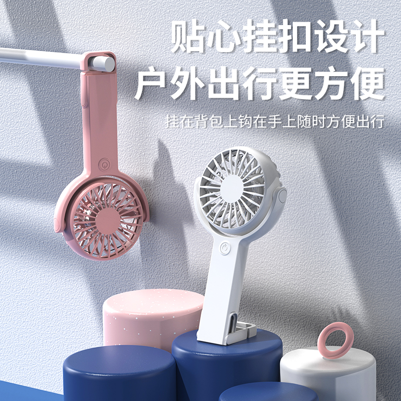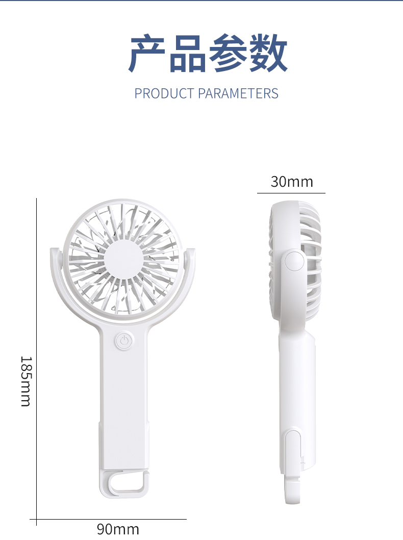 产品材质:ABS 产品功能:5档风力调节 产品容量:1200mAh 产品尺寸:115*30*82mm 产品颜色:白色,粉色,蓝色 条形码:6976935890822 产品卖点:升级亲肤挂钩设计,挂在背包上,钩在手上,清新自然的风一路相随。隐藏式支架,放桌面,办公,也是稳稳的;迷你小巧,方便携带。扇面可以180度旋转,轻松享受风的自由。5档风力,随心选择。